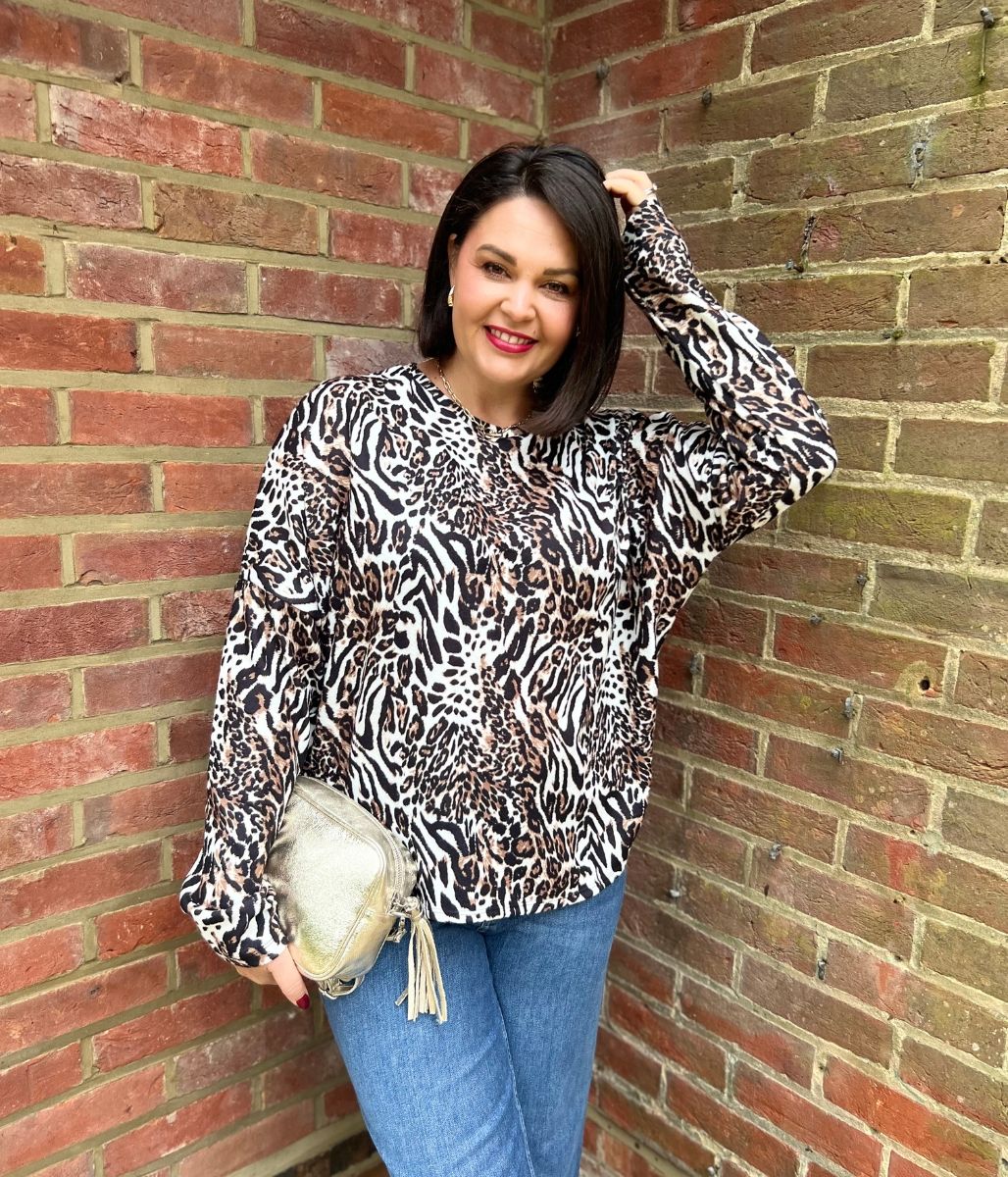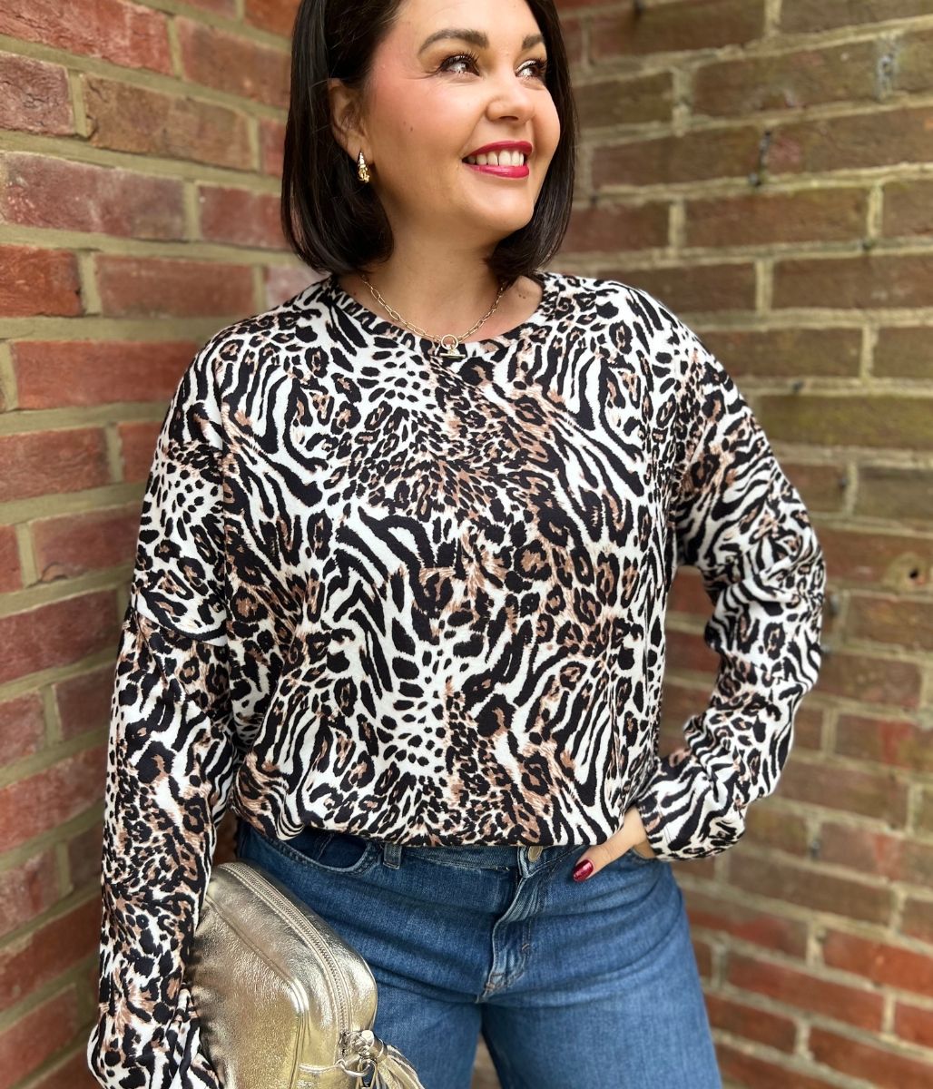 Crafted from a unique printed fabric with a soft jersey touch feel, this top features a stylish batwing silhouette that is both comfortable and chic. Finished with a curved hem and side vents. Pair with jeans and ankle boots for an effortlessly trendy look that will take you from day to night in style!