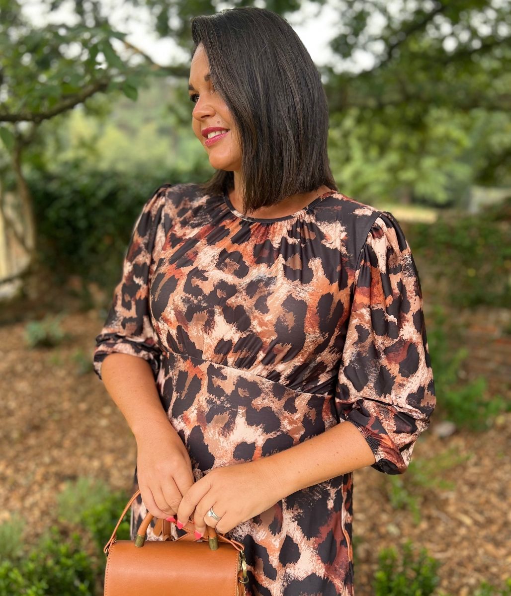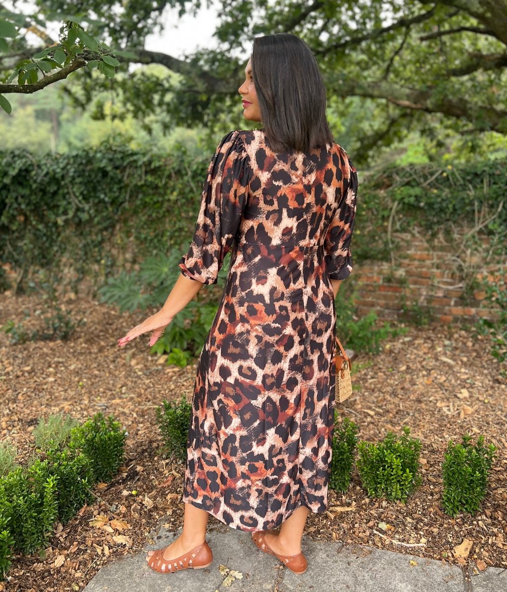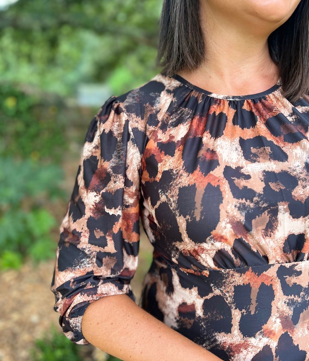 Add a touch of wild to your wardrobe with this animal print midi dress. Crafted from a comfortable stretch jersey fabric, this dress features a classic round neckline and 3/4 sleeves, finishing elegantly at midi length. The gathered waist style ensures a flattering fit that enhances your curves beautifully. Pair with your favourite winter boots, tights, and coat for a fierce and stylish Autumn look!