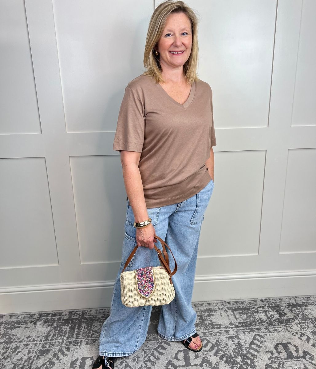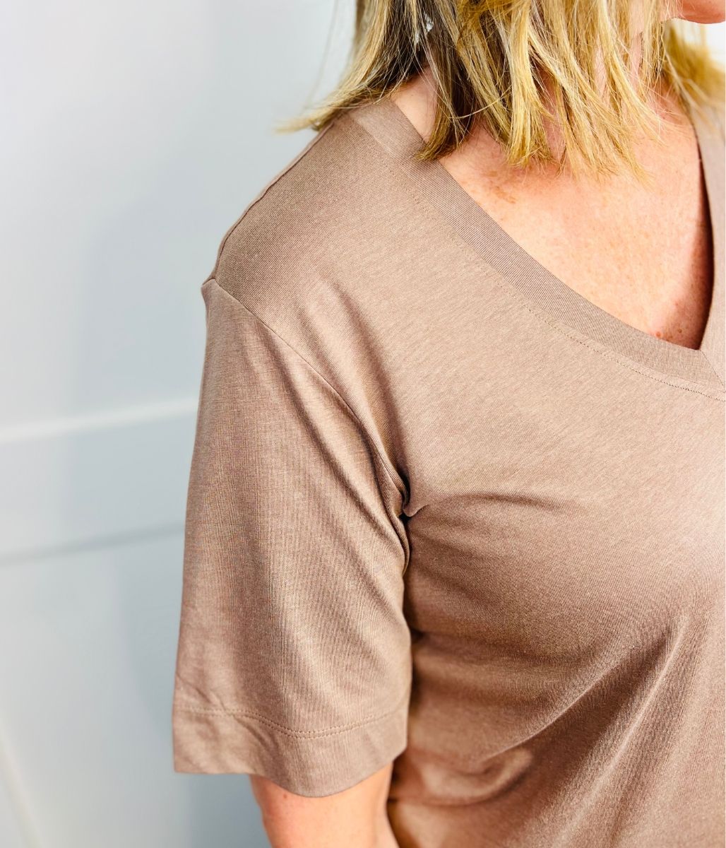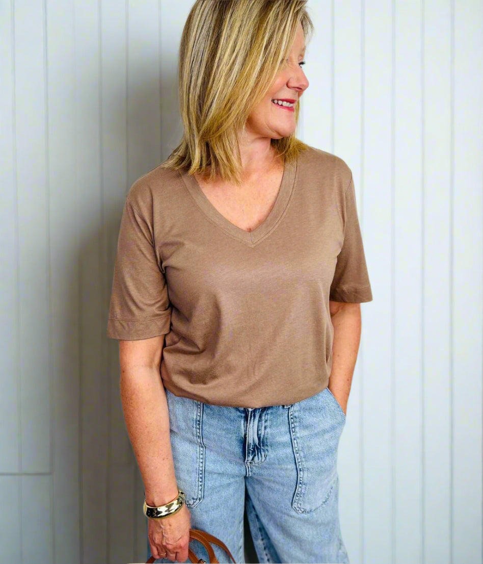 Our slouch V-neck t-shirt is crafted from a soft handle cotton modal blend, creating a flattering drapey shape. The lined v-neck adds premium detailing to the overall look. Ultra soft and comfortable, this will be your new go to.
