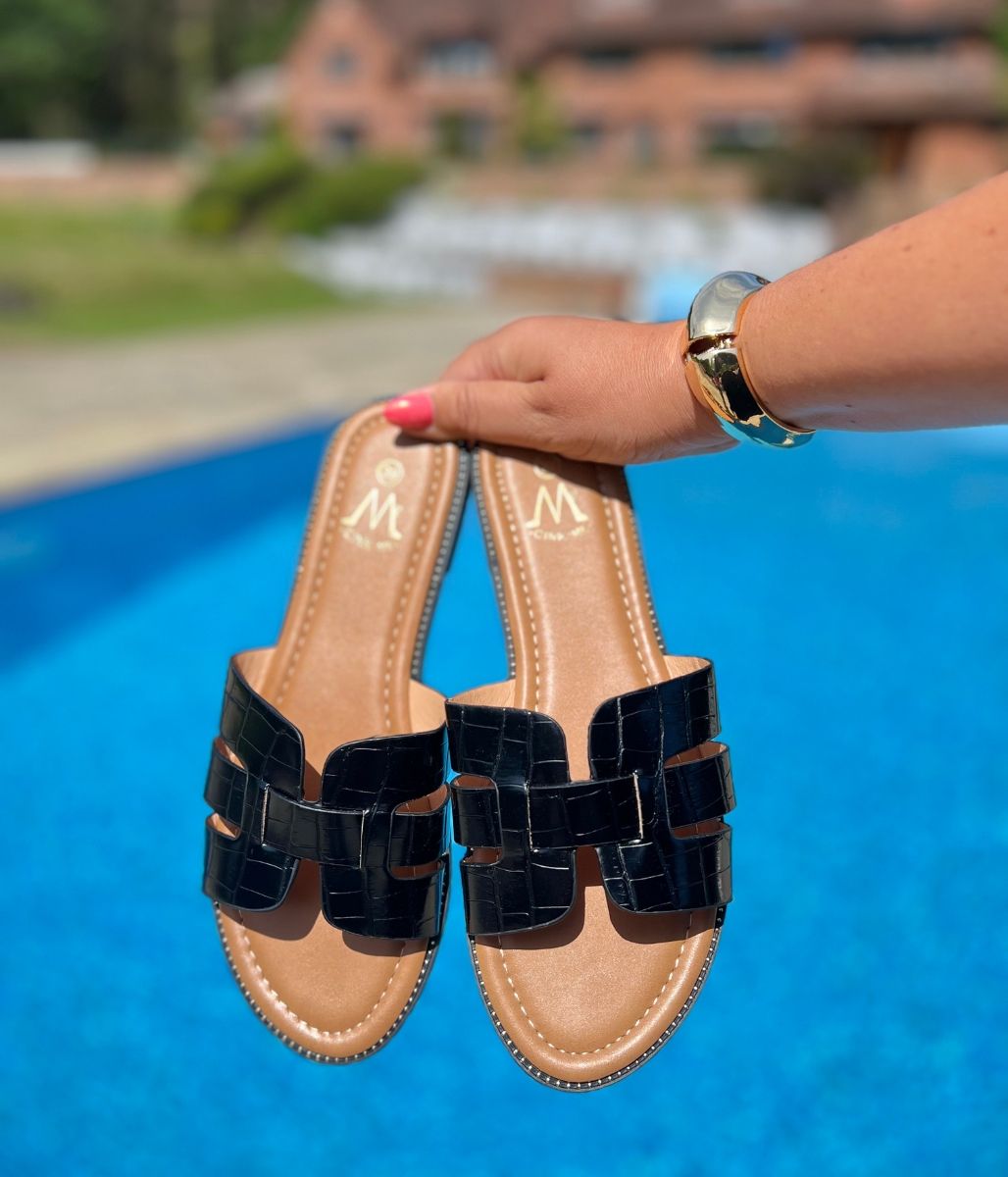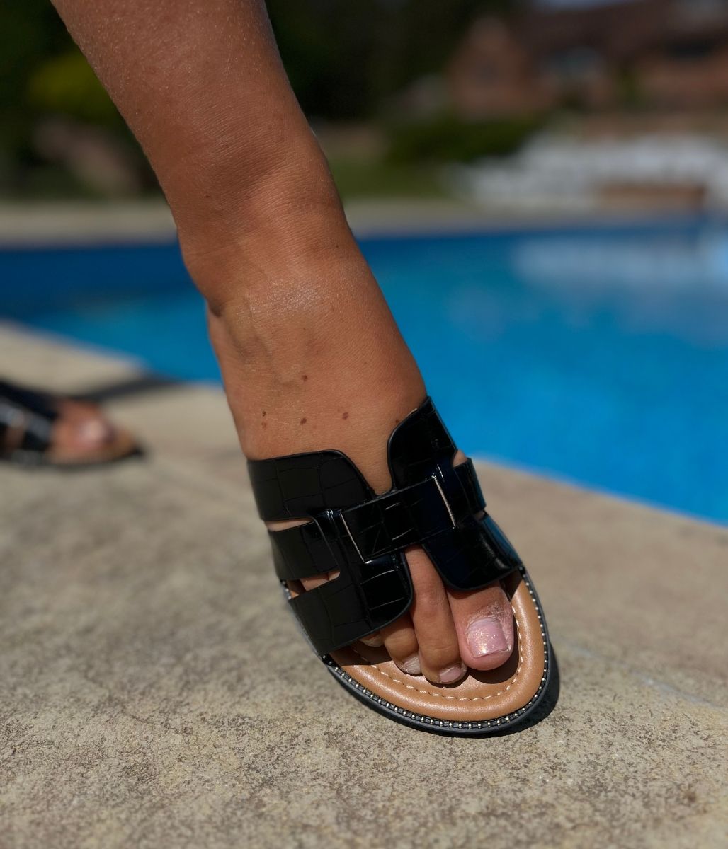 Step out in style this summer. This classic slip-on style is perfect for everyday wear and makes a great addition to your holiday wardrobe. Crafted from faux leather with a cut out strap design, this style will compliment any outfit
