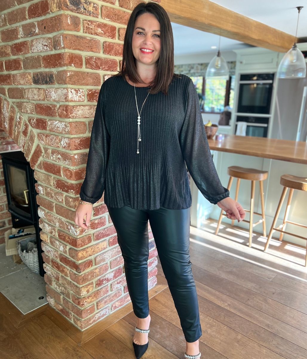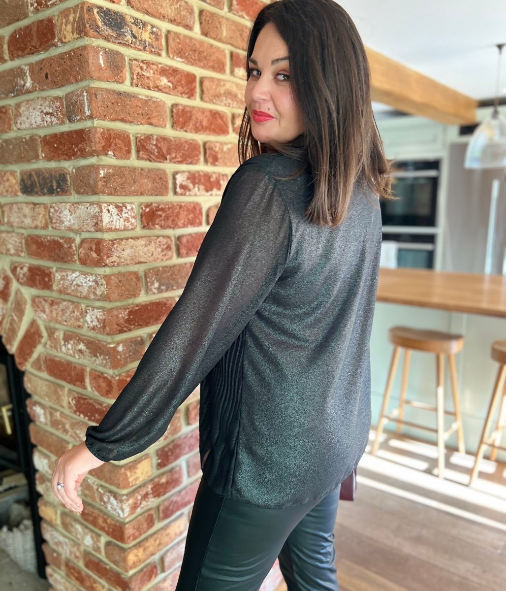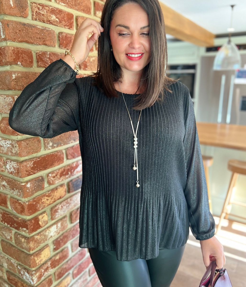 From our Italian collection and cut from a pleated front fabric this piece features a round neckline and full length, sheer sleeves with elasticated cuffs. It’s adorned in a striking, metallic glitter design and comes complete with a matching necklace. A soft jersey under provides extra comfort. A flattering style that is perfect for parties and evenings out.