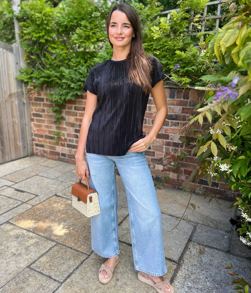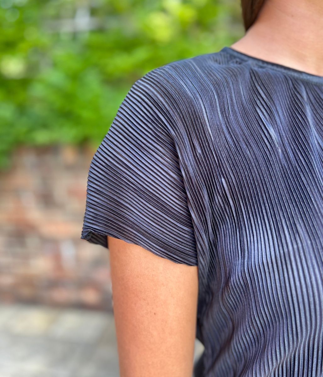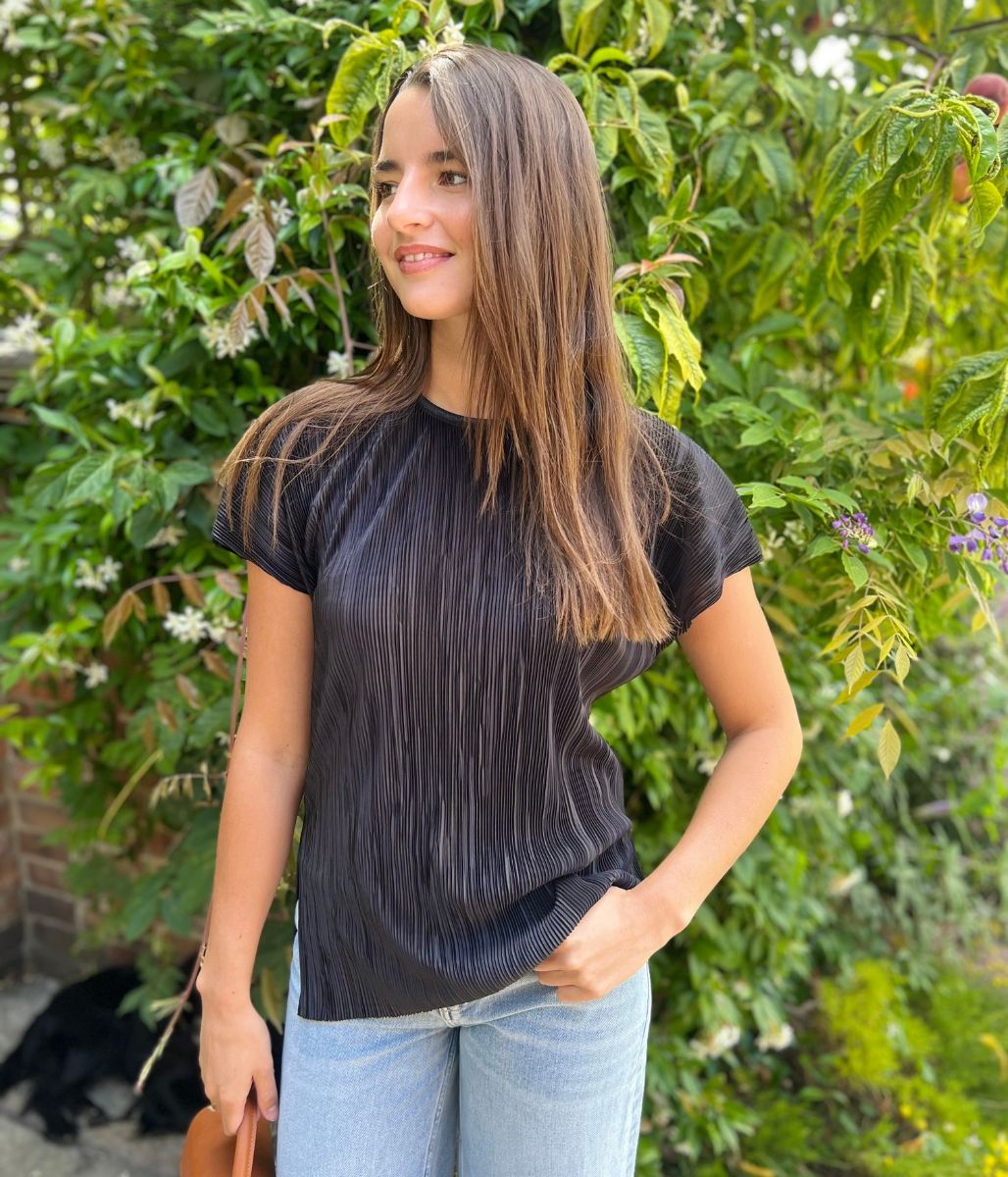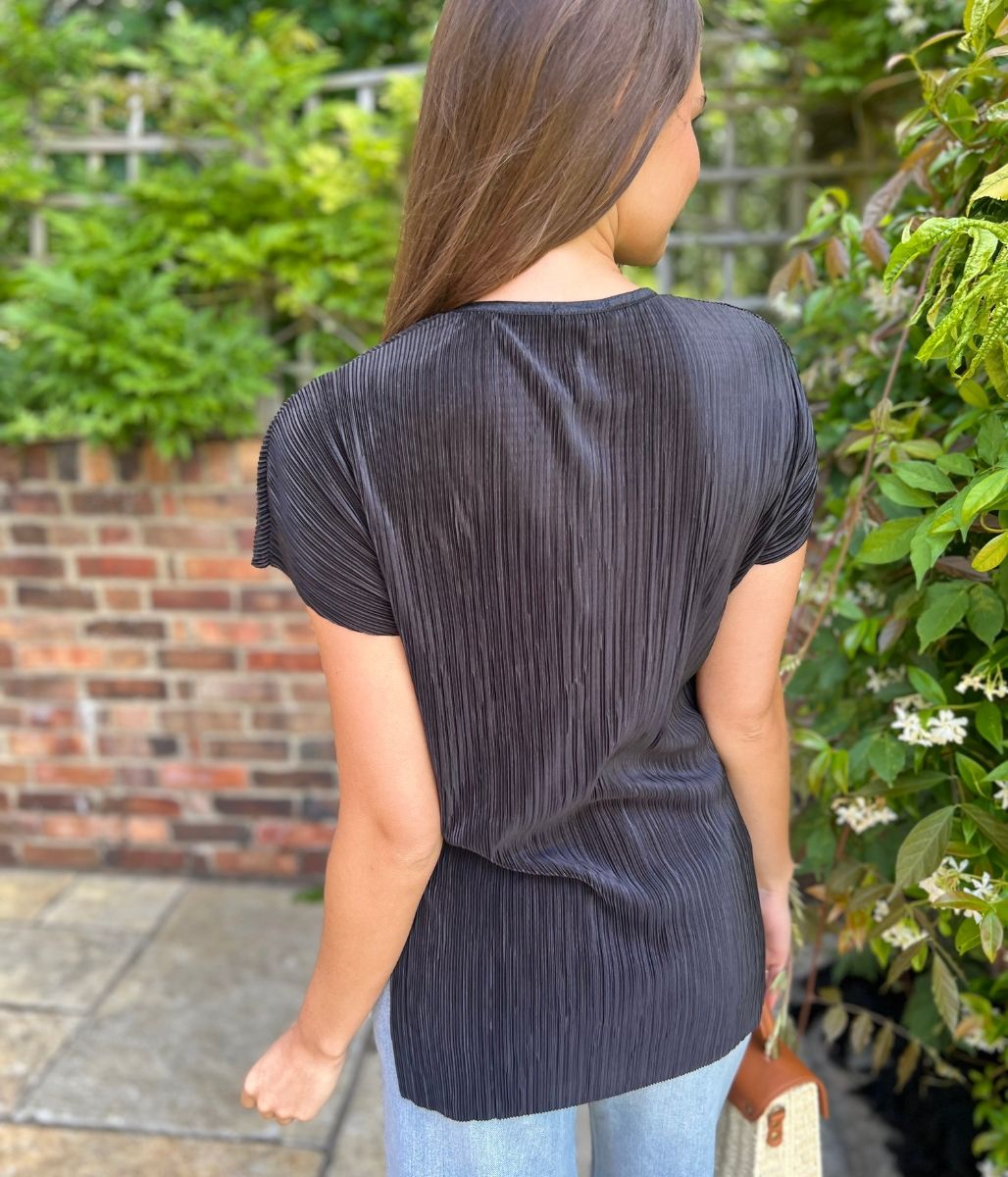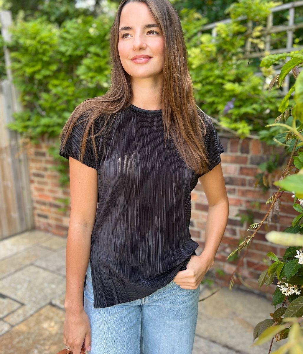 This black longline plisse top features a flattering round neck and short sleeves. A comfortable and easy to wear style finished with side vents. Simply pair with jeans or a skirt for dressing up or down.