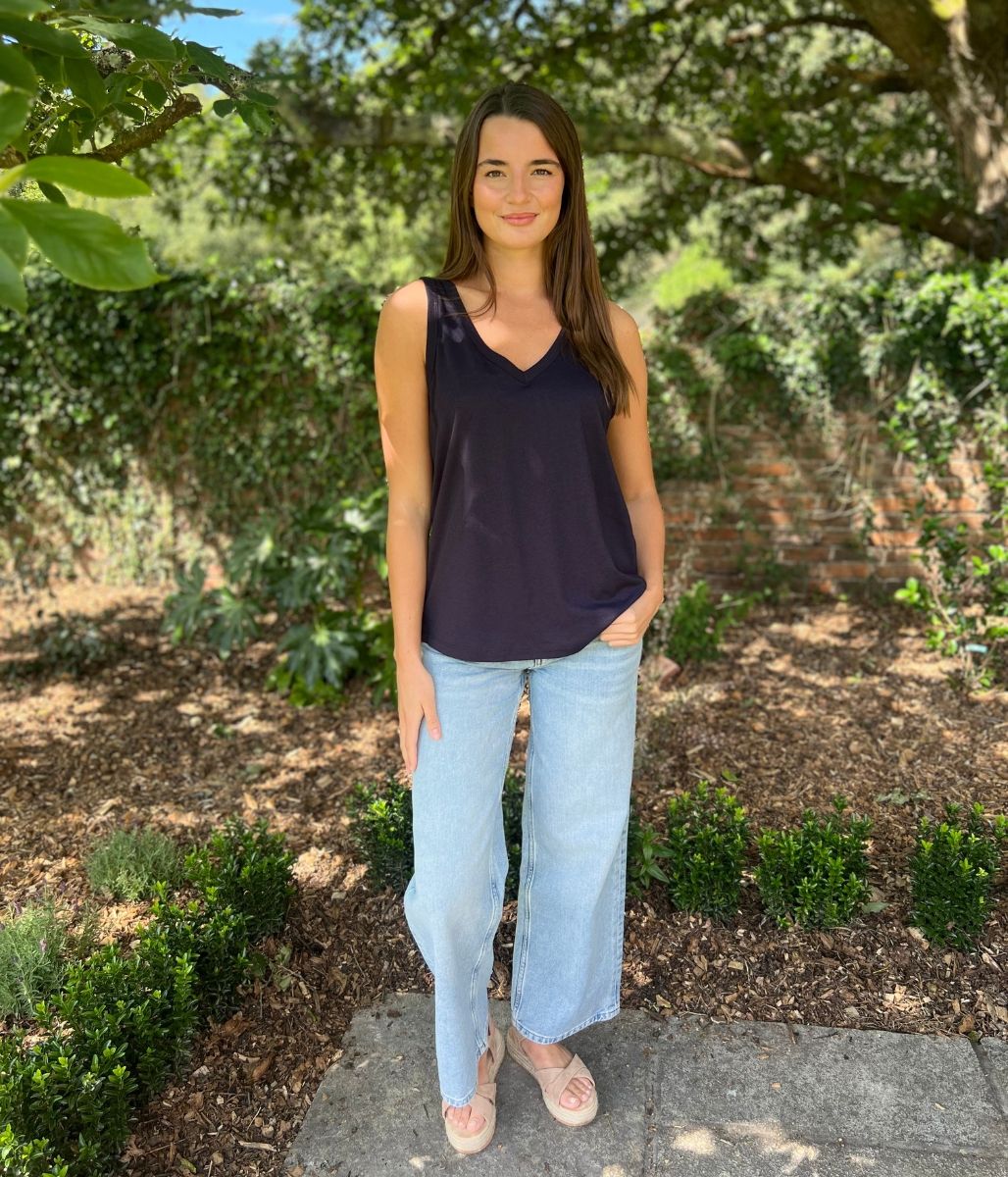 This slouch V neck vest is crafted from a soft handle cotton modal blend, creating a flattering draped shape. The lined v-neck adds premium detailing to the overall look. Ultra soft and comfortable, this will be your new summer essential.