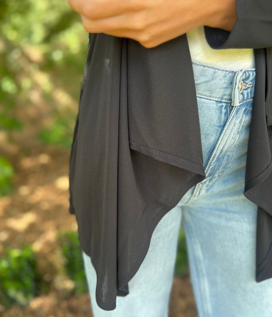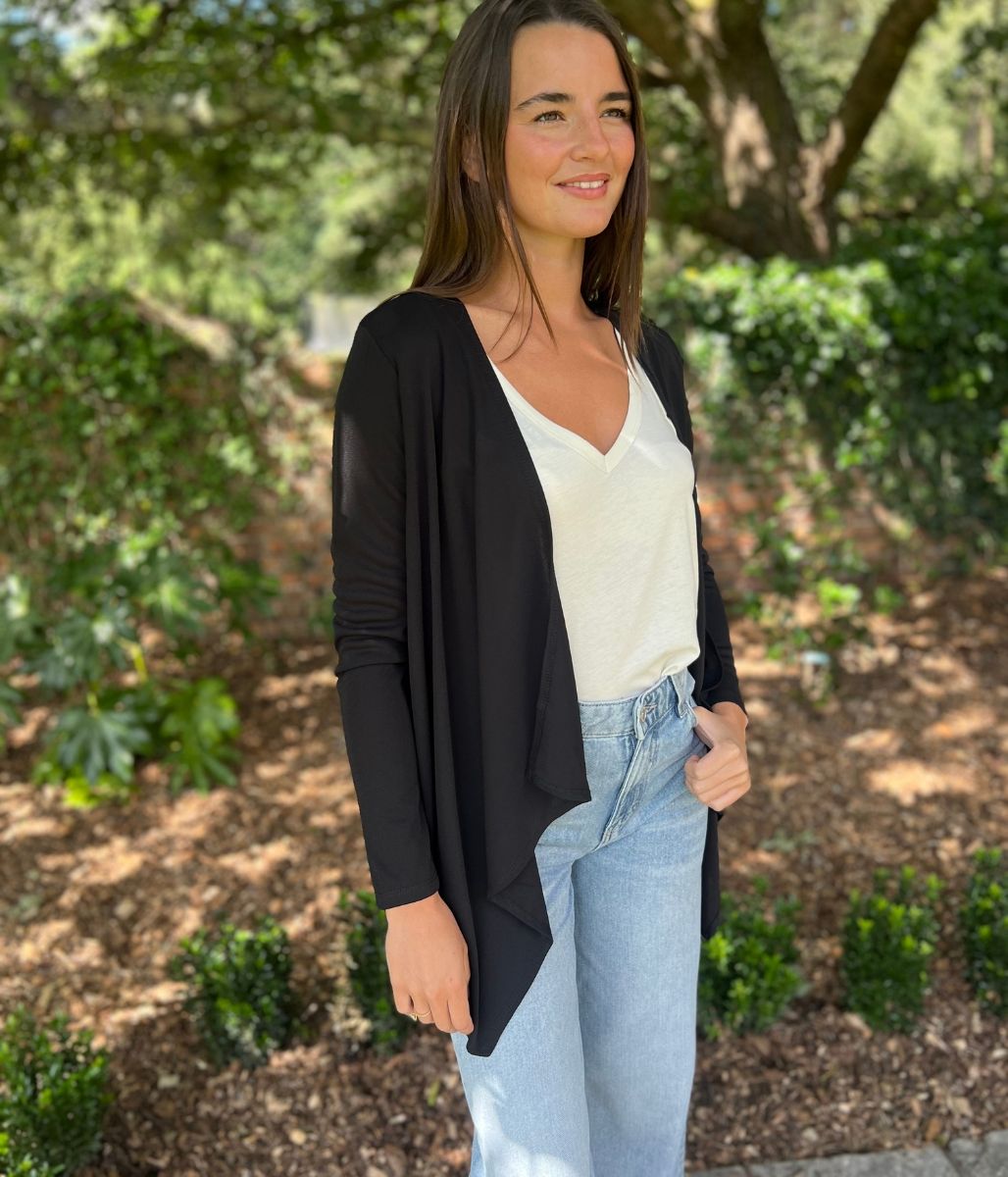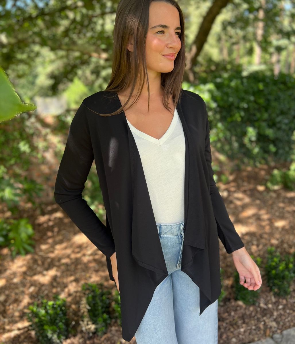 A wardrobe staple, this versatile piece is great to layer over any outfit all year round. This lightweight top boasts full length sleeves and a comfortable mid length silhouette. Featuring an open front that falls to flatter the figure, keep it casual or dress it up for an evening out.