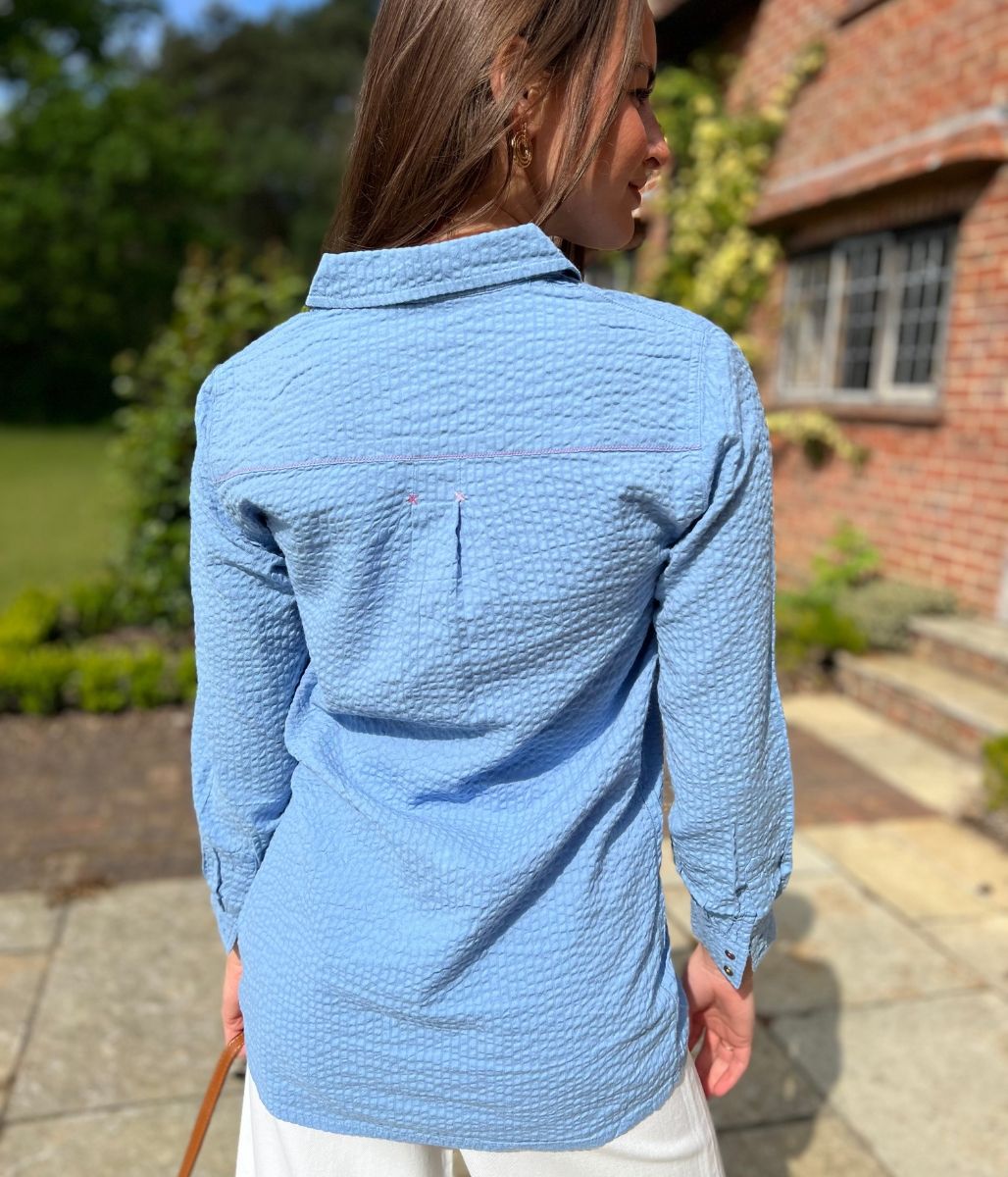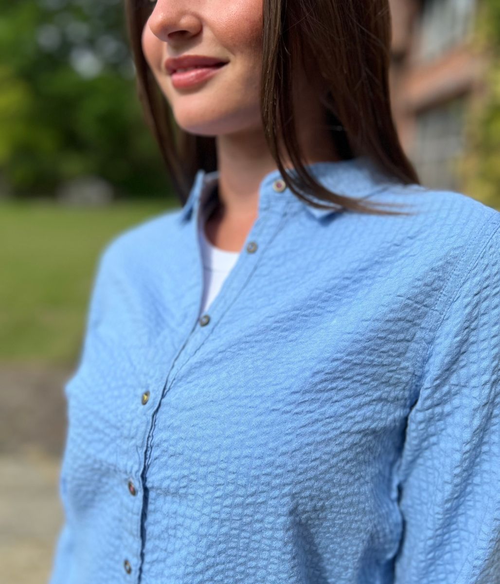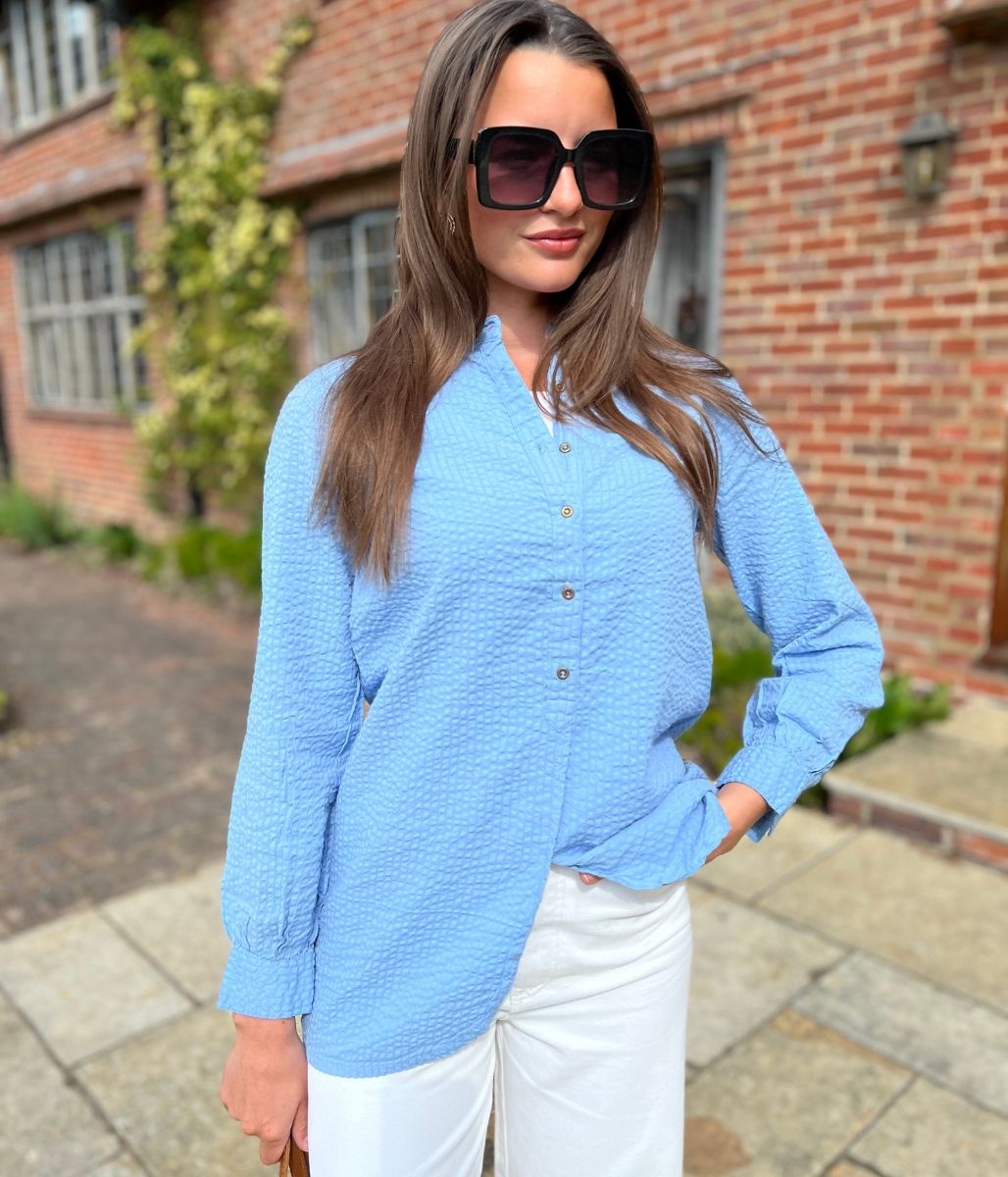 We go to long lengths to keep you feeling comfy and stylish. Literally. A longline tunic with shirt detailing, this popover style top is crafted from a soft seersucker material with a button placket and long sleeves.