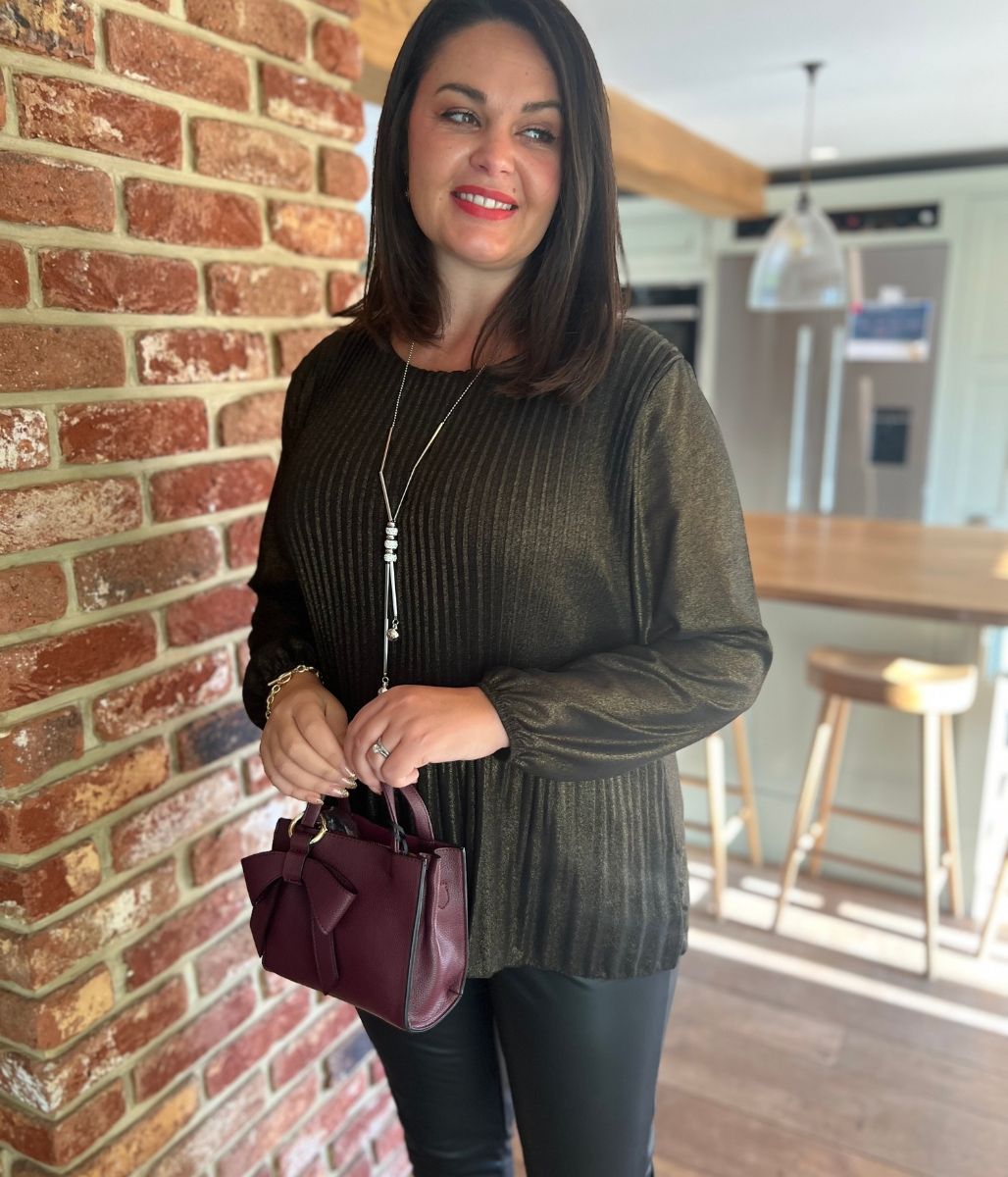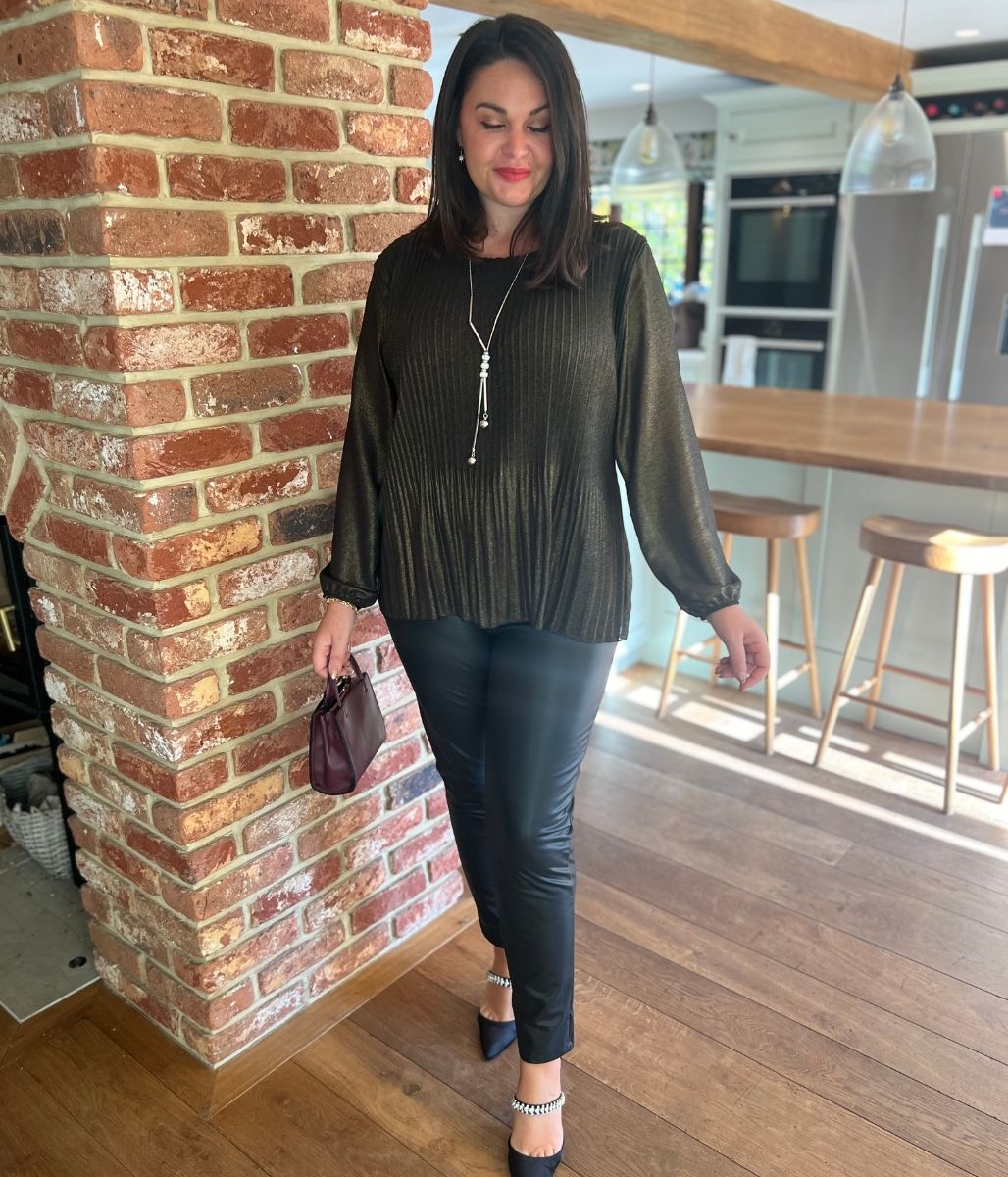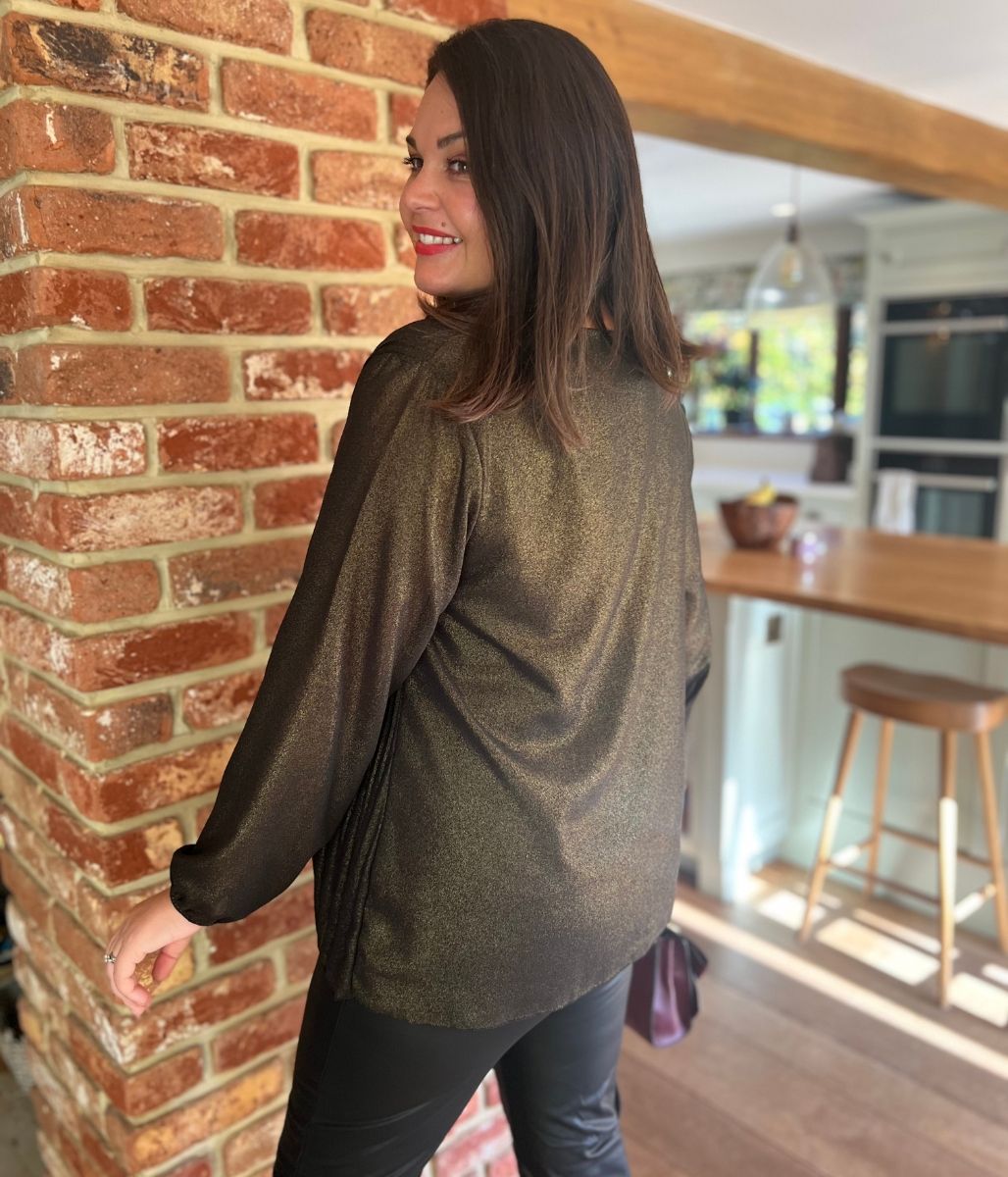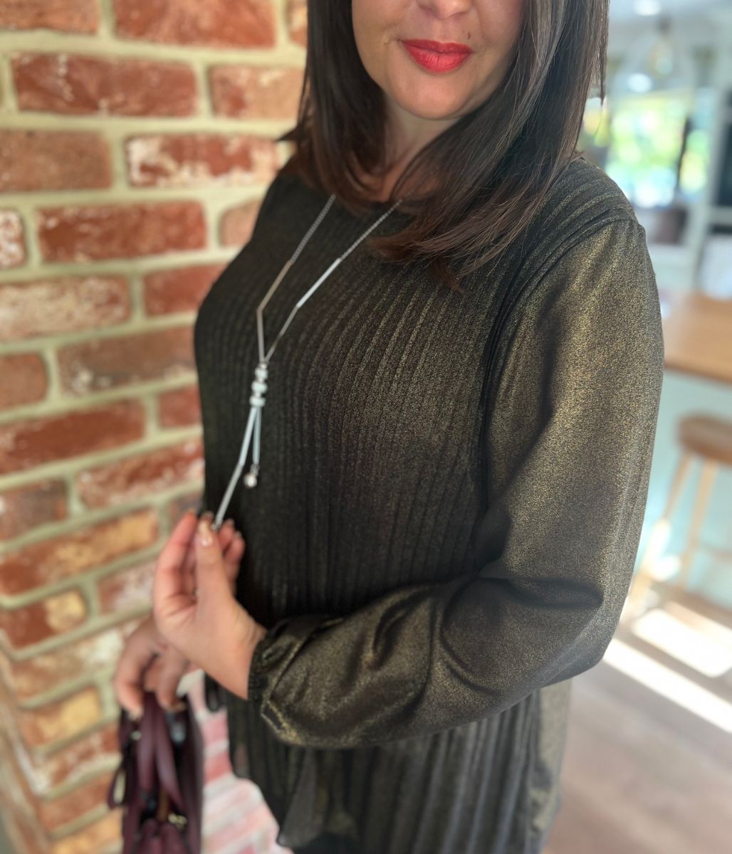 From our Italian collection and cut from a pleated front fabric this piece features a round neckline and full length, sheer sleeves with elasticated cuffs. It’s adorned in a striking, metallic glitter design and comes complete with a matching necklace. A soft jersey under provides extra comfort. A flattering style that is perfect for parties and evenings out.