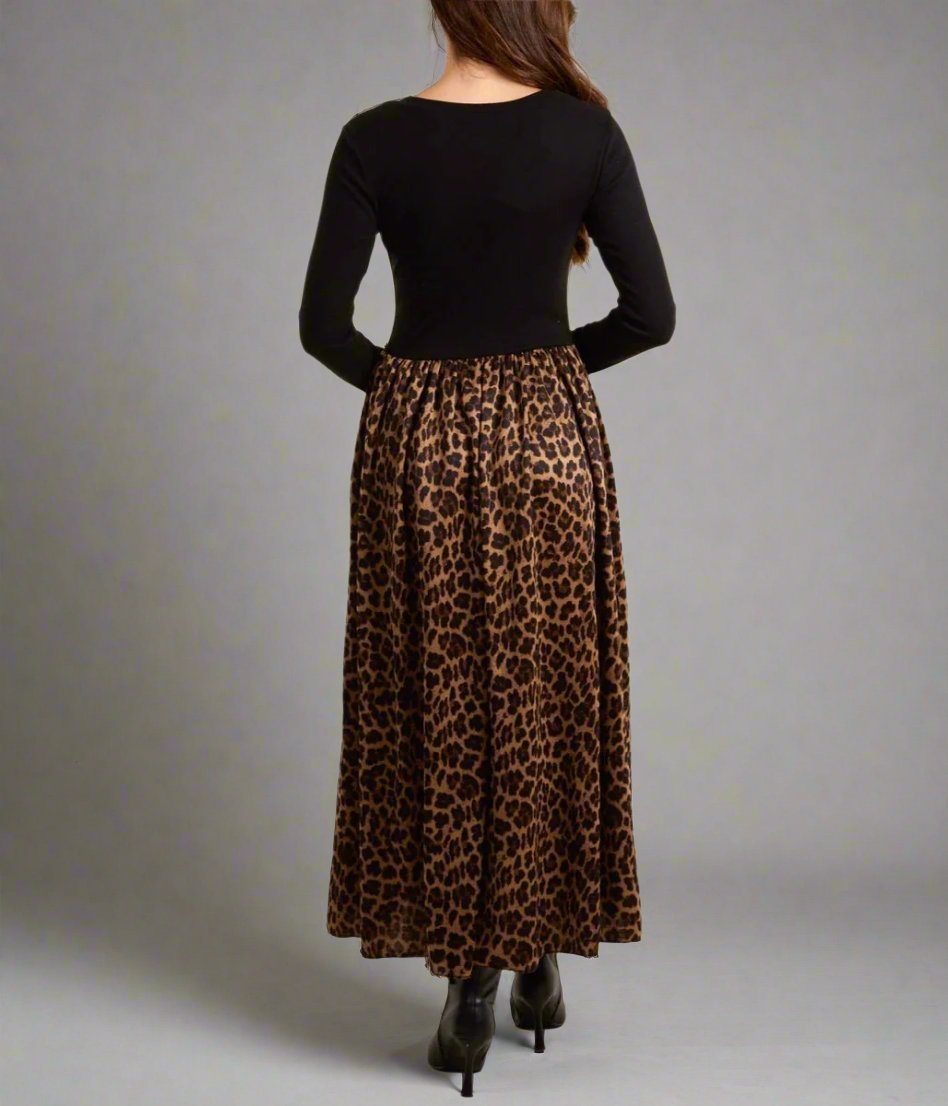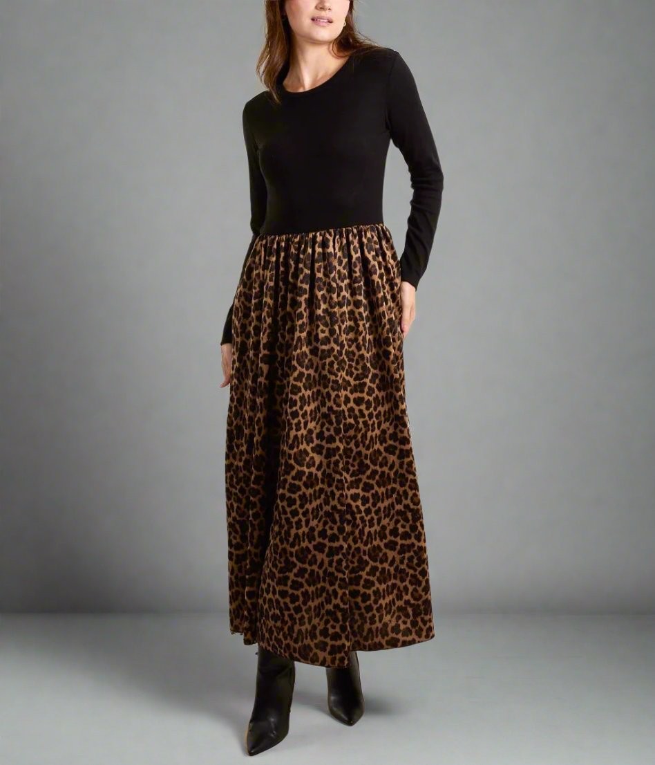 From our Italian collection. This dress features a ribbed bodice with stretch for a perfect fit, while the leopard print skirt with handy side pockets adds a touch of fierce elegance. One size fits UK 8-16 for a flattering and effortless style.