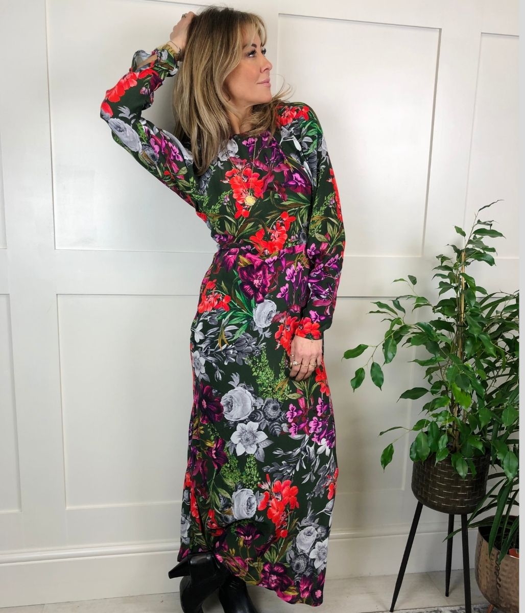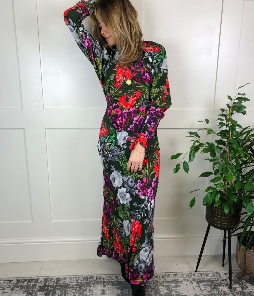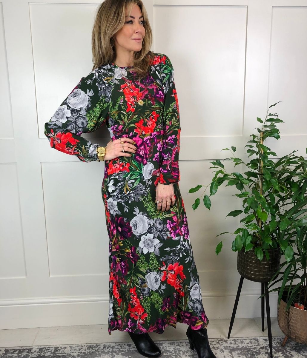 Timeless silhouettes and vibrant hues are created with this dress, crafted from viscose fabric and adorned with a garden floral print for an artful touch. A midi length with long batwing long sleeves add optimal coverage in cooler seasons. A round neck frames the neck delicately, with a waist seam and A-line skirt for a flattering silhouette.