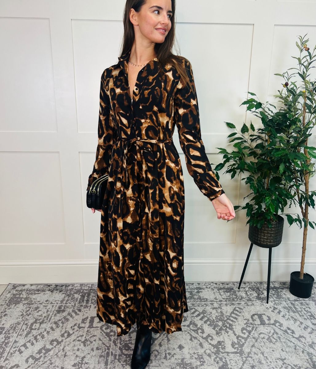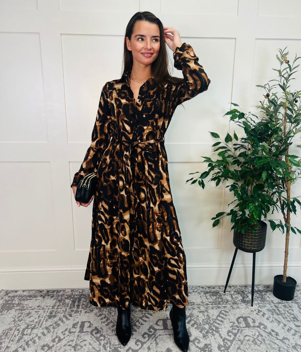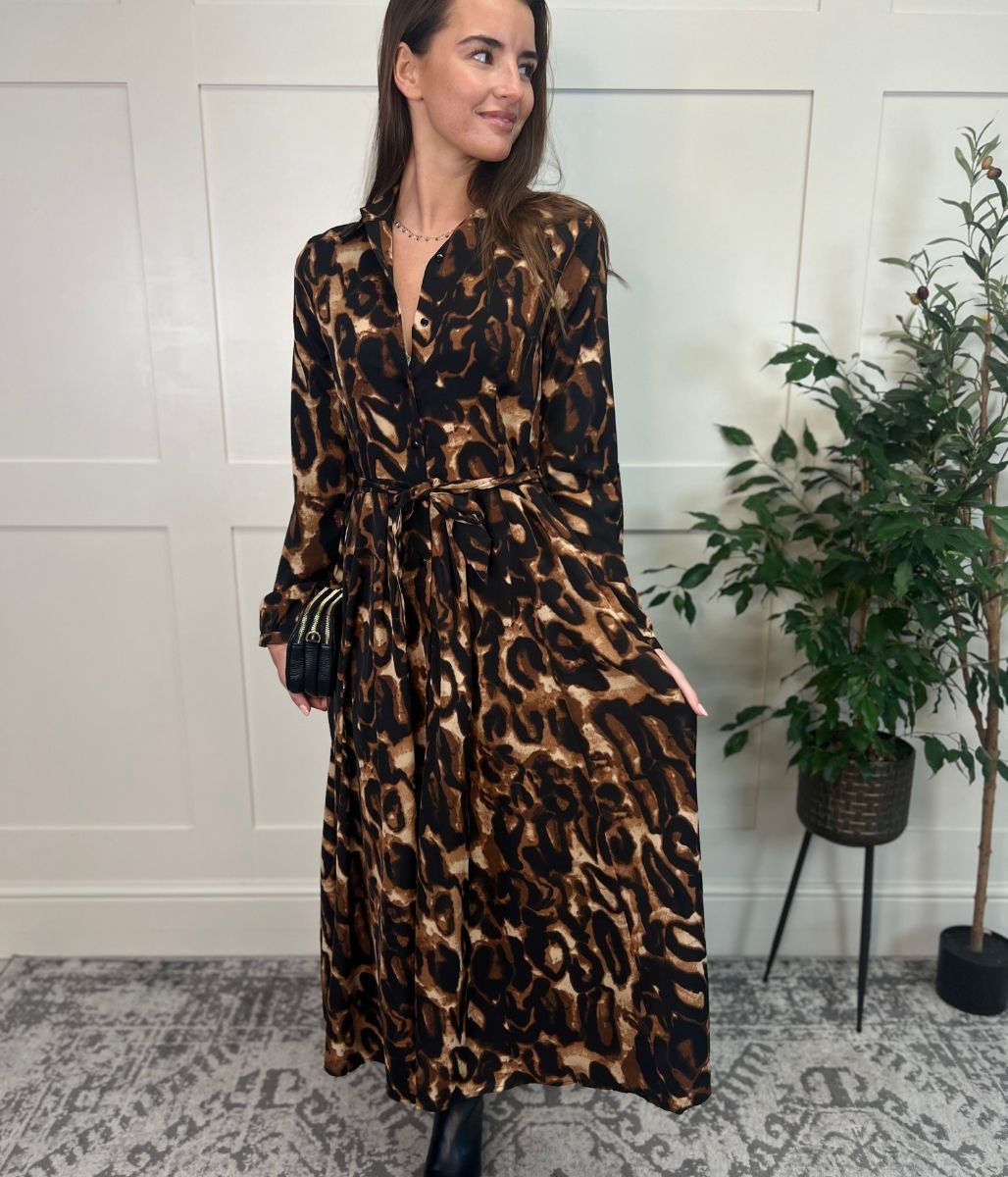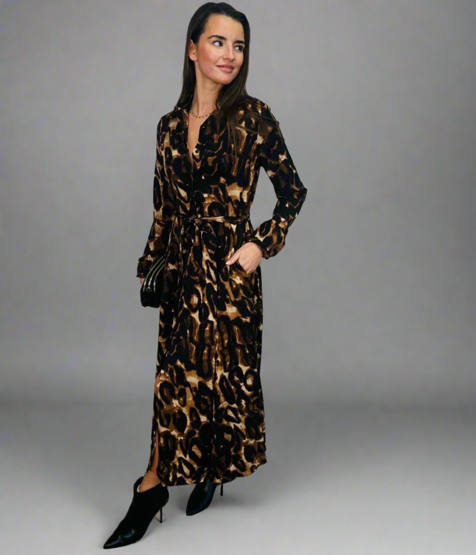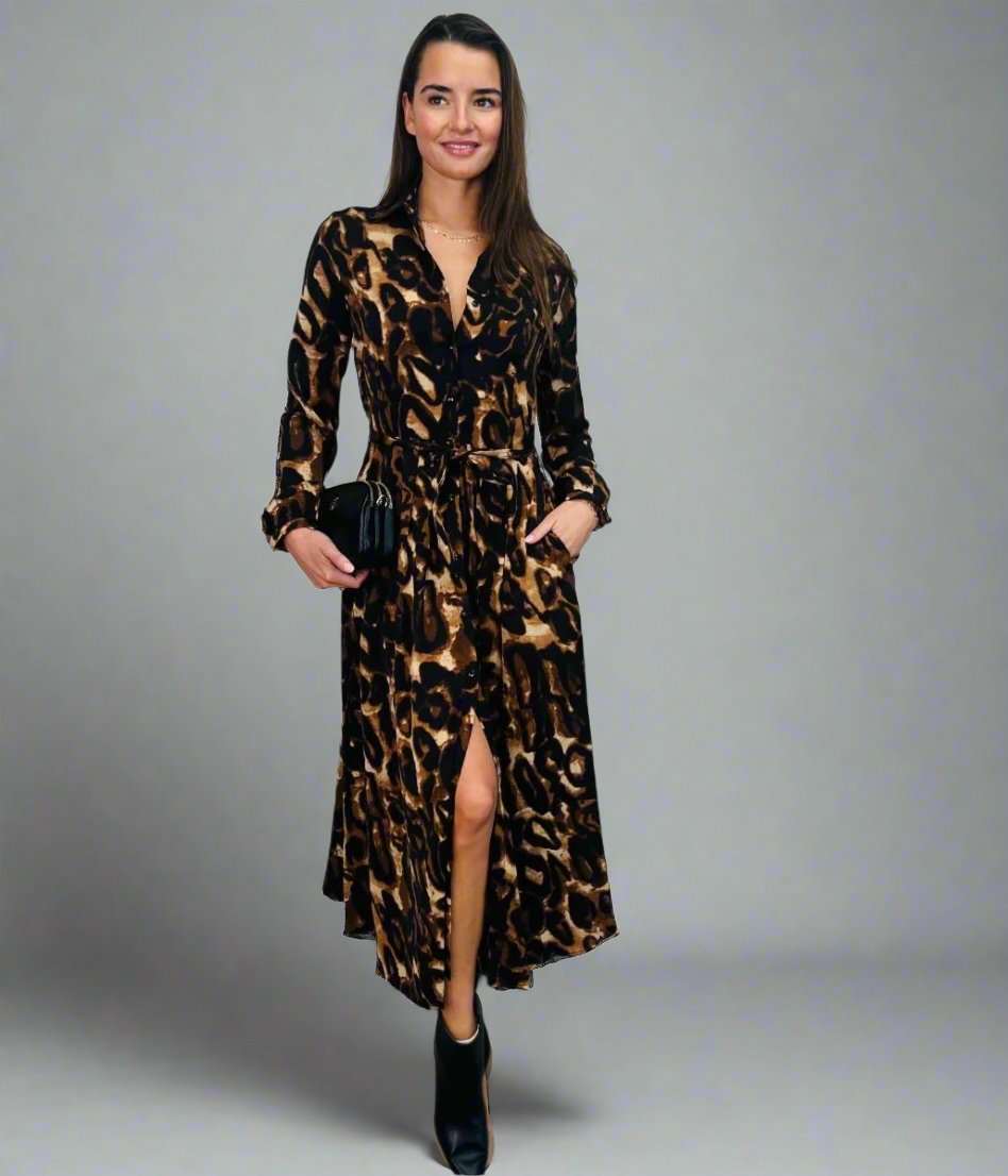This dress features a striking leopard print in rich brown and black tones, creating a dramatic yet sophisticated look. It is designed with a classic shirt collar and a button-down front, offering a timeless silhouette. A matching tie belt cinches the waist, accentuating the figure, while long sleeves add an element of elegance. Two side pockets add a touch of practicality, making this dress as functional as it is fashionable.