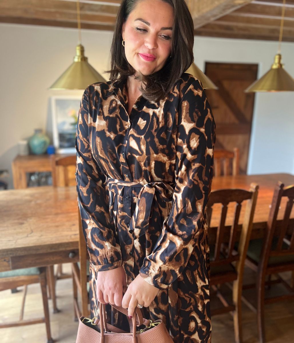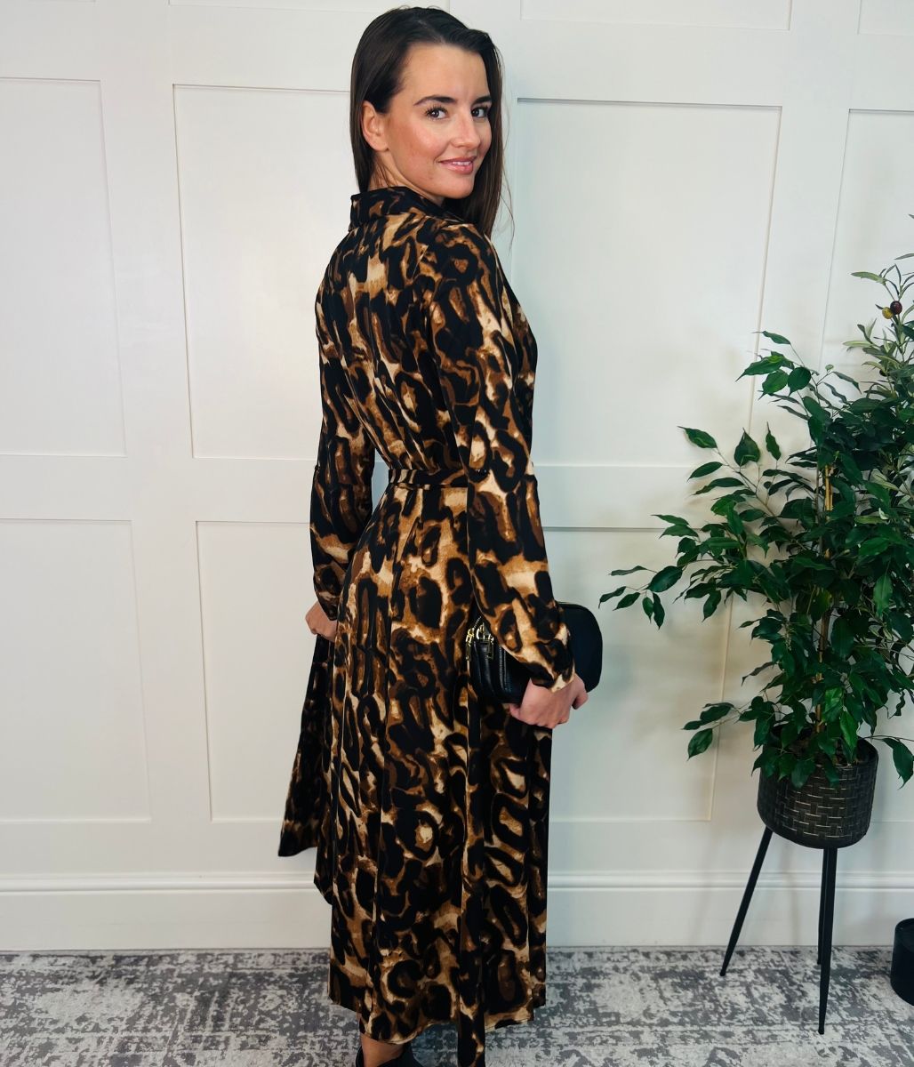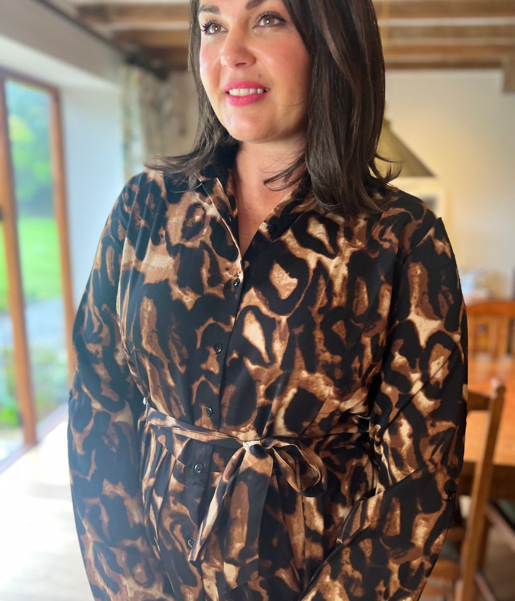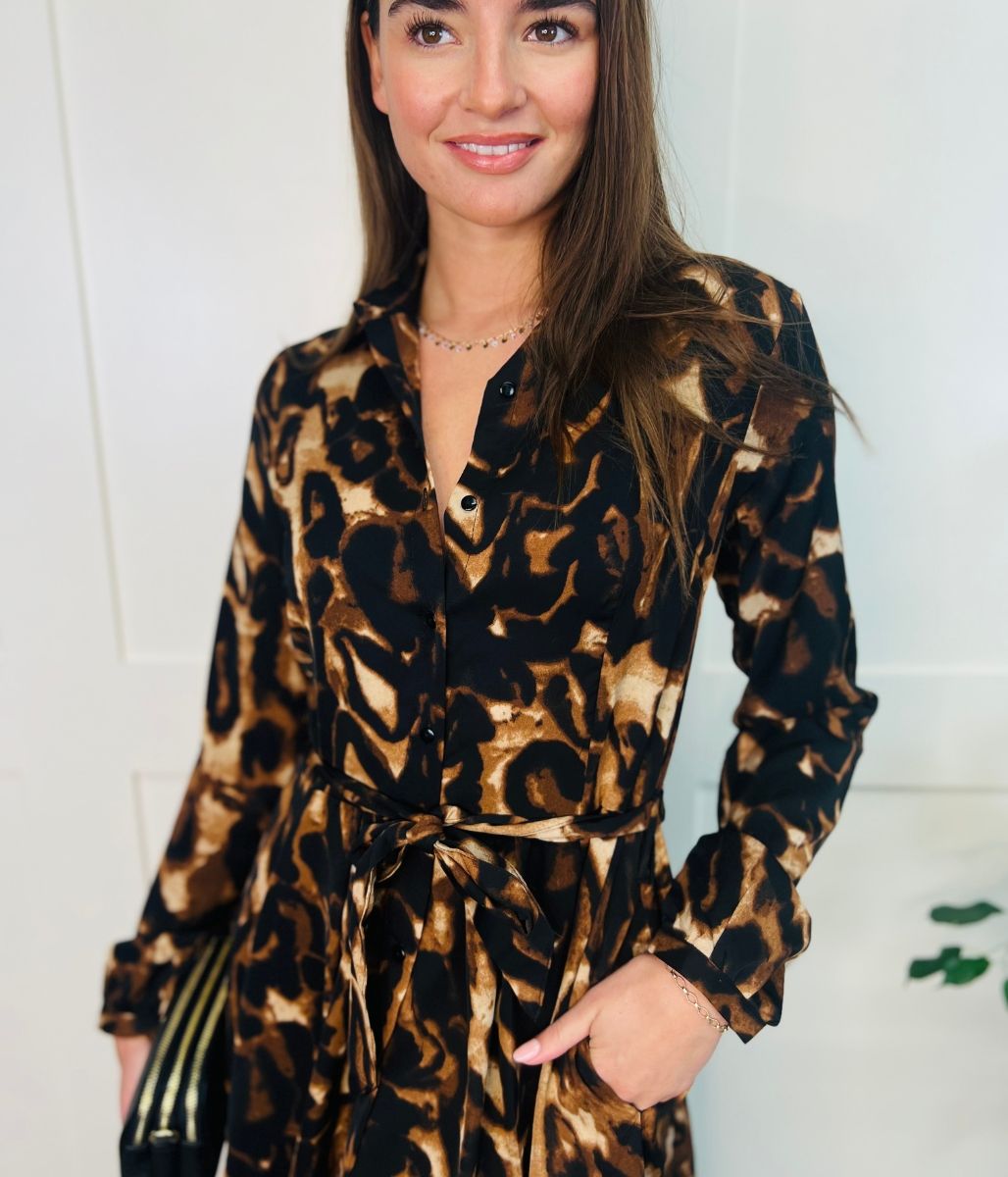 This dress features a striking leopard print in rich brown and black tones, creating a dramatic yet sophisticated look. It is designed with a classic shirt collar and a button-down front, offering a timeless silhouette. A matching tie belt cinches the waist, accentuating the figure, while long sleeves add an element of elegance. Two side pockets add a touch of practicality, making this dress as functional as it is fashionable.