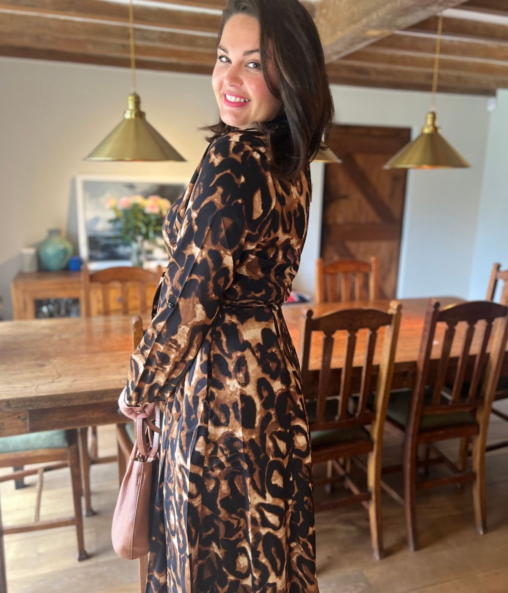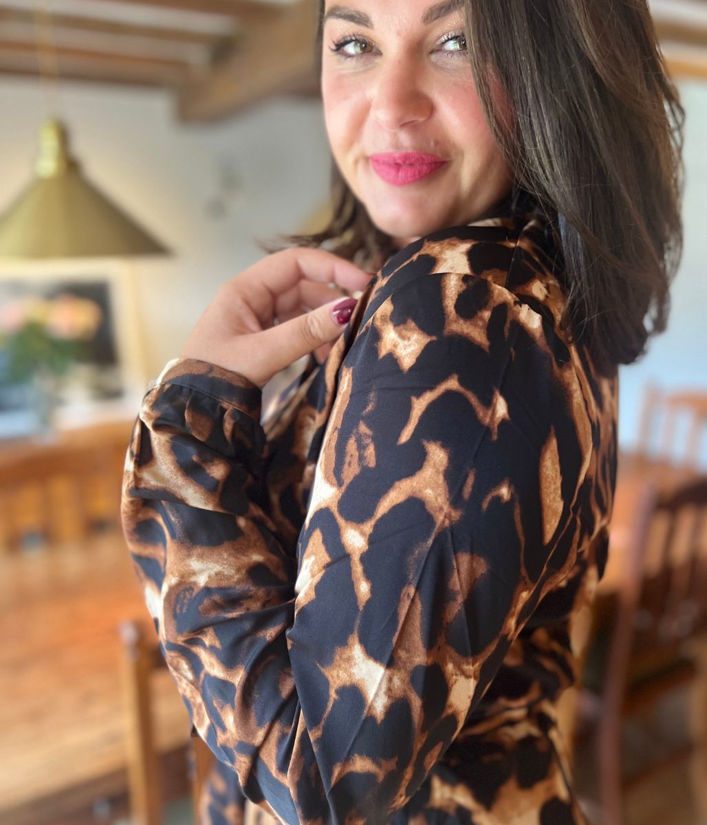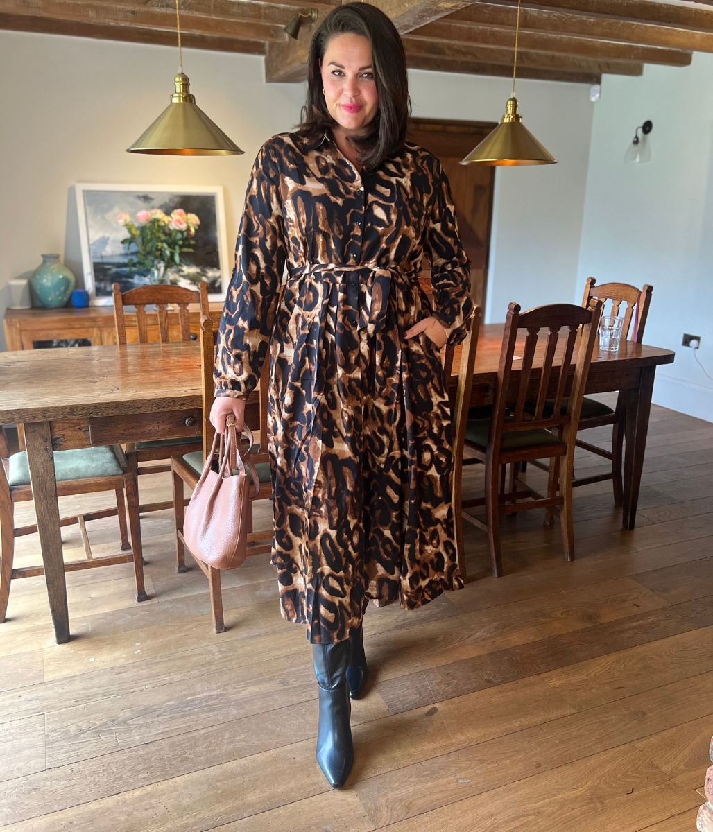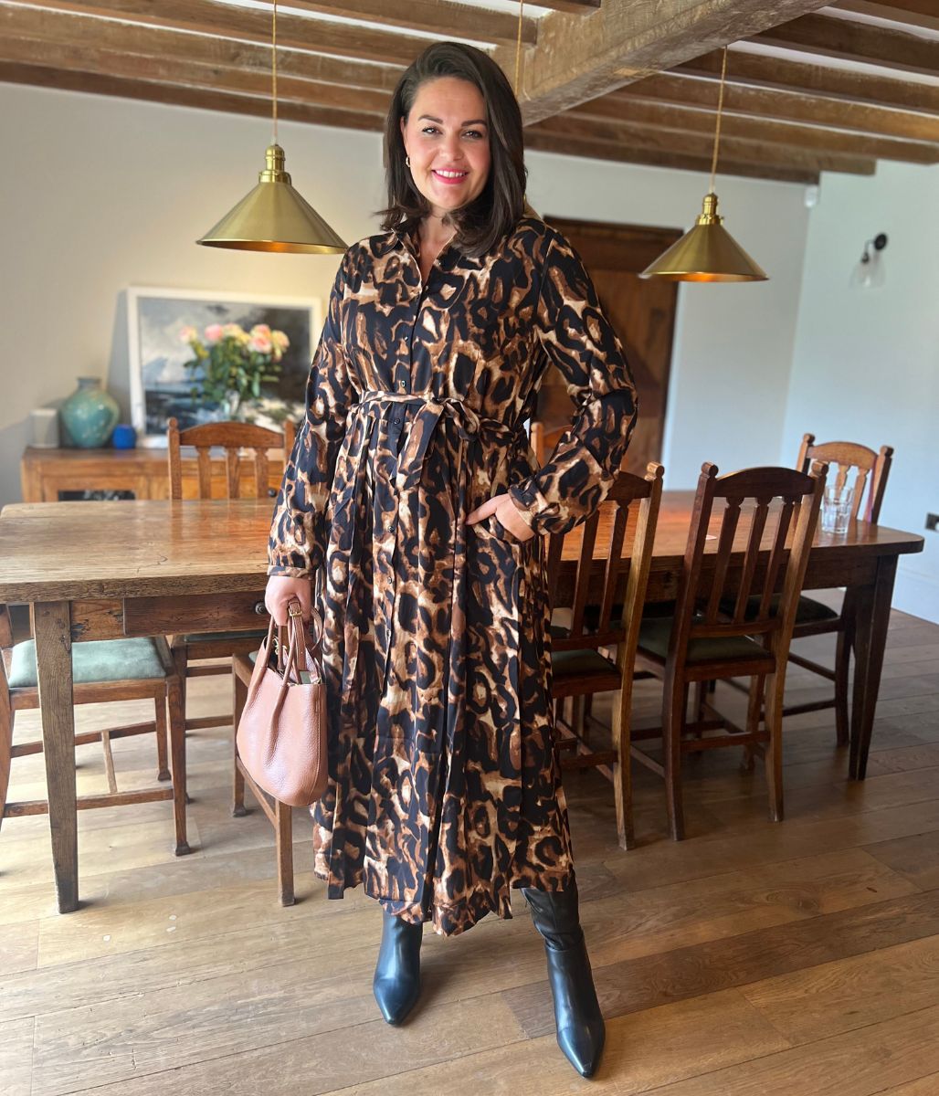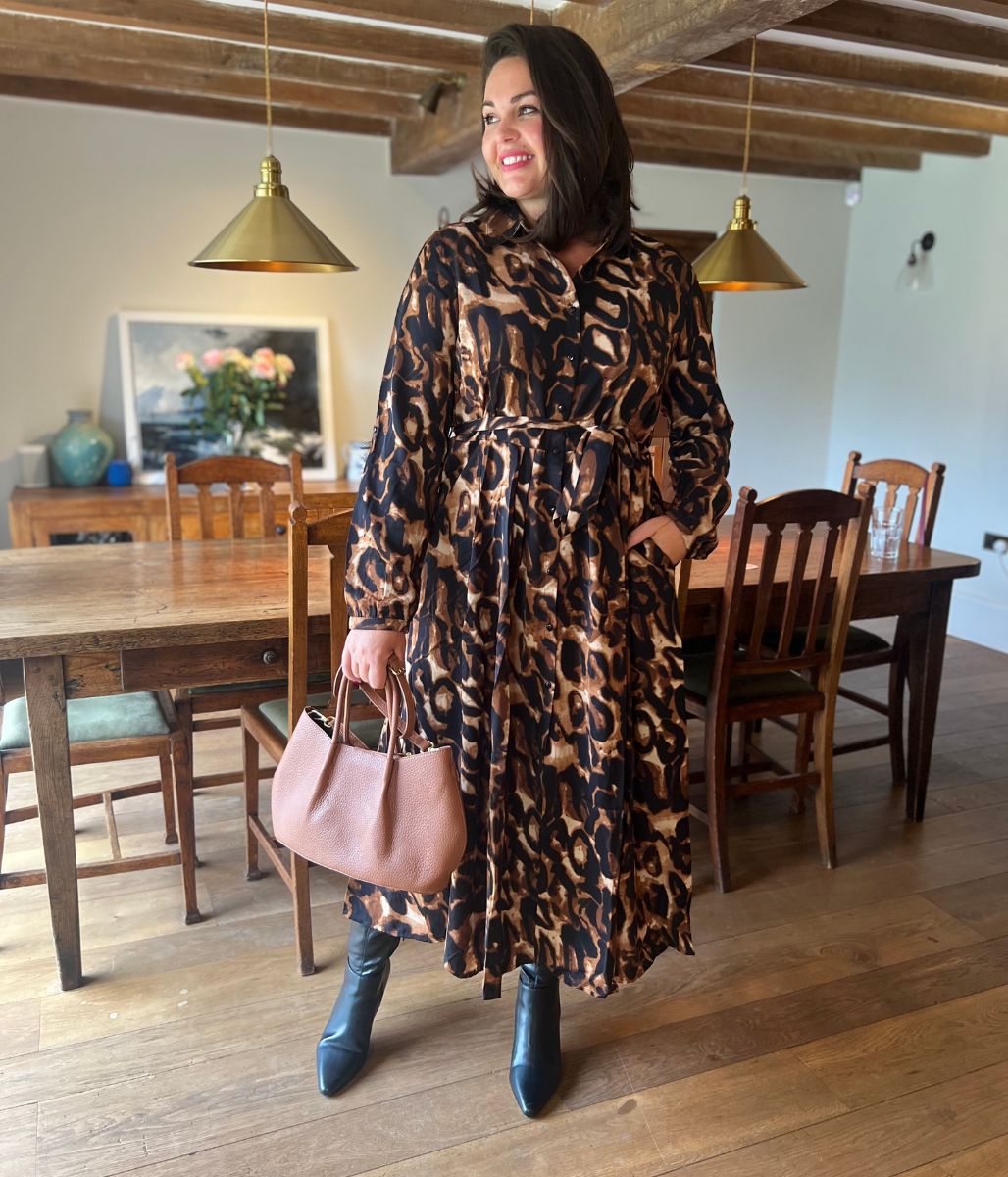 This dress features a striking leopard print in rich brown and black tones, creating a dramatic yet sophisticated look. It is designed with a classic shirt collar and a button-down front, offering a timeless silhouette. A matching tie belt cinches the waist, accentuating the figure, while long sleeves add an element of elegance. Two side pockets add a touch of practicality, making this dress as functional as it is fashionable.