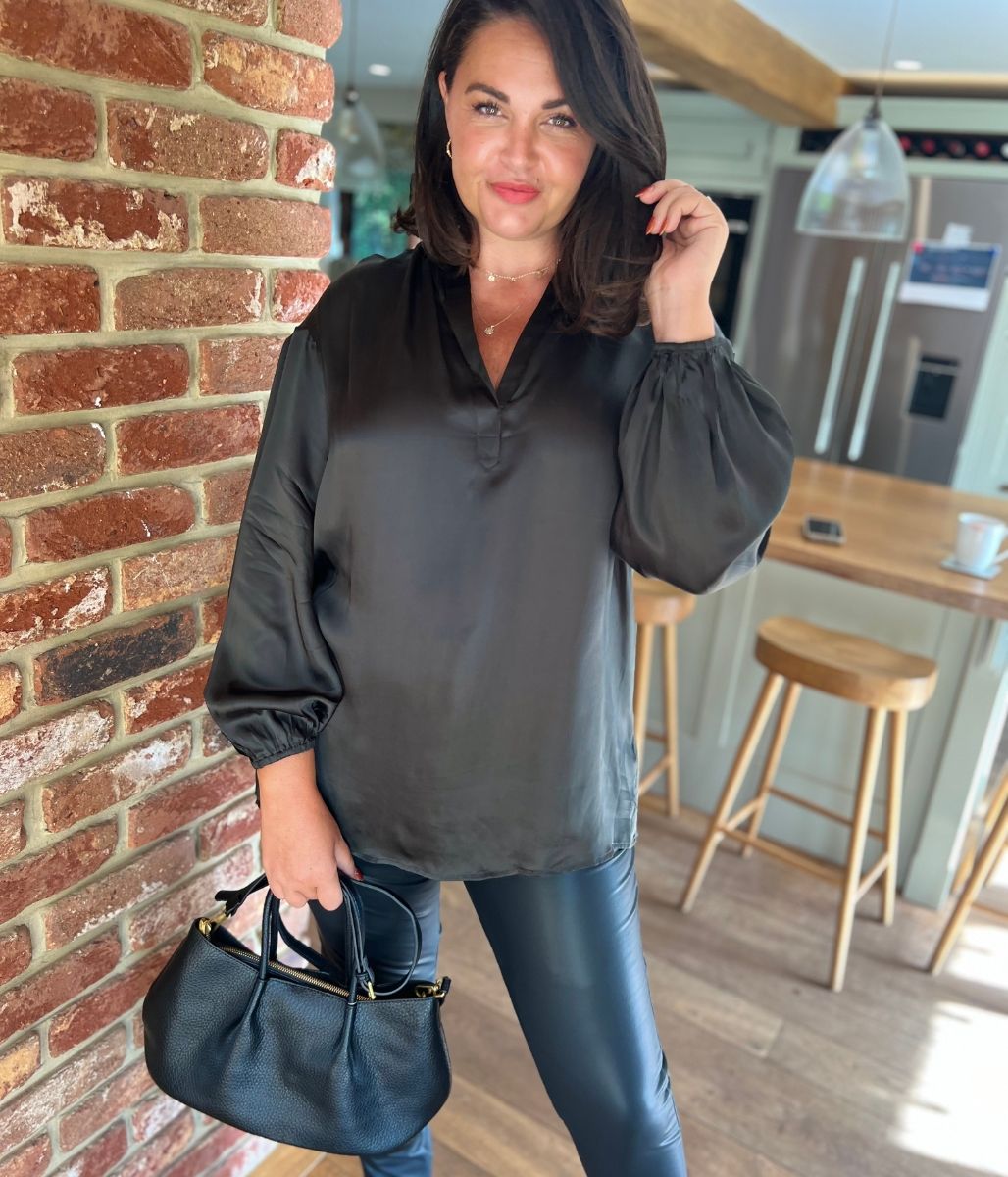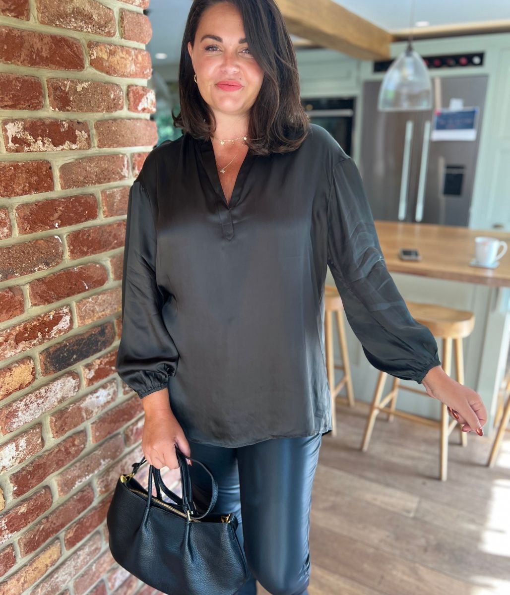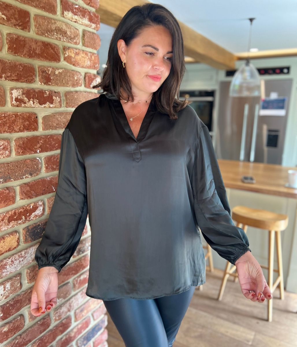 This stunning satin blouse features a notch neck and 3/4 sleeves with elasticated cuffs for a comfortable and flattering fit. The curved hem at the back and pleated neckline add unique touches, while the frill collar adds a touch of femininity.
