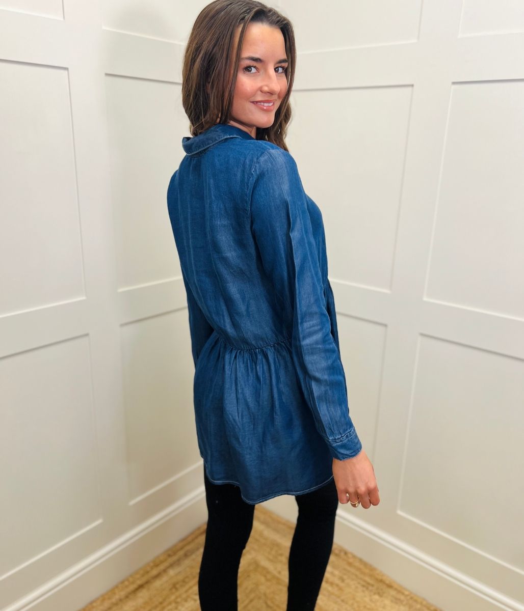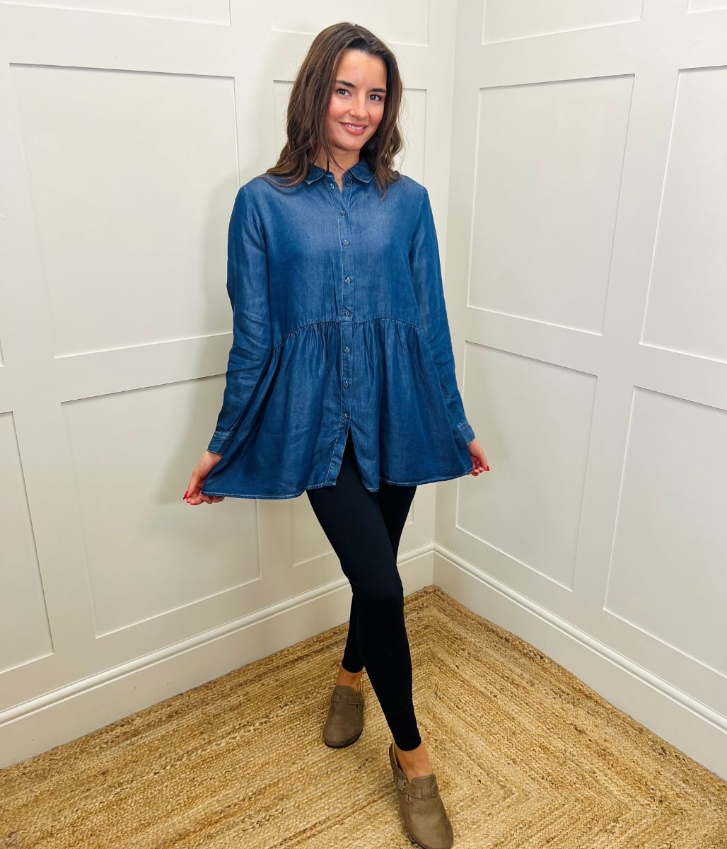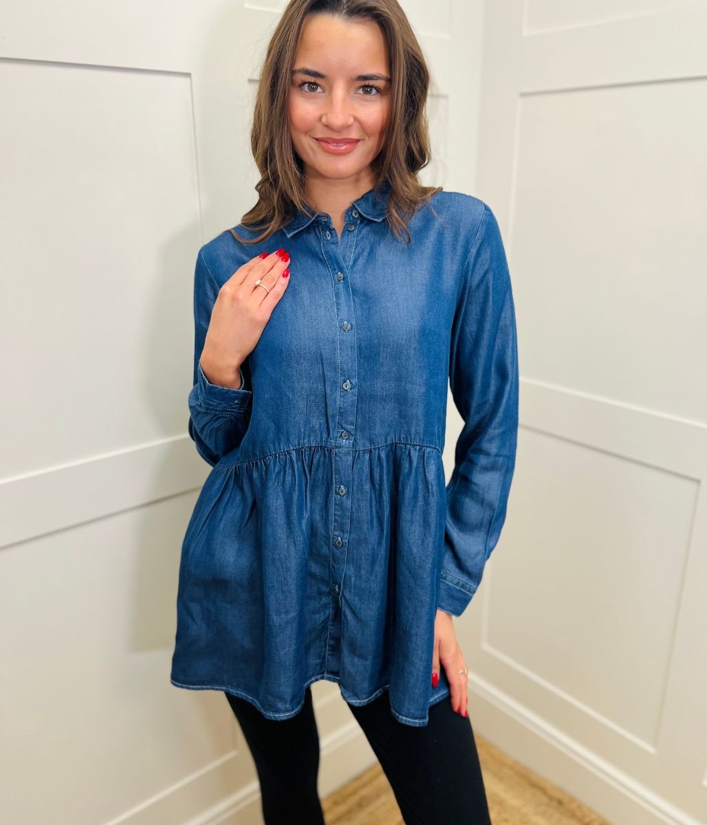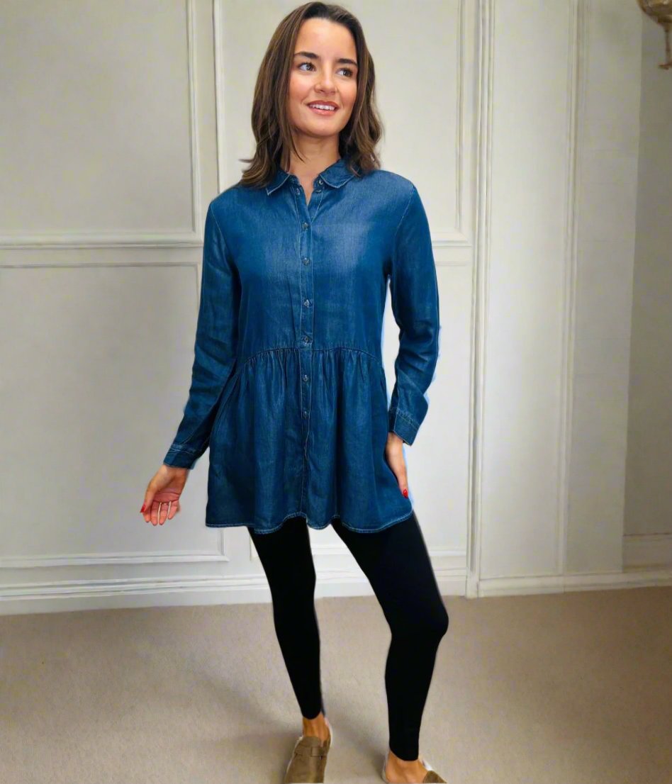 This stylish tunic length shirt features a flattering peplum style and long sleeves, perfect for any occasion. The button front adds a touch of sophistication while keeping you comfortable, pair with leggings and boots for an easy to wear look