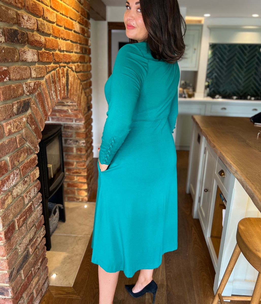 Made with stretch jersey for a comfortable fit, the V neck with tie detail and gathering to the shoulders add a touch of sophistication. In seam pockets and long sleeves with button detail make this fit and flare dress both functional and stylish.