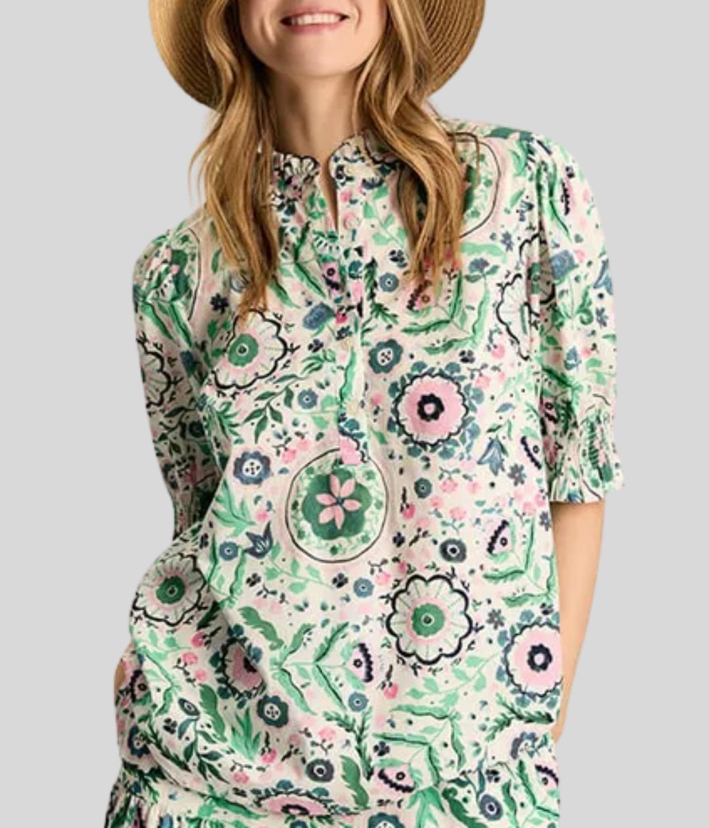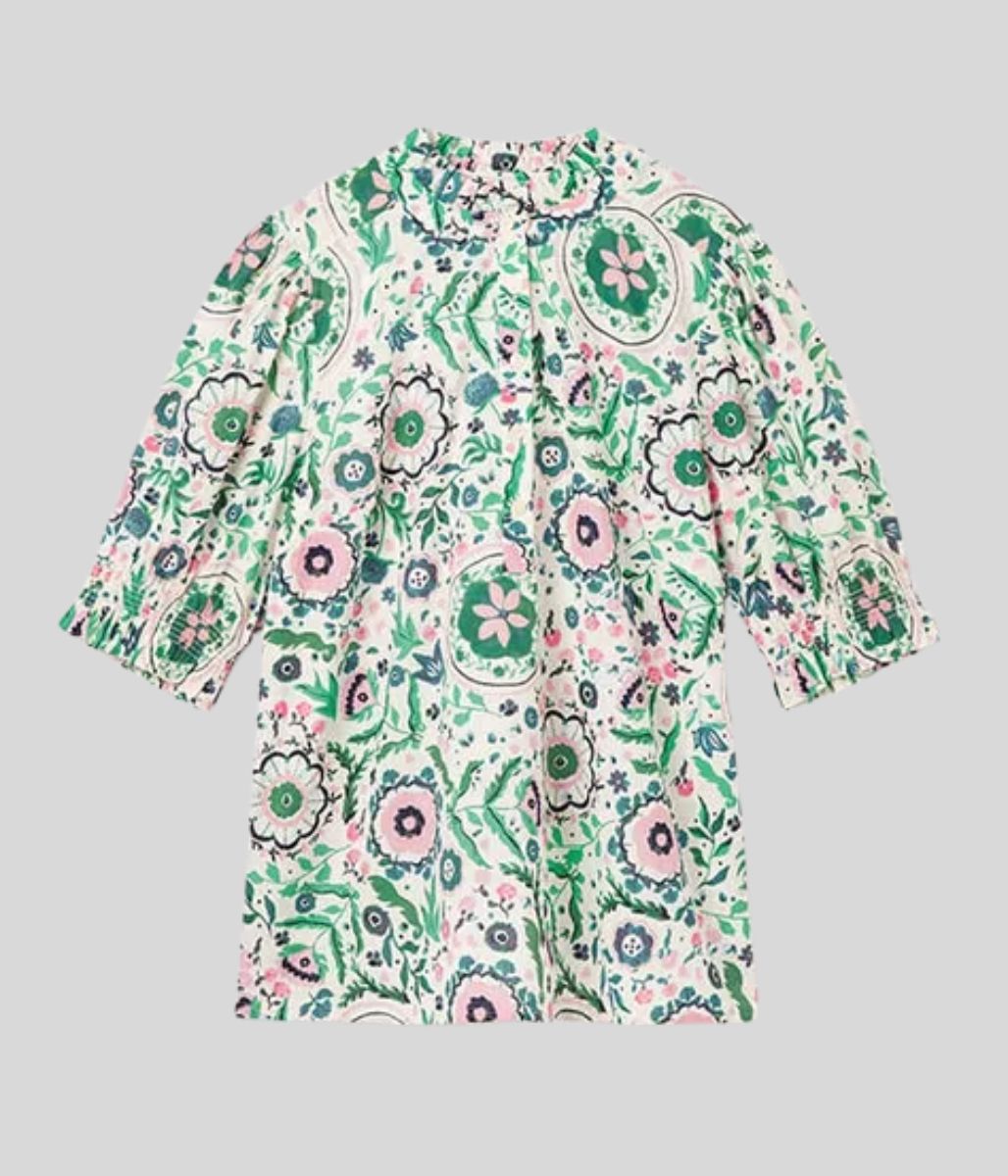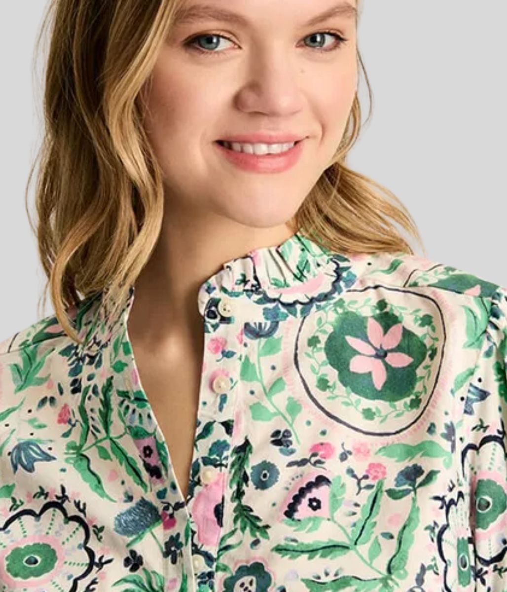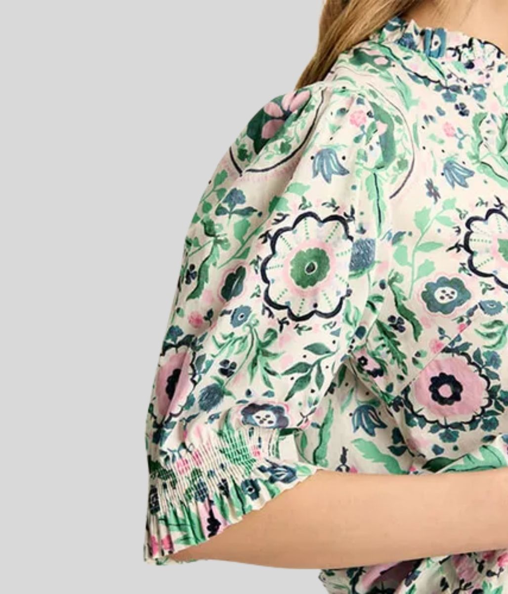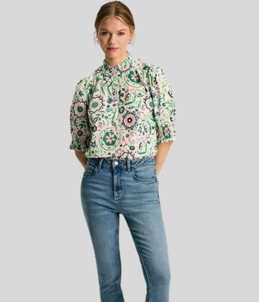 Crafted from a light and airy fabric, the Elle frill blouse will elevate your summer style. This pretty addition has puff sleeves which sit at the elbow and are trimmed with elasticated frilled cuffs. It has a relaxed fit through the body, a frilled pie crust neckline and a button placket to the front so it can be styled buttoned up, or down.