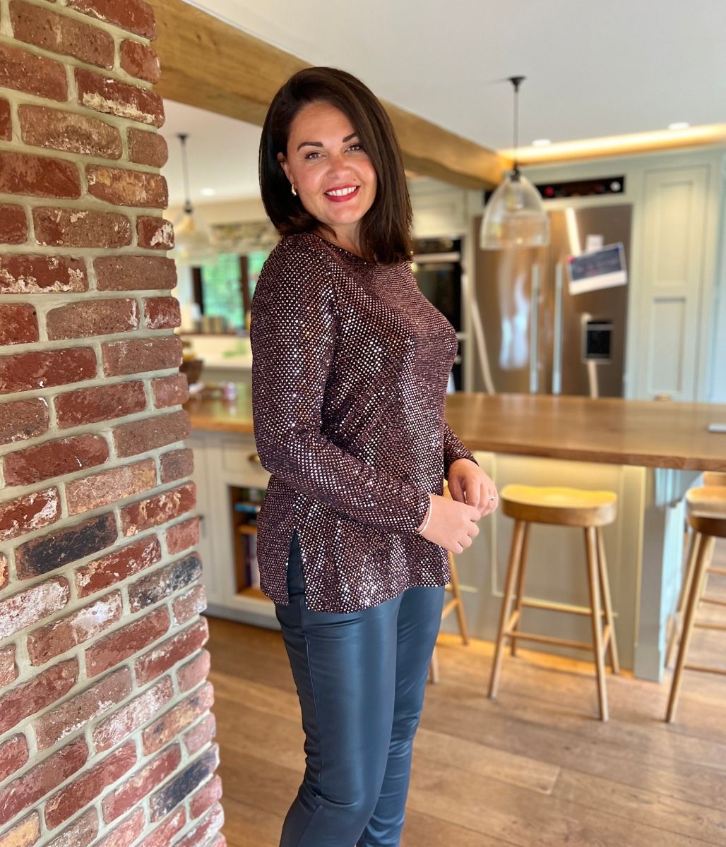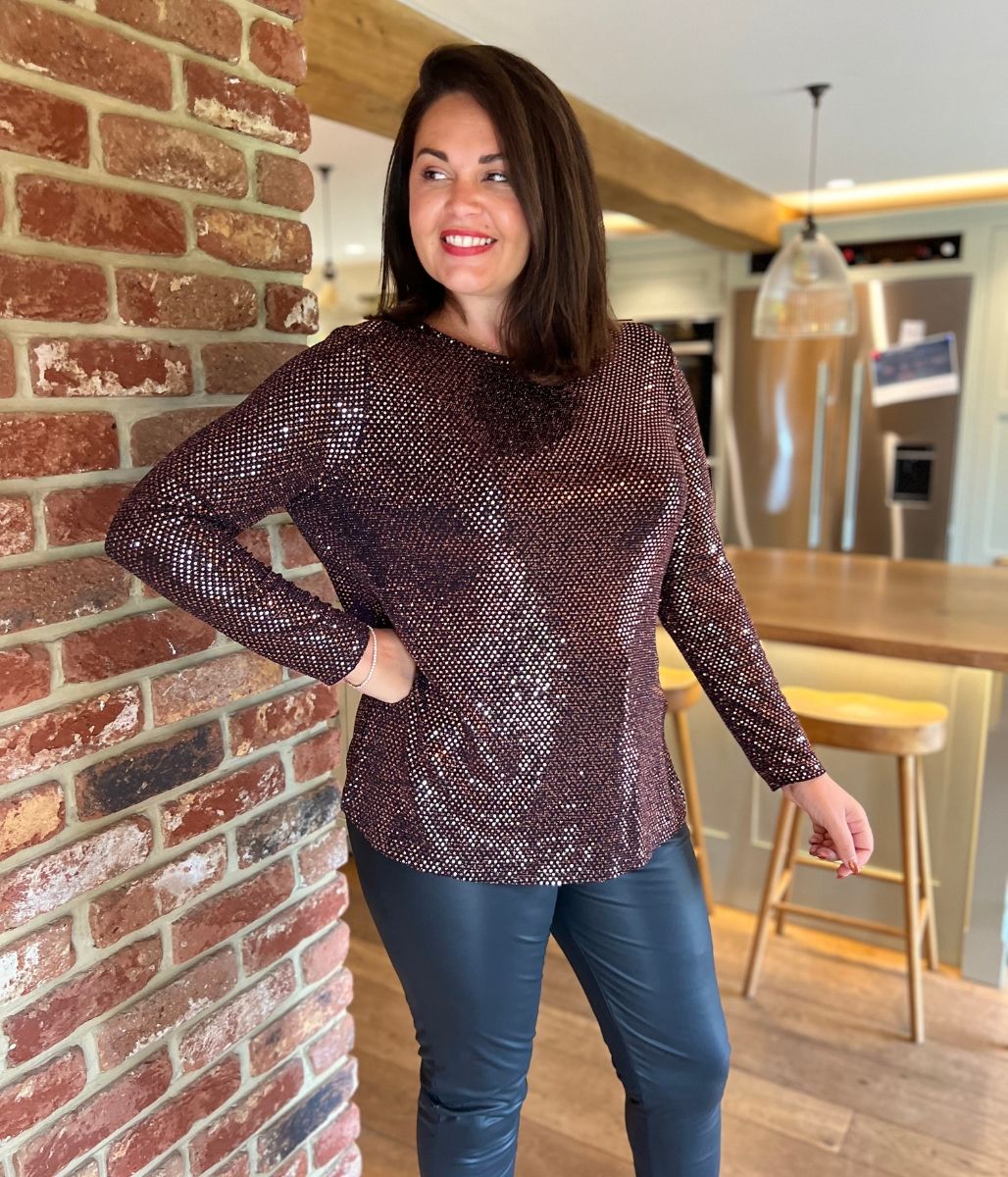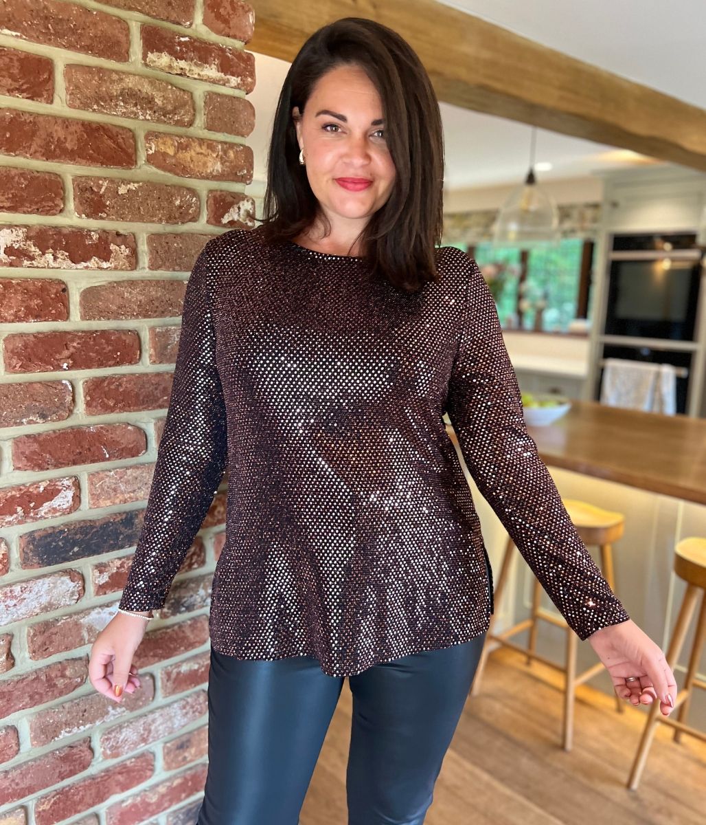 Add some sparkle to your wardrobe! The sparkle detail adds a touch of glamour, complemented by the unique cowl back design. Featuring long sleeves to keep you warm, a classic round neckline, and a tunic shape, this top is cut from a comfortable stretch jersey fabric for easy wear. Ideal for your next special occasion, simply style with wide-leg trousers and heeled boots for a complete look!