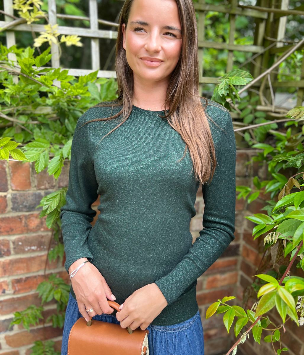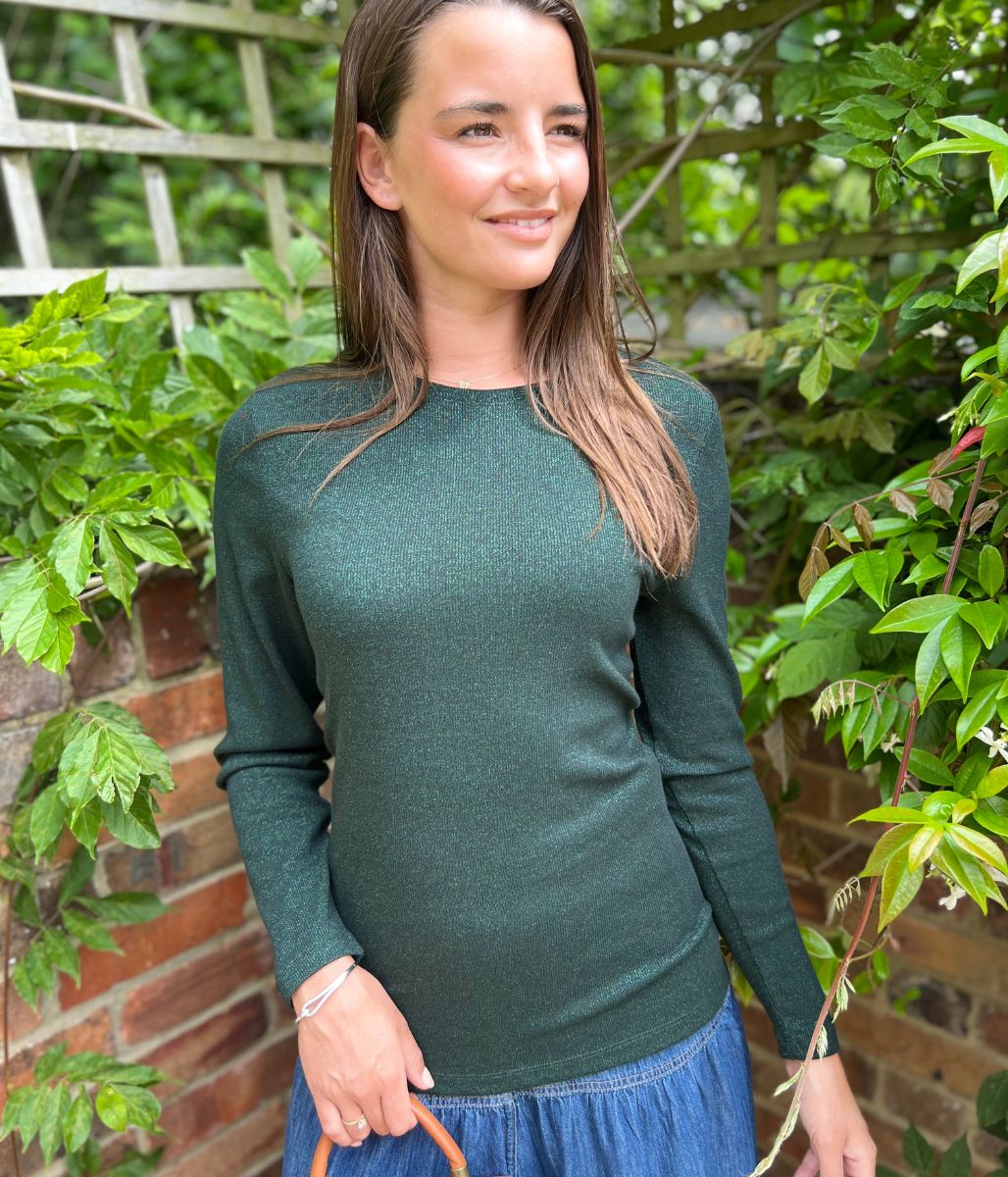 This sparkly top is a stylish addition to any wardrobe. With long sleeves and a round neckline, this t-shirt is made from a soft fabric in a shimmering colour. Perfect for casual wear or dressed up with some jeans, this top is a versatile and chic choice.