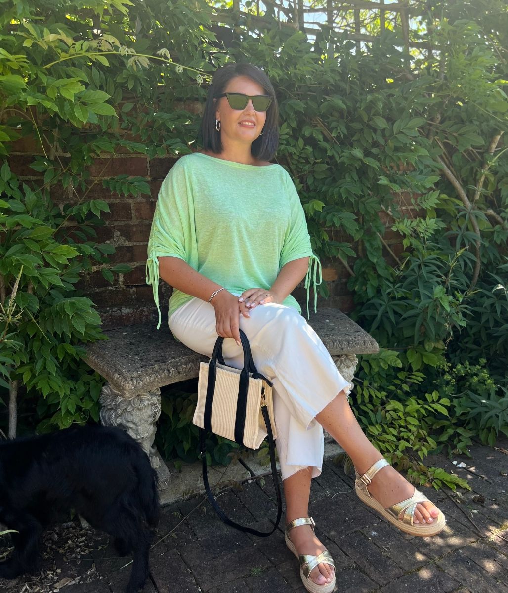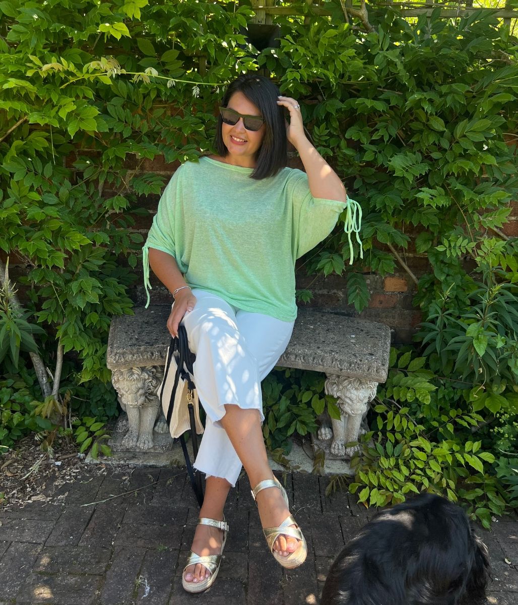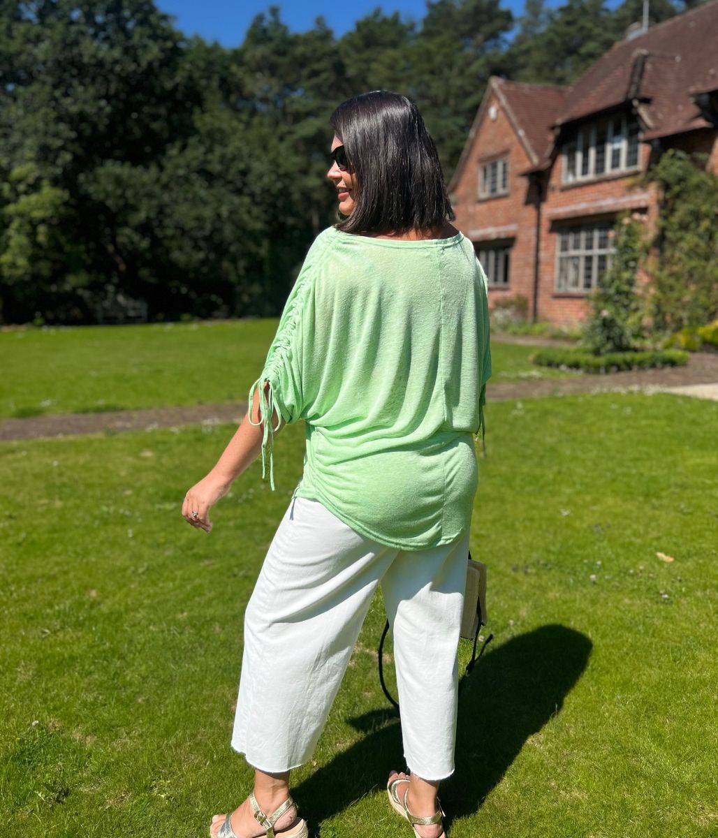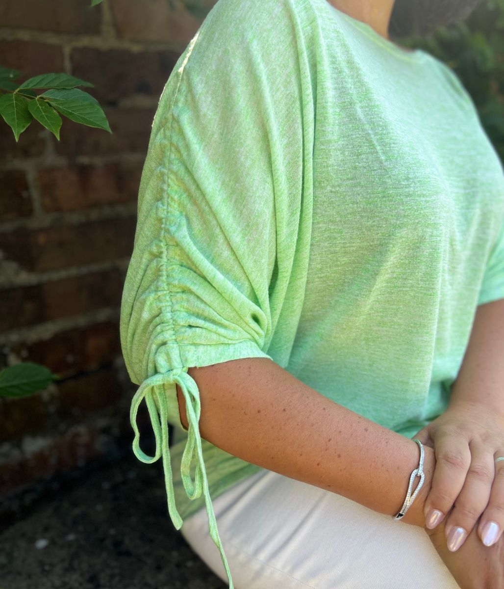 Designed for effortless style and comfort this top features elegant ruched sleeves and a chic tie cuff detail. The relaxed fit and boat neck ensure a flattering silhouette and all-day ease, making it perfect for both casual and dressier occasions.