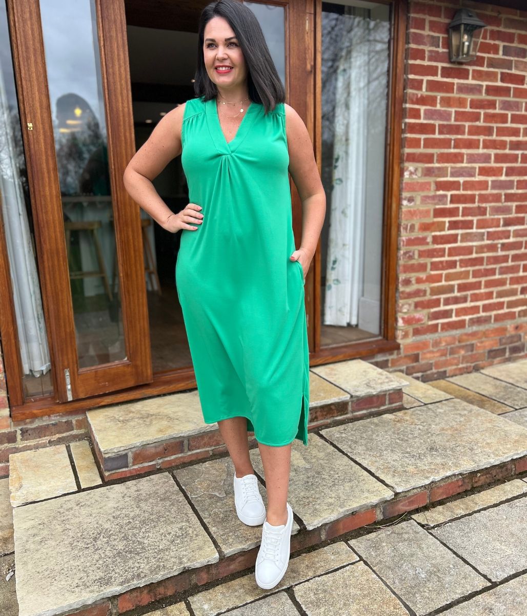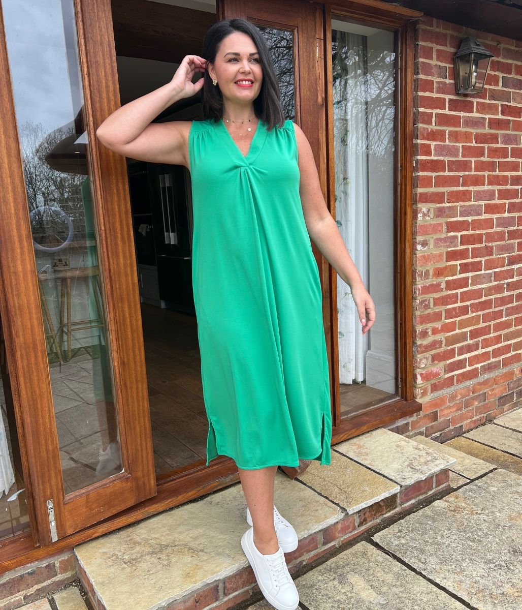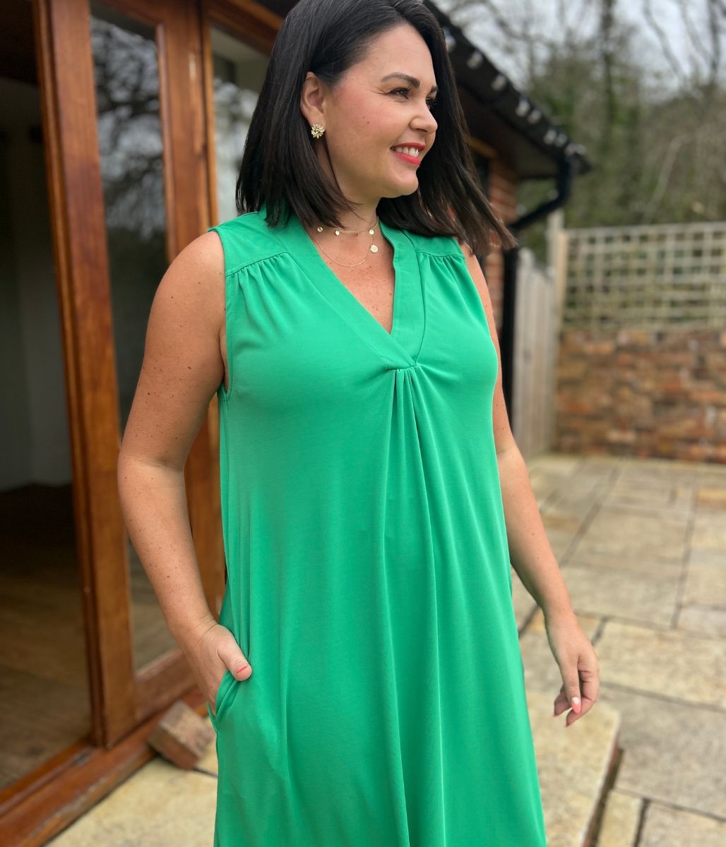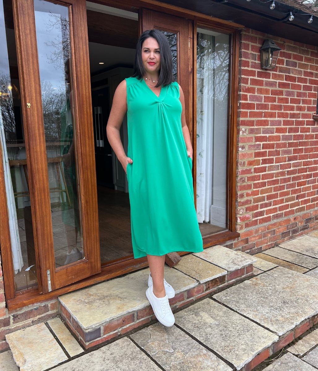 Keeping things simple in a shift silhouette, this midi dress is in need of no fussy details or prints to catch the eye. With a flattering v neckline and a sleeveless design, the pleated detail at the shoulders add extra depth too. So comfortable for all day style.