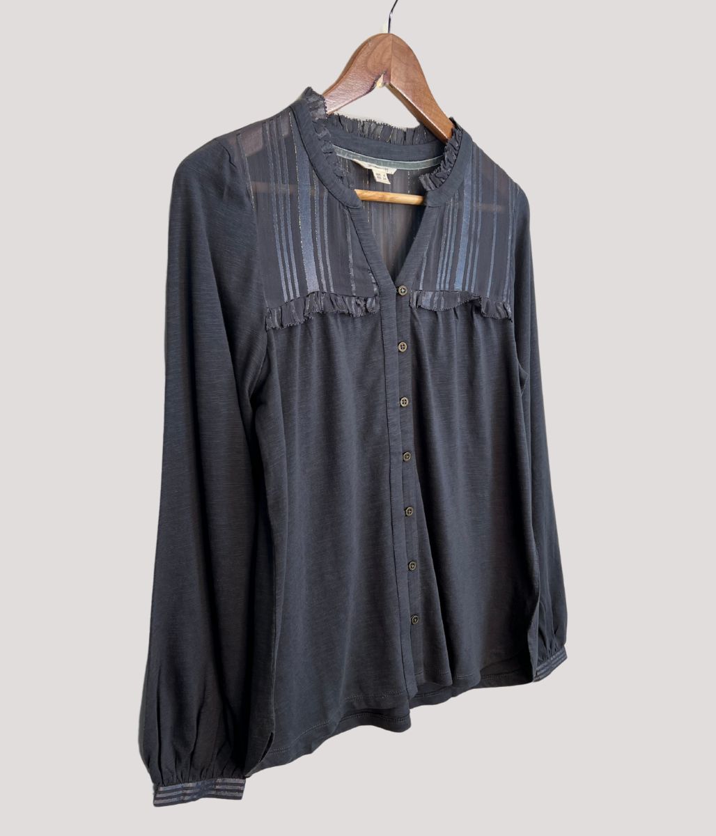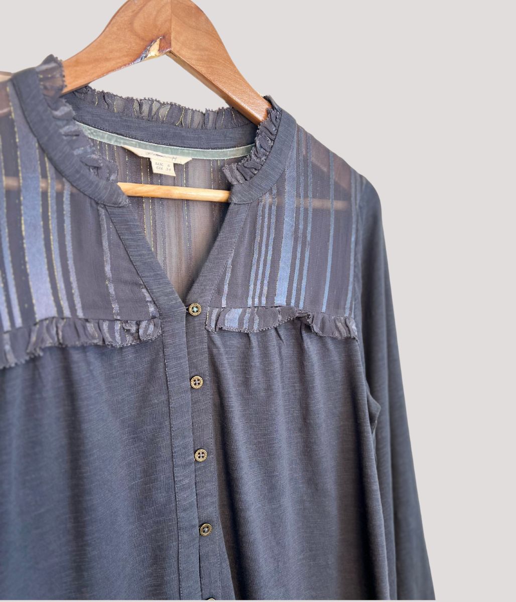 Featuring elegant long sleeves with button cuffs and a convenient front button fastening. The luxurious gold lurex detail adorns the chiffon top section, creating a stunning visual contrast against the soft jersey fabric. Subtle side splits add both style and comfort, ensuring this versatile piece transitions effortlessly from office to evening occasions.