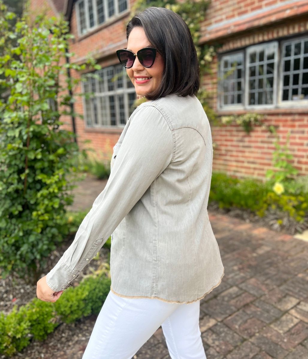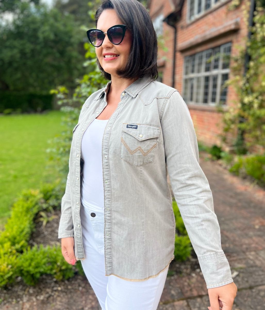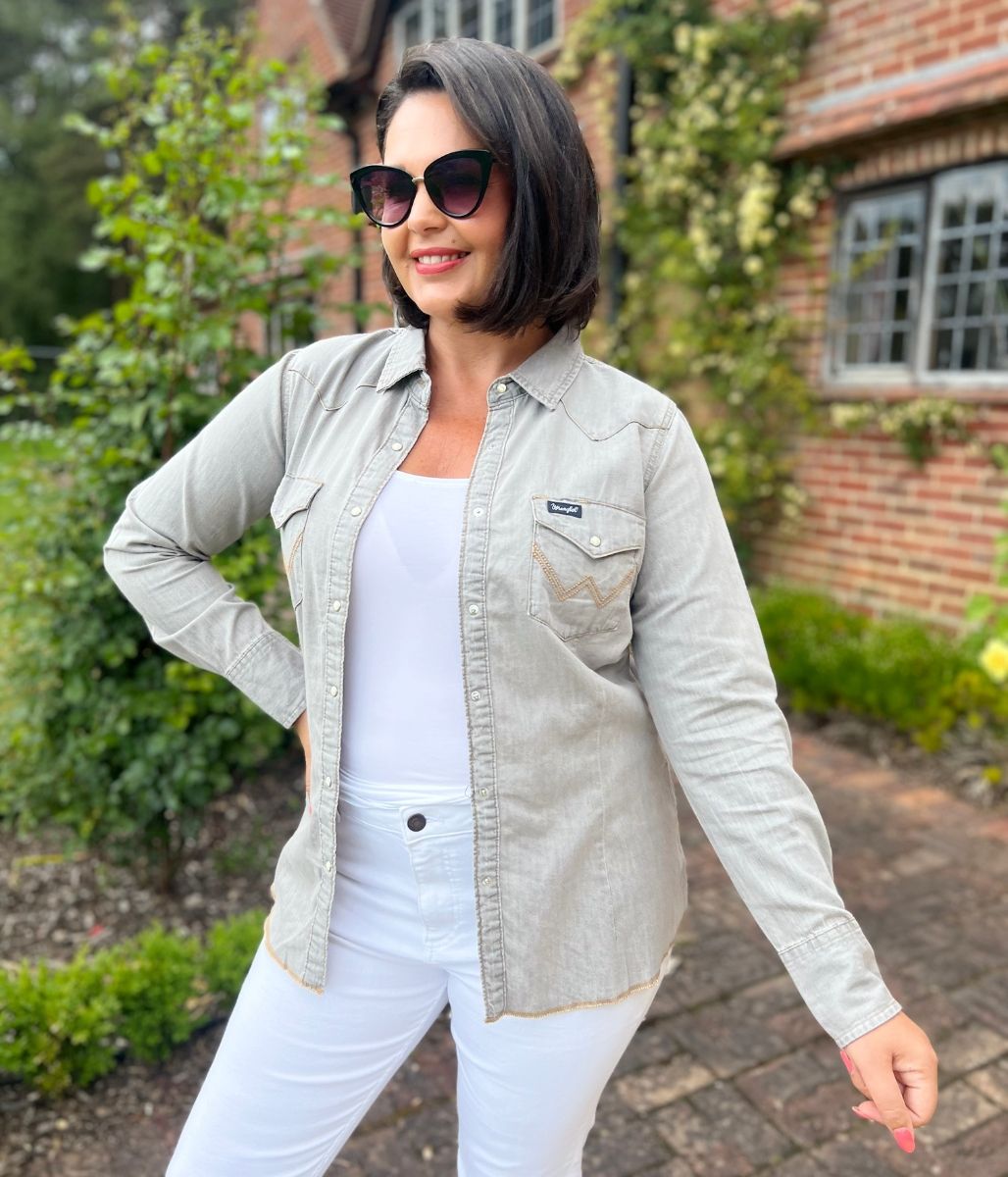 Experience a new take on tradition with this popular shirt. Soft grey denim sets the background for front and back yokes, western poppers and W-embroidered flap pockets. A Wrangler Riser label adds an authentic finishing touch.