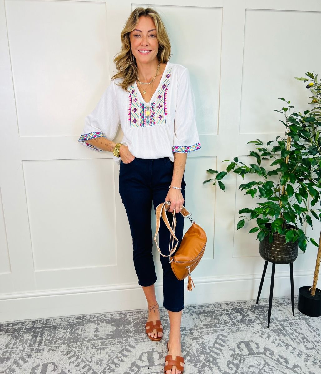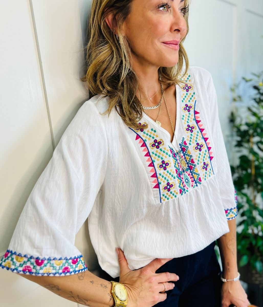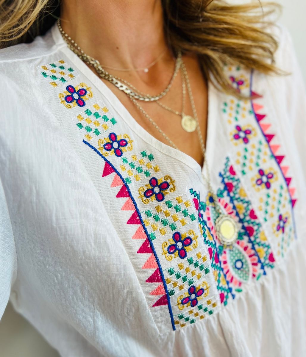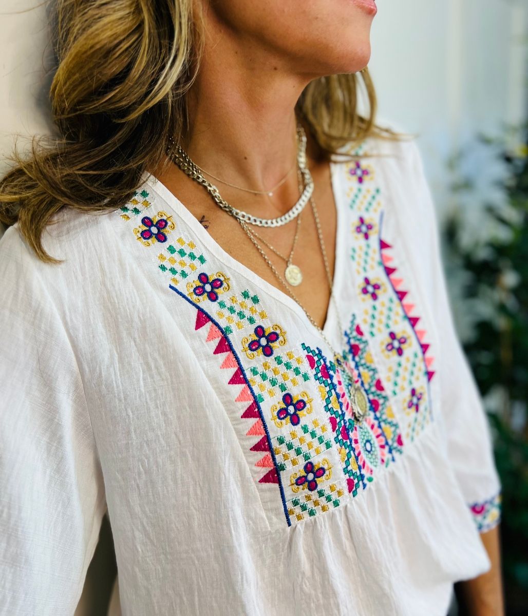 Featuring stunning embroidered details and a flattering v neck design, this top is sure to make a statement. A relaxed fit that pairs well with shorts to keep you cool on sunny days