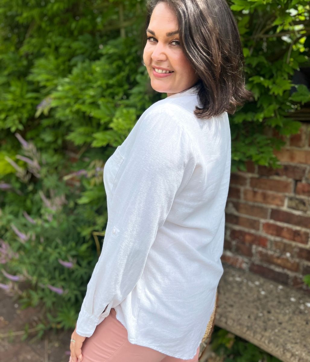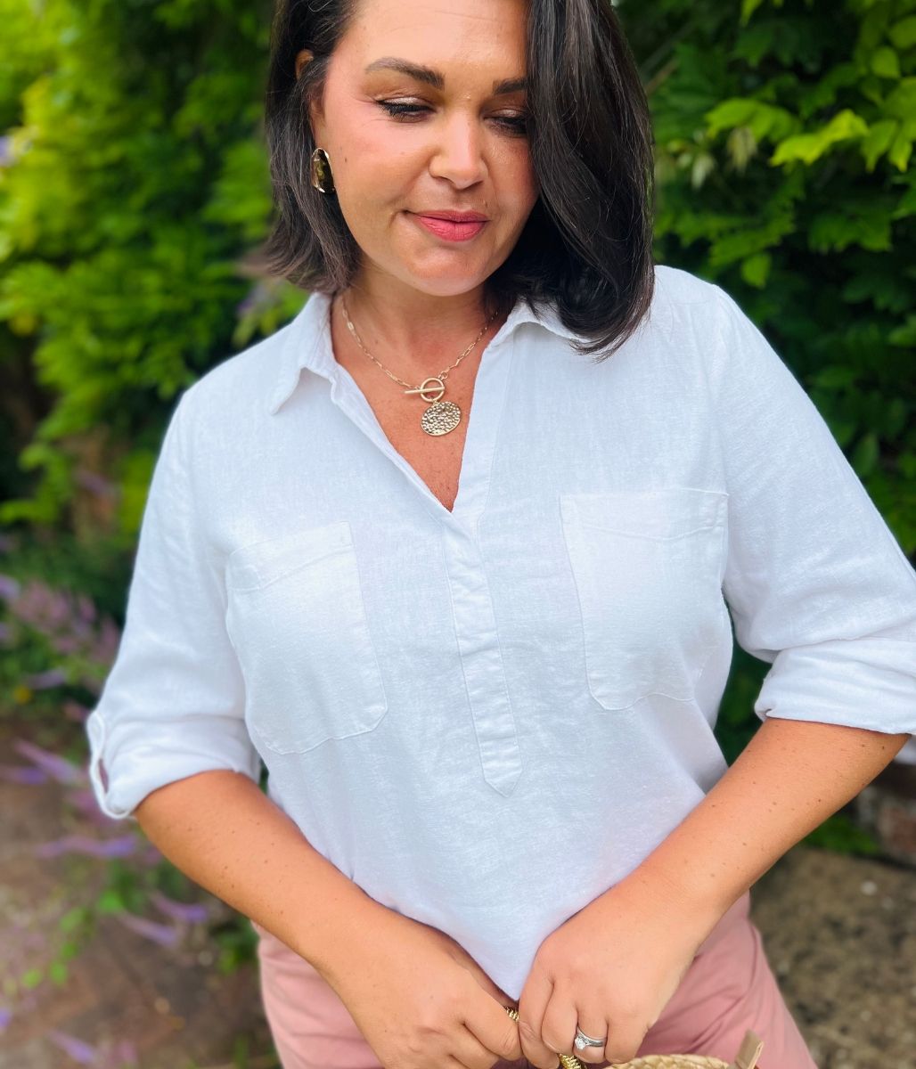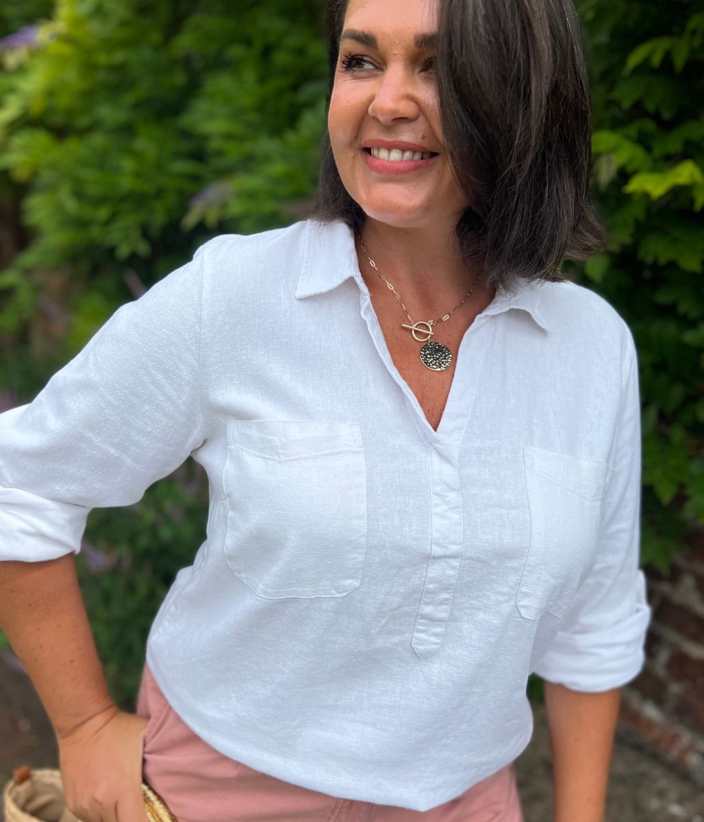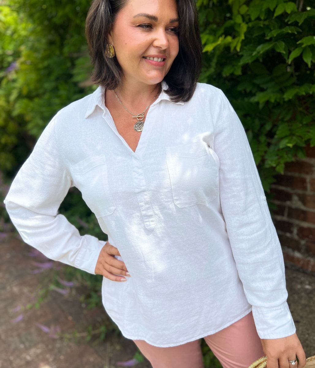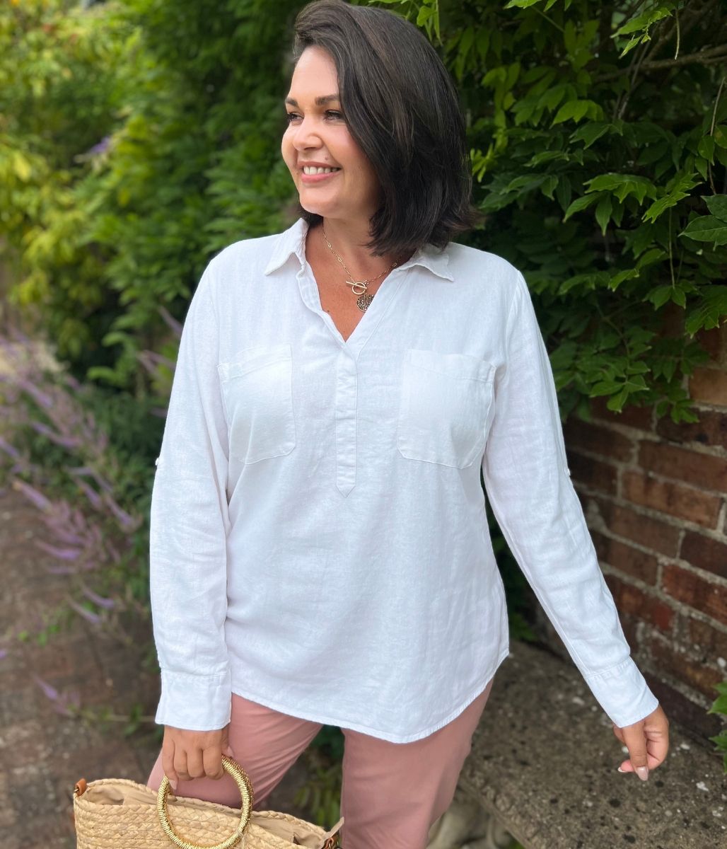 This popover blouse is a lightweight choice on warmer days. Crafted in an easy relaxed fit from a linen blend to create an airy feel. Comfy rolled sleeved design which can be worn at full length too, a v-neckline for a flattering aesthetic and twin chest pockets. Complete with a feminine curved hem.