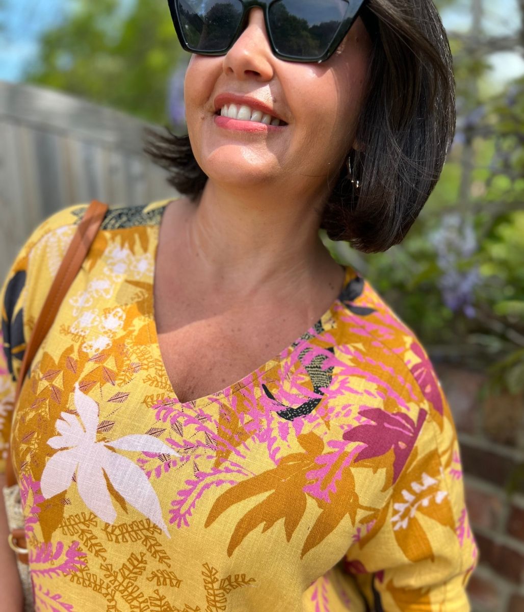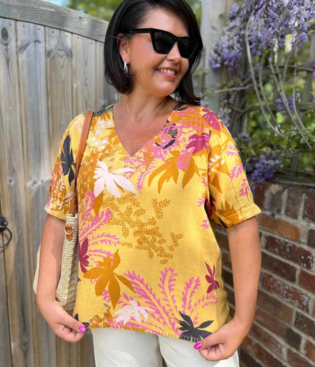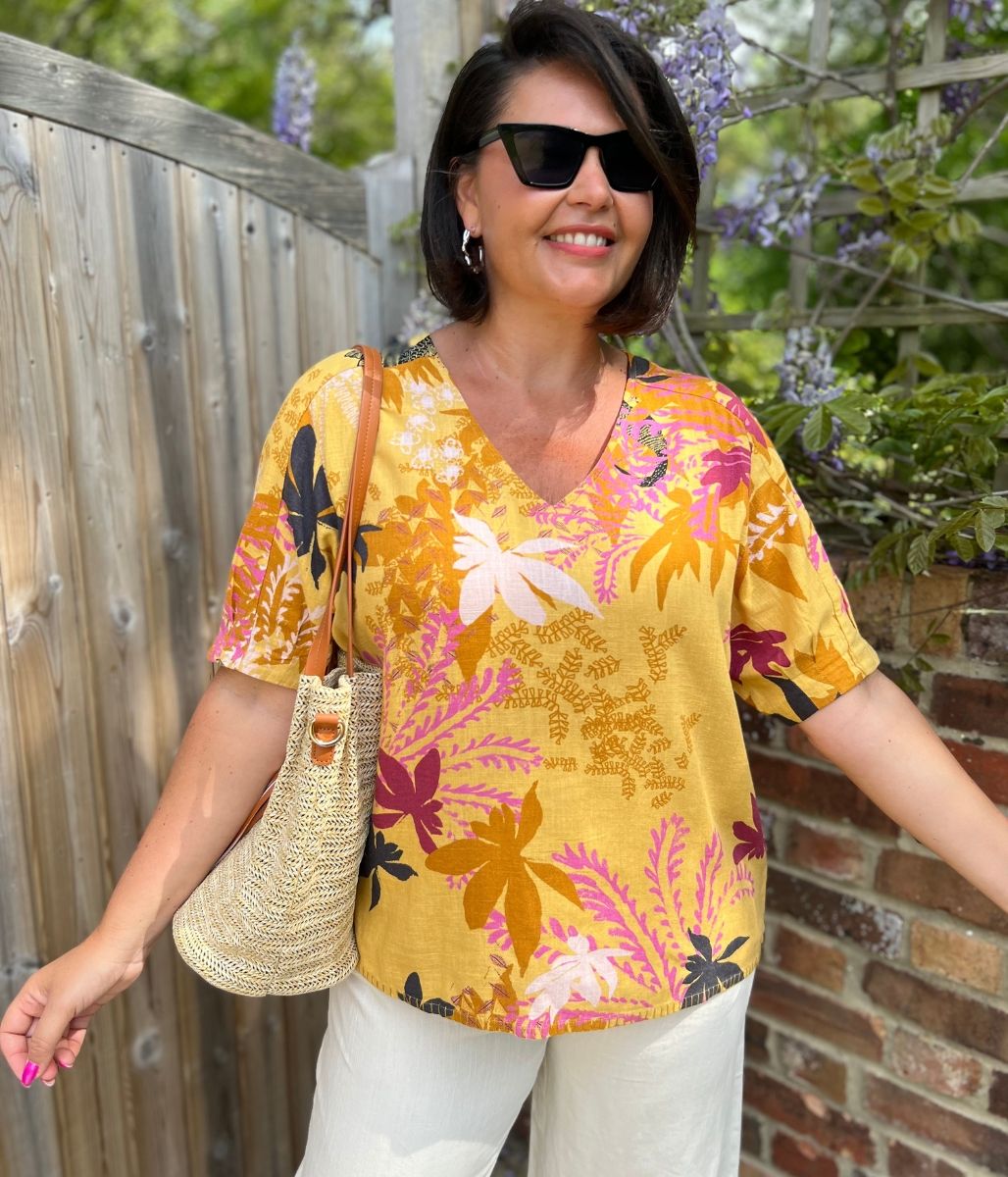 Stay effortlessly stylish and cool in this linen blend top. Made with a breezy linen blend and featuring a bold print, this top radiates a relaxed vibe with its v neck shape. Perfect for your summer plans!
