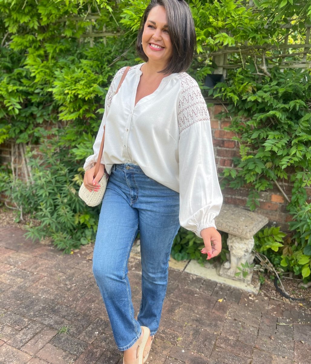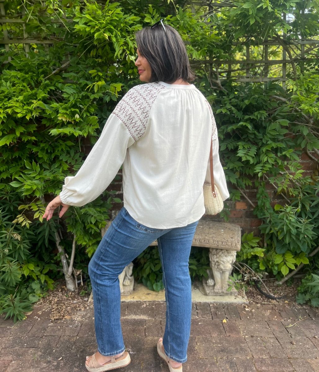 Featuring a stylish notch neck and eye-catching embroidered design. The balloon sleeves with elasticated cuffs add a touch of elegance while ensuring comfort and ease of movement. A button-front closure and relaxed fit make this blouse perfect for both casual outings and sophisticated occasions.