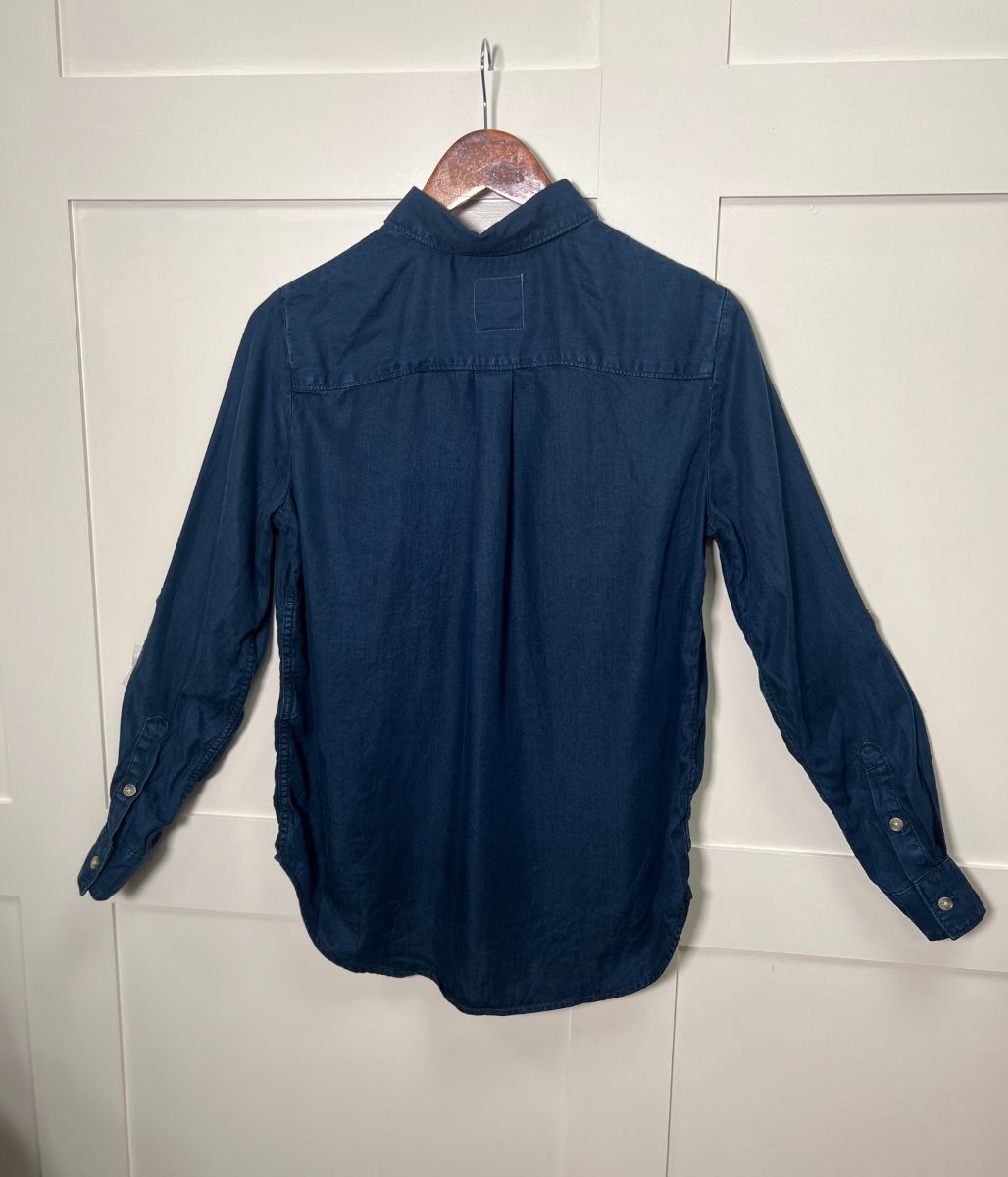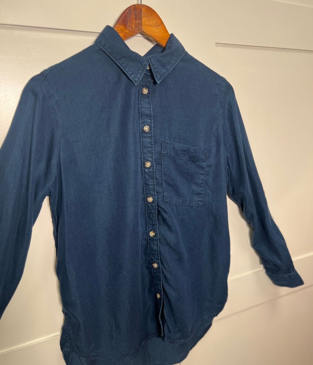 An everyday shirt in soft lyocell denim with a collar, buttons down the front and an open chest pocket. With a box pleat at the back, gently dropped shoulders and long sleeves with button cuffs. Finished with a rounded hem.
