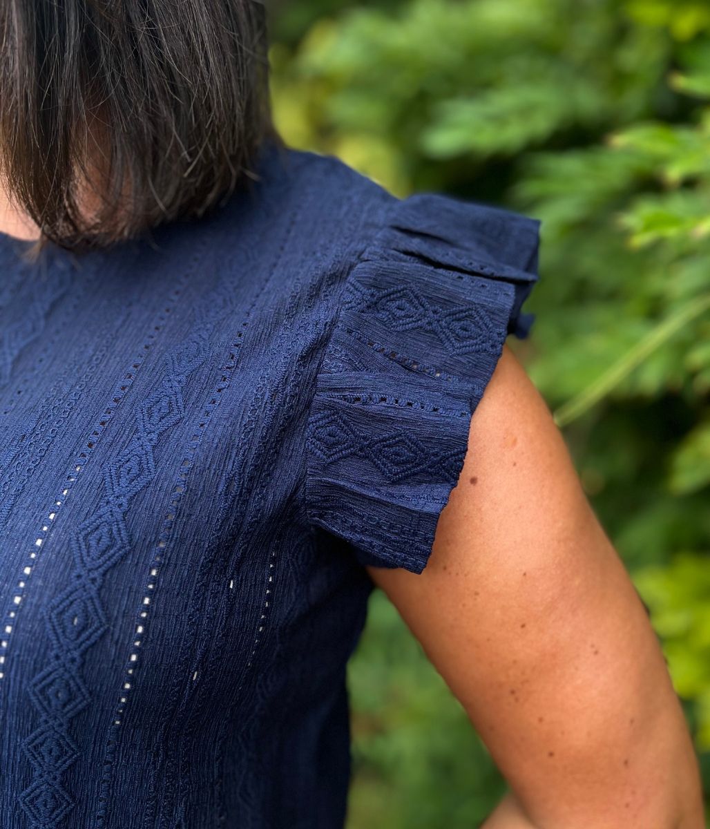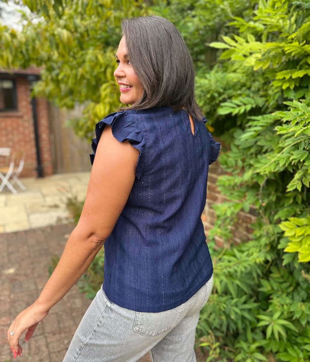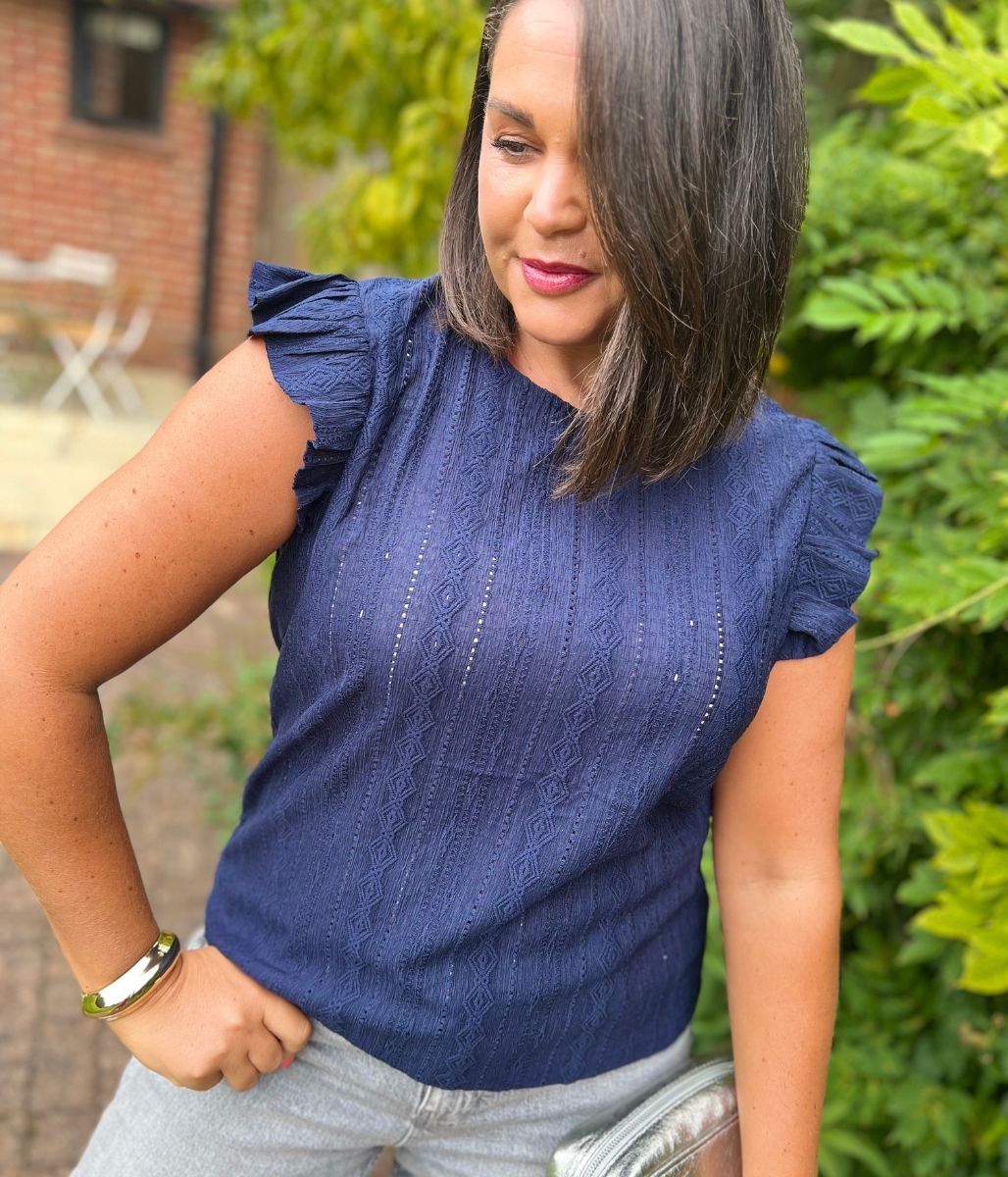 Add elegance to your staples with this simple yet stunning top. Designed in a broderie embroidered fabric, it has a crew neckline and frill details on the sleeves. Made with added stretch for everyday comfort.
