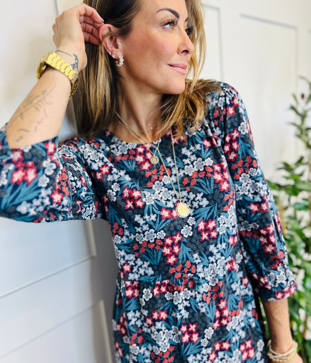 The tiered, A-line shape of this above-the-knee dress is given a gentle swing with soft gathers and breathable organic cotton jersey. The easy-to-wear print is perfect for summer days by the sea, and can be styled with tights and knitwear as the weather cools.
