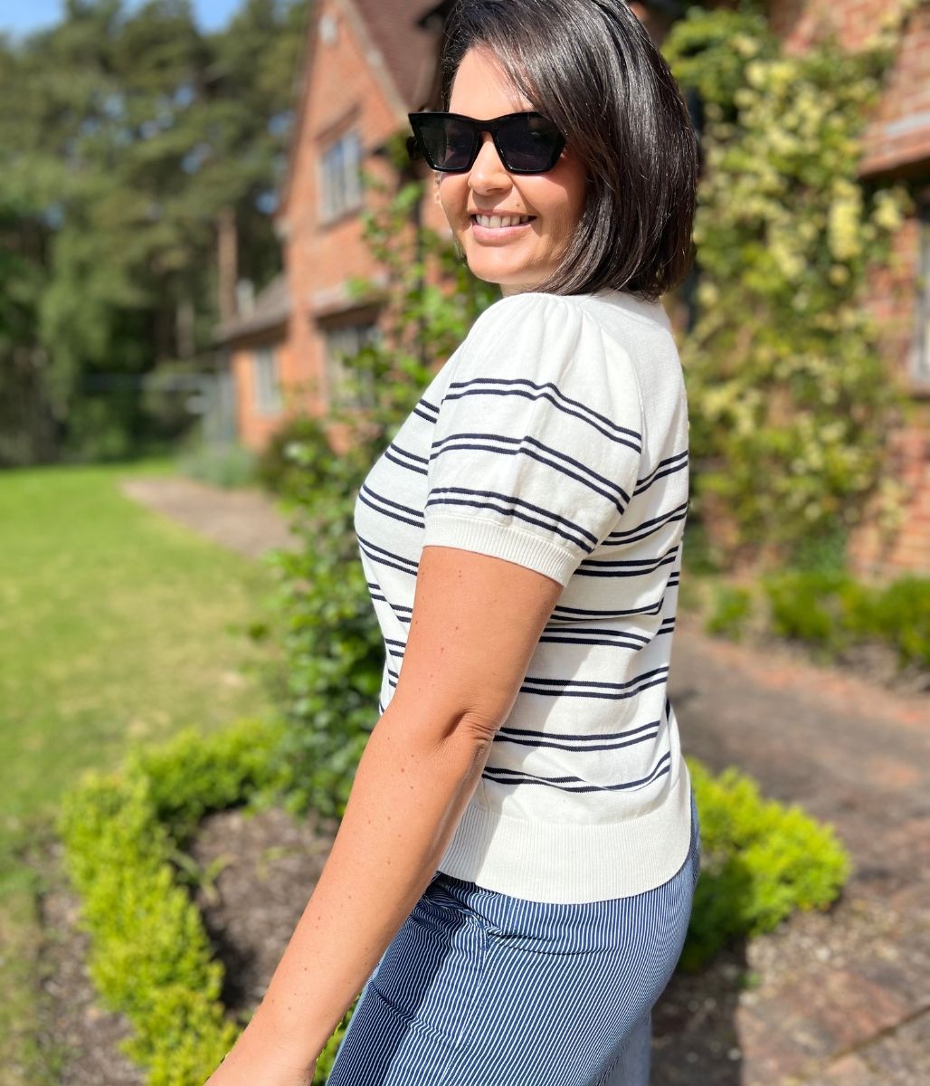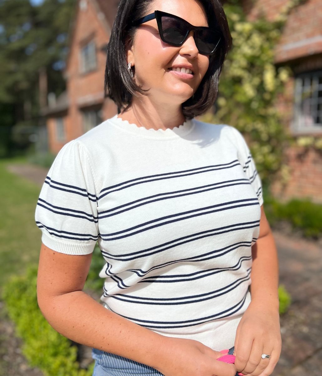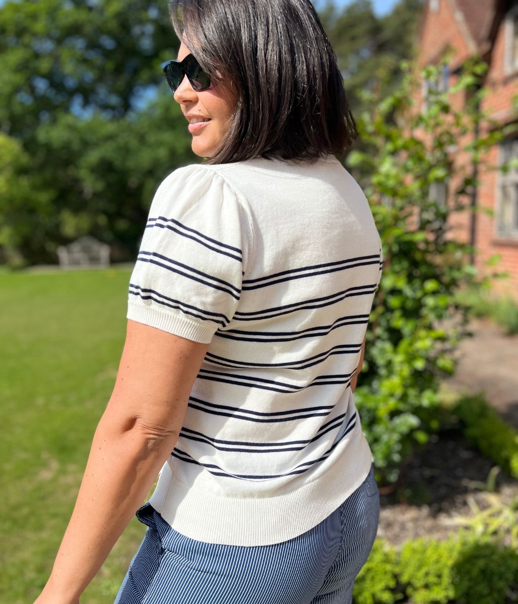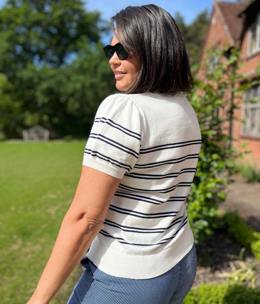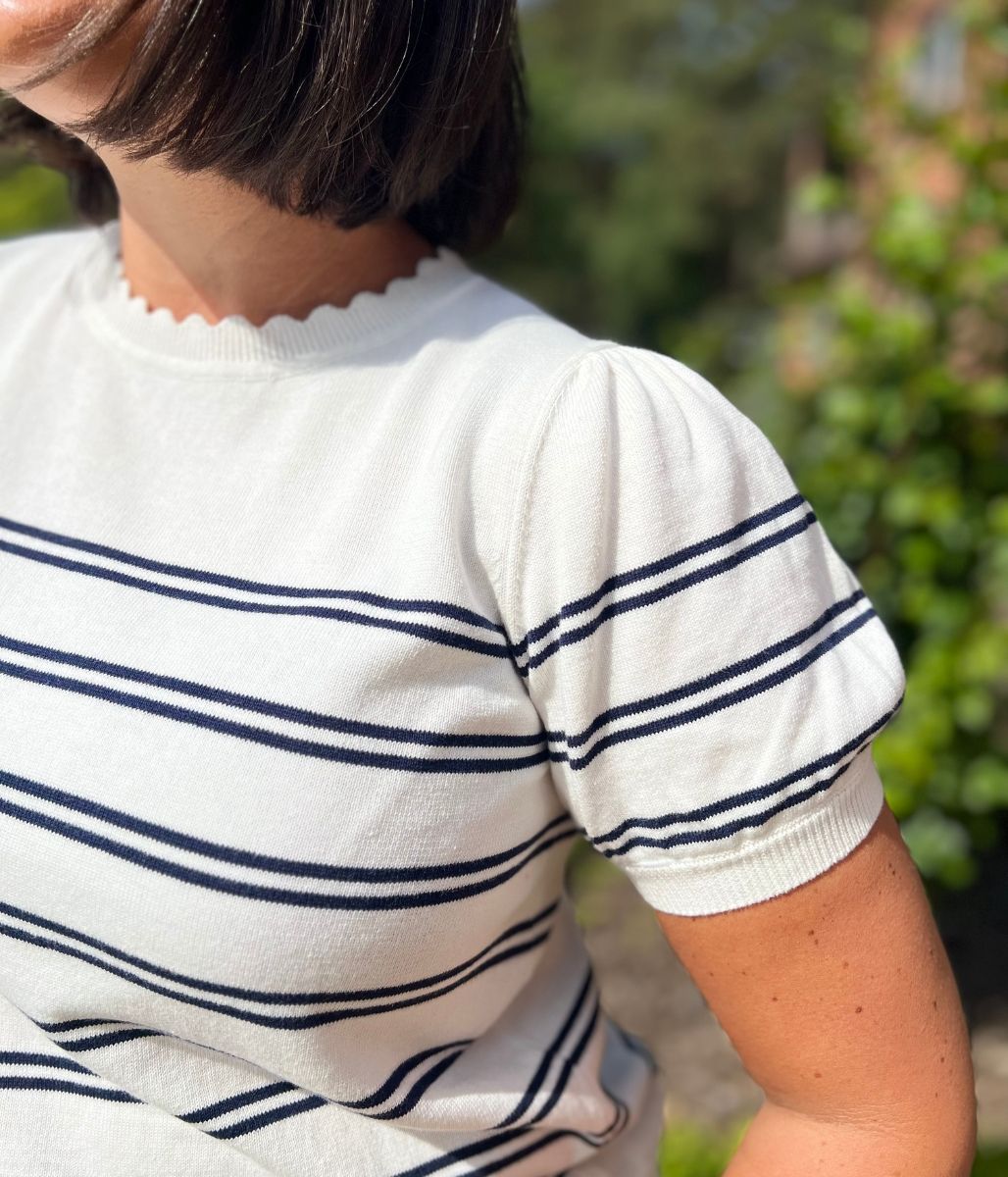 The Sola knitted short-sleeve jumper in white and navy stripes. Taking style notes from the coast, we love the heritage stripes and scallop collar. With added puff sleeves for a feminine touch, along with cosy ribbed hems and a crossed oars embroidered neatly on the hem. You won’t go wrong pairing this with denim