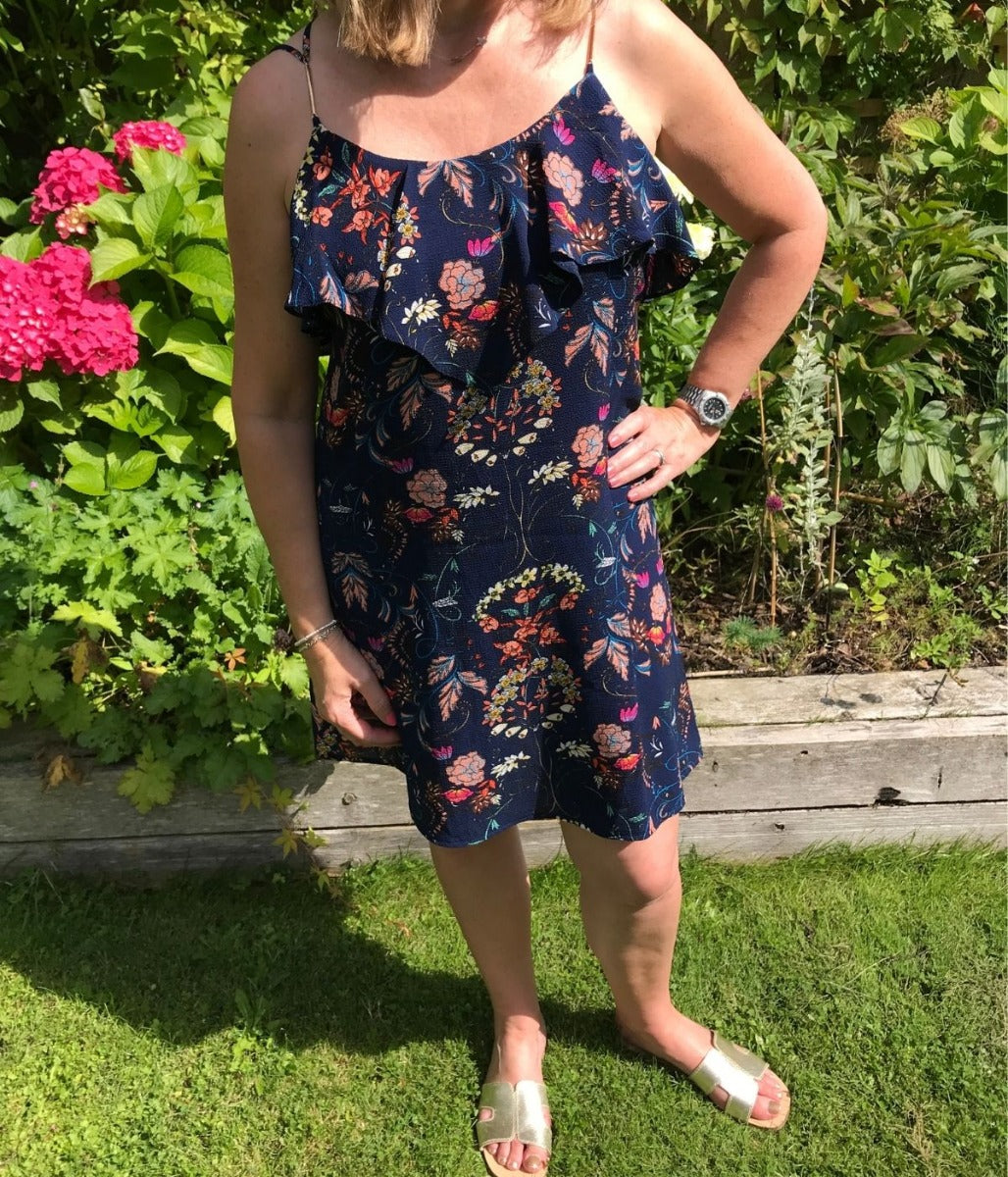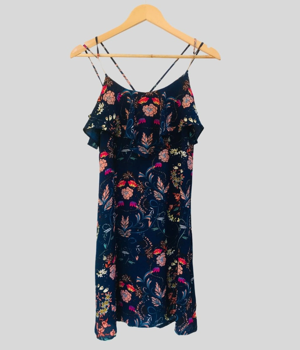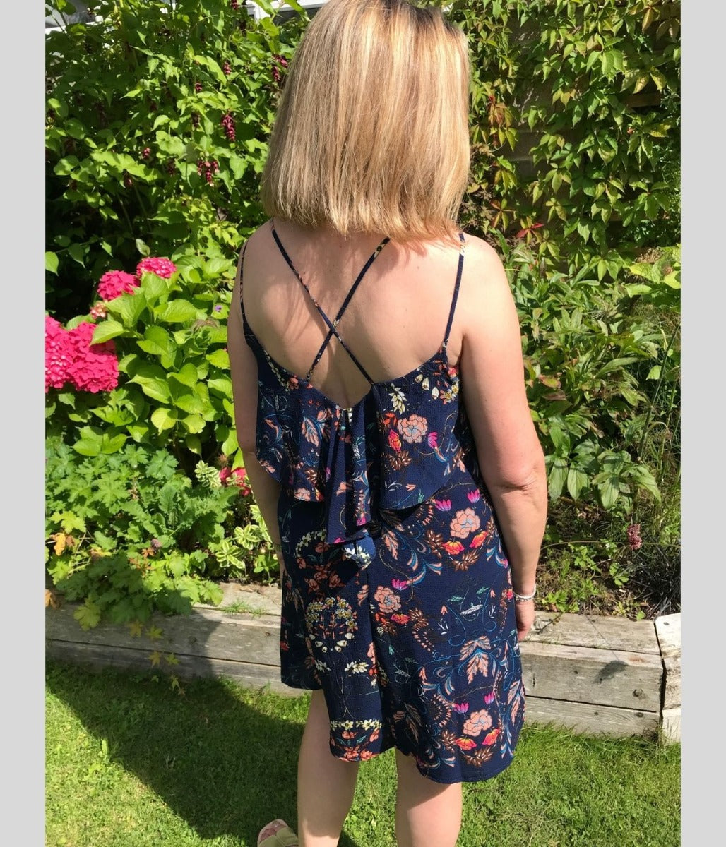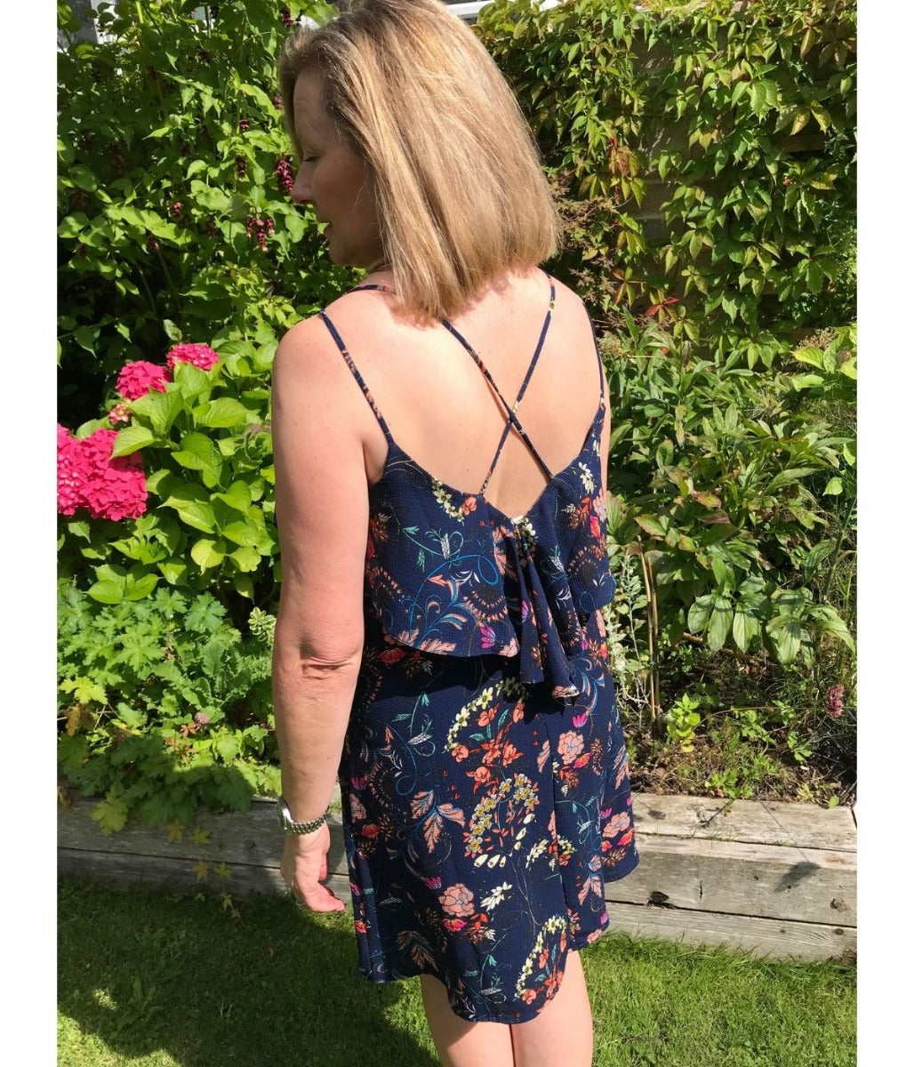 We love the strappy back on this pretty shift dress. Flattering front frill and a loose cool fitting.Did we mention the gorgeous print?