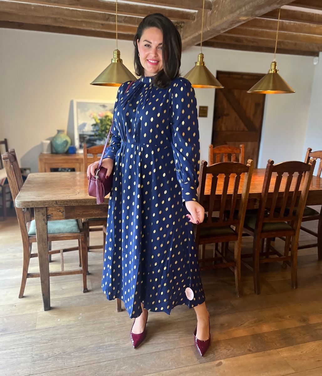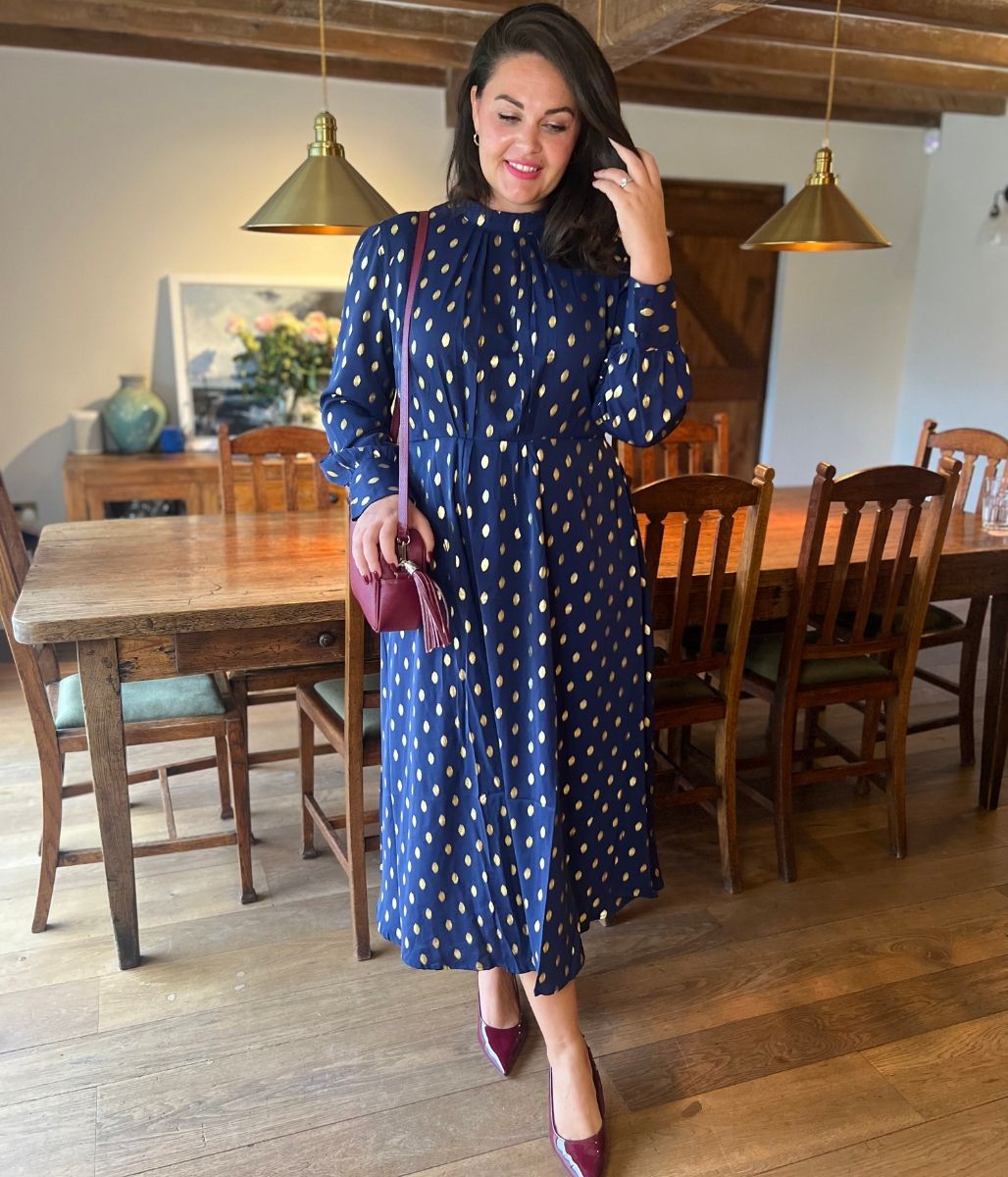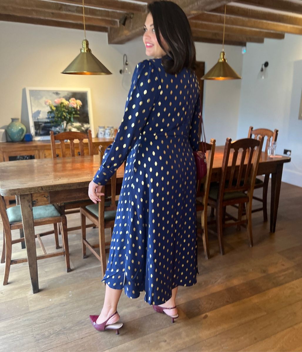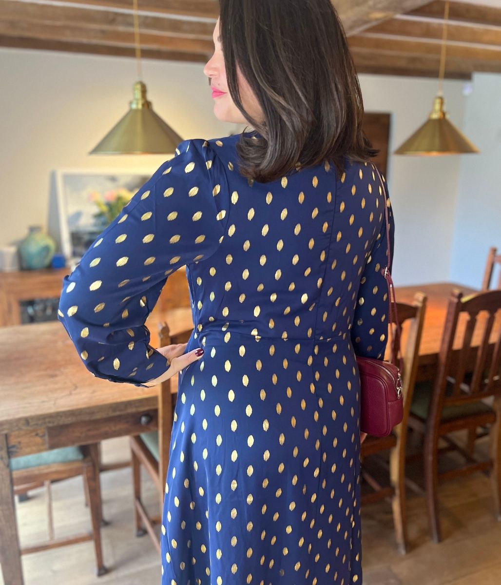 This dress showcases a stunning gold foil dot print on a pleated skirt, combining elegance and a touch of sparkle. A sophisticated silhouette with a fitted bodice and a flowing pleated skirt, creating a flattering and feminine shape. Ideal for special occasions such as holiday parties, evening events, or weddings, this dress captures the light beautifully, making it perfect for standing out in a crowd. Its timeless design ensures it remains a versatile piece for both formal and semi-formal settings.