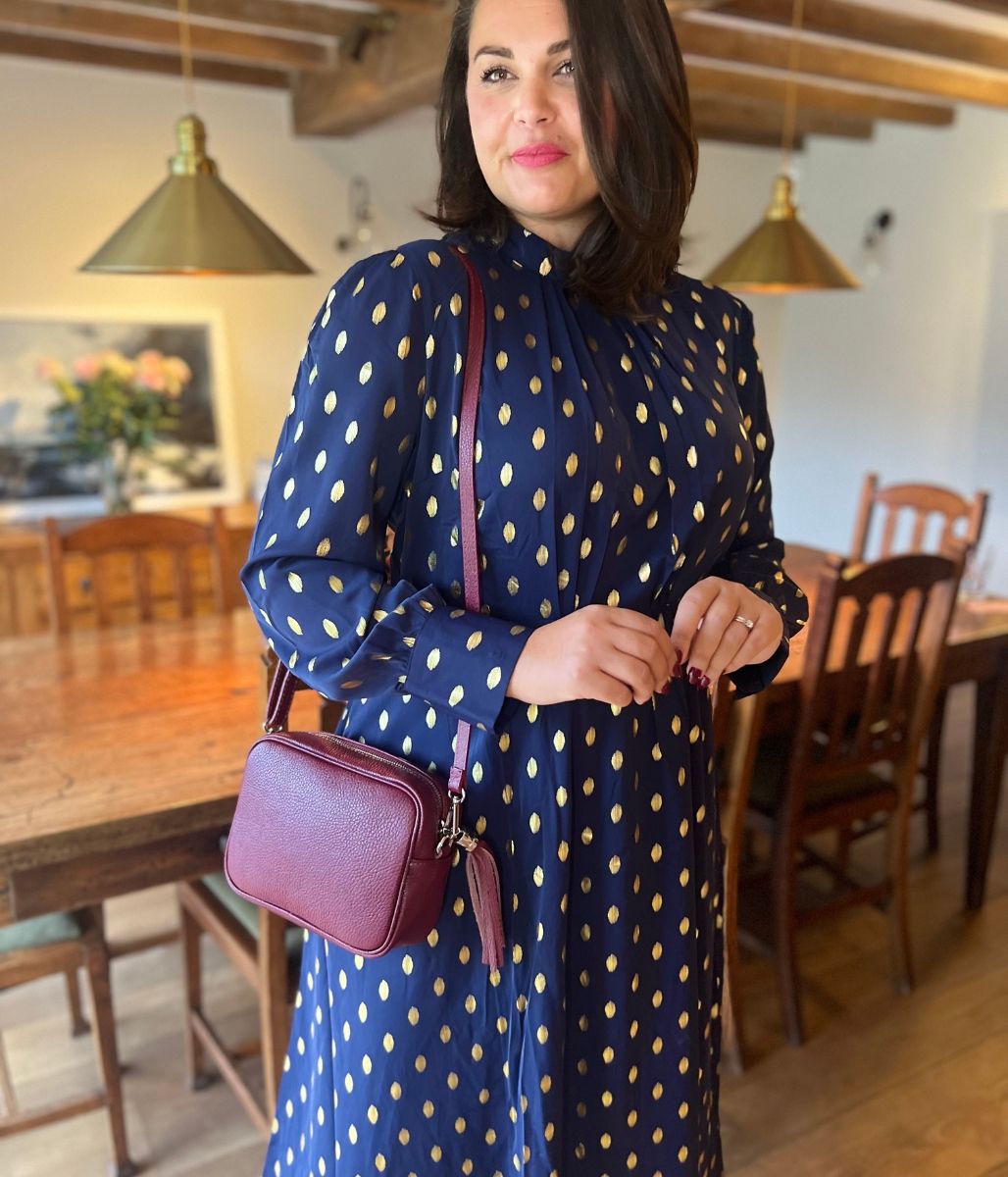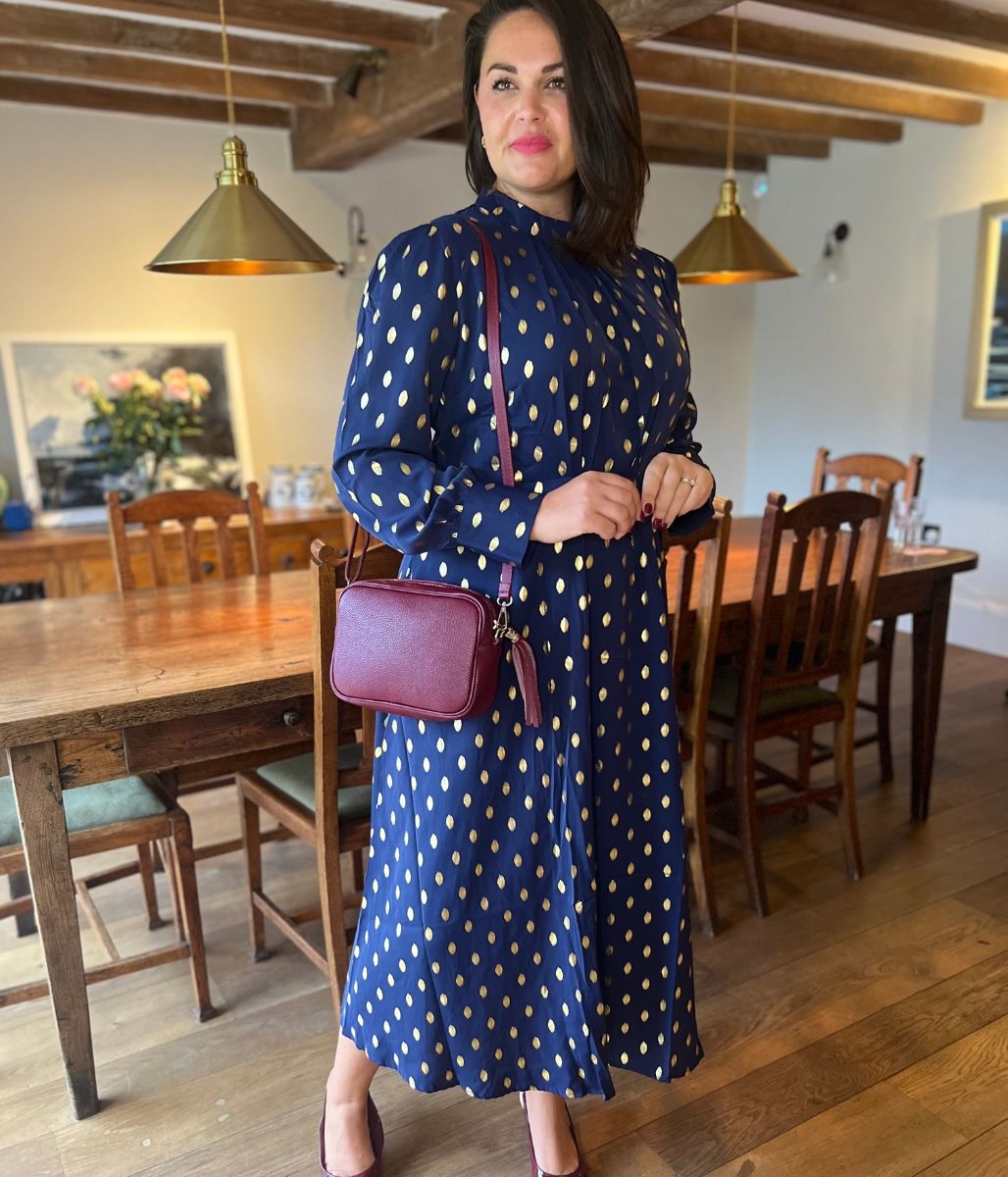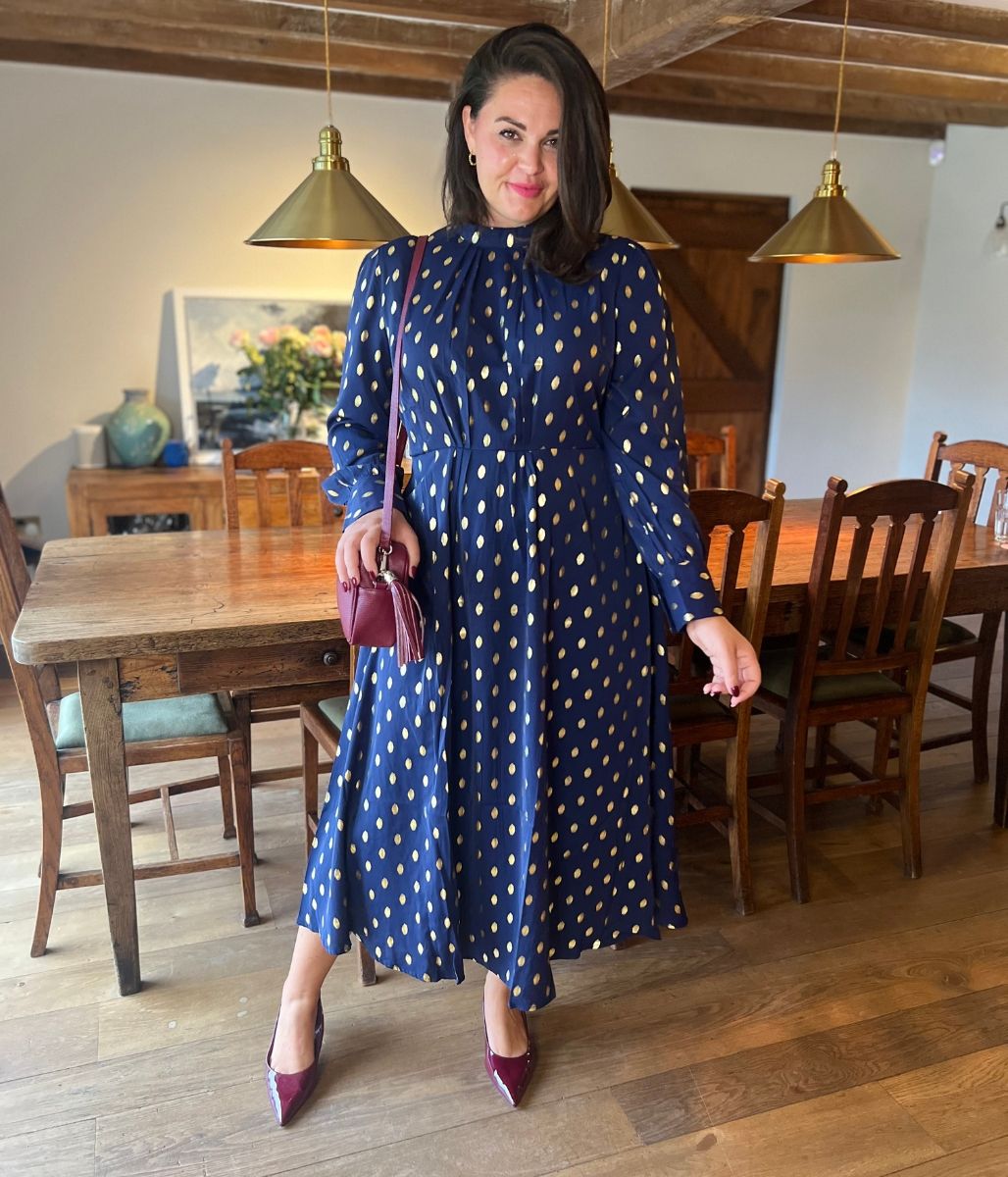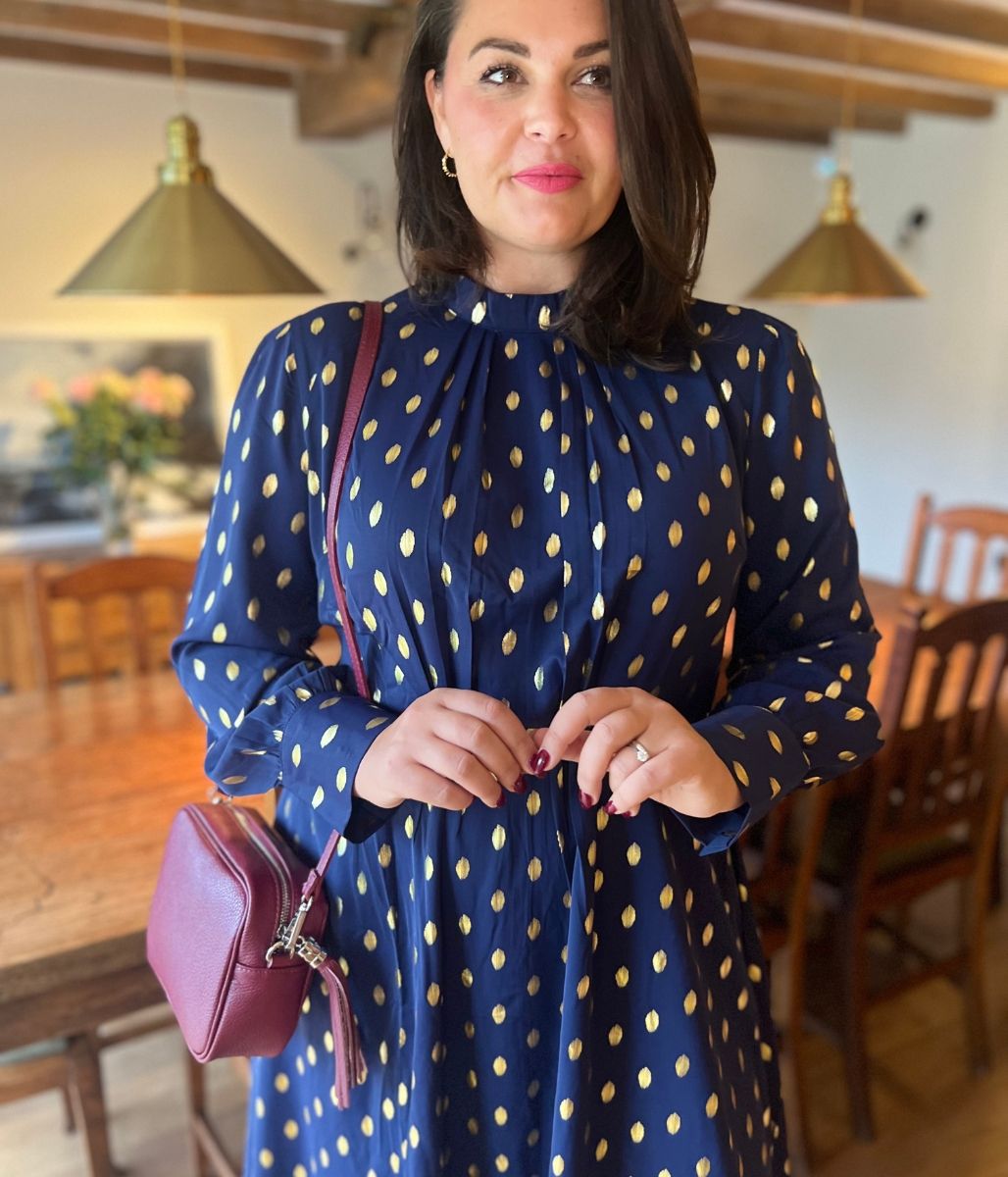 This dress showcases a stunning gold foil dot print on a pleated skirt, combining elegance and a touch of sparkle. A sophisticated silhouette with a fitted bodice and a flowing pleated skirt, creating a flattering and feminine shape. Ideal for special occasions such as holiday parties, evening events, or weddings, this dress captures the light beautifully, making it perfect for standing out in a crowd. Its timeless design ensures it remains a versatile piece for both formal and semi-formal settings.