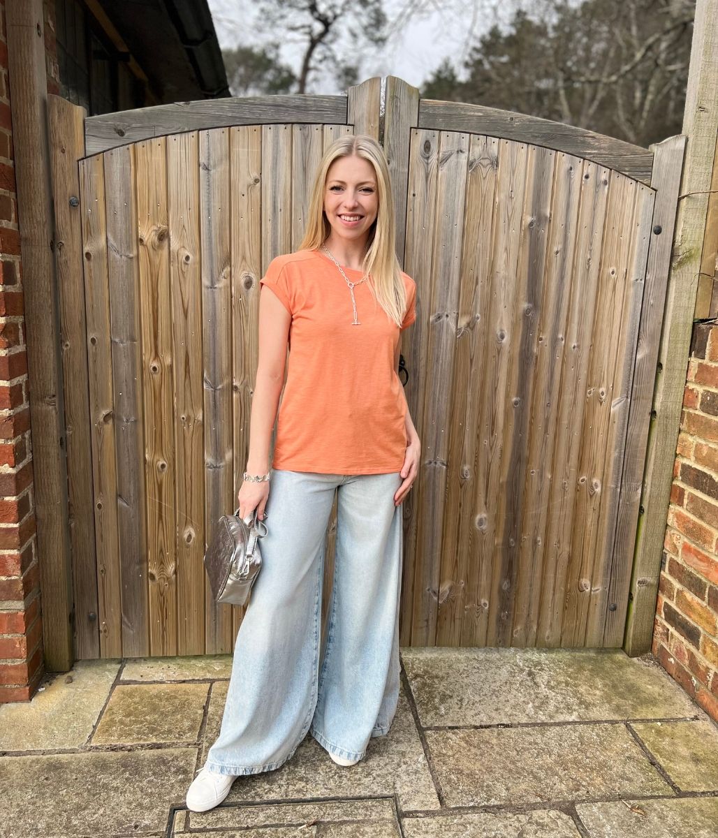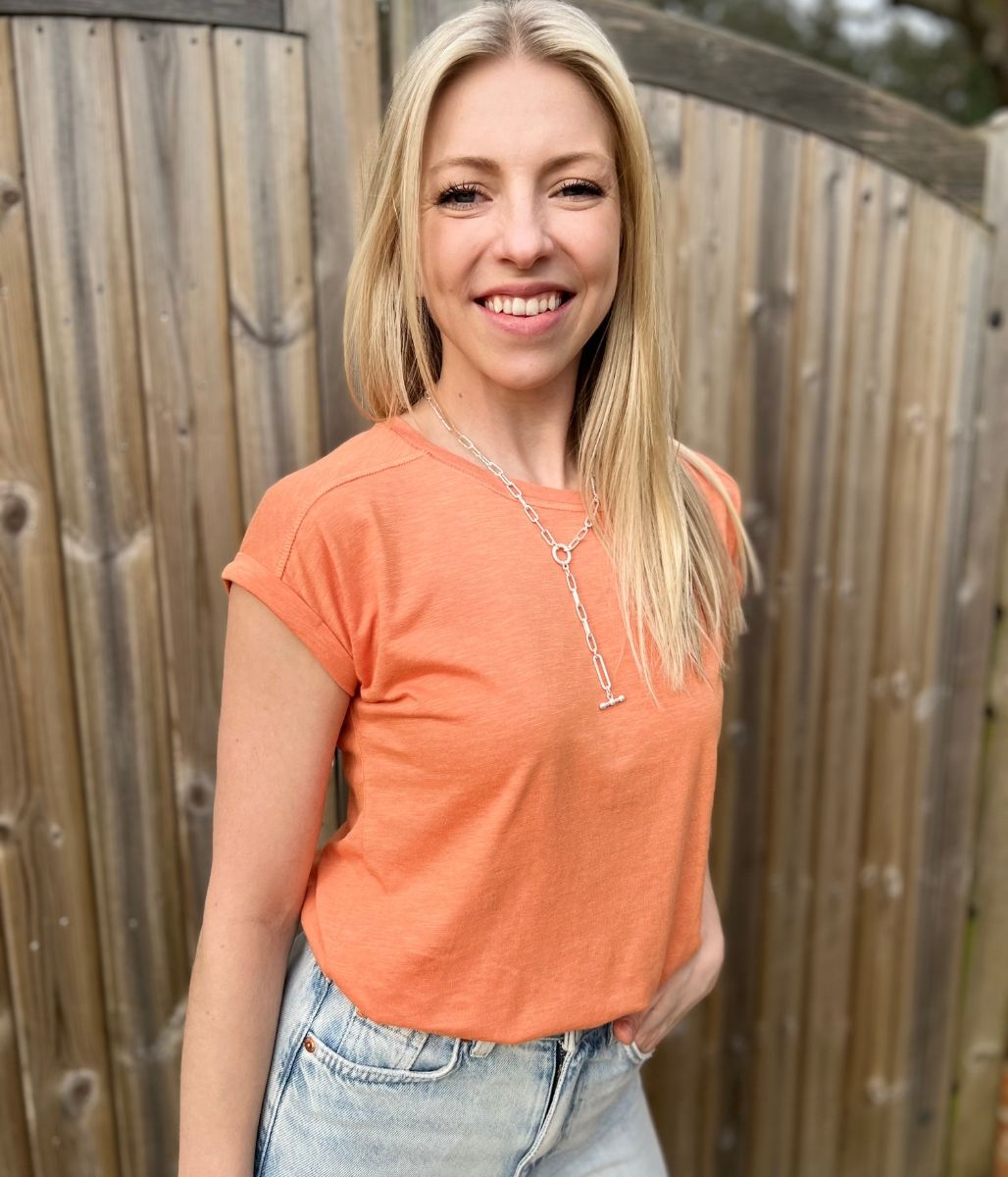 This plain t-shirt is crafted from a soft cotton blend fabric and features capped sleeves, seam detail and a crew neckline. Pair with jeans and trainers for an easy, everyday look.