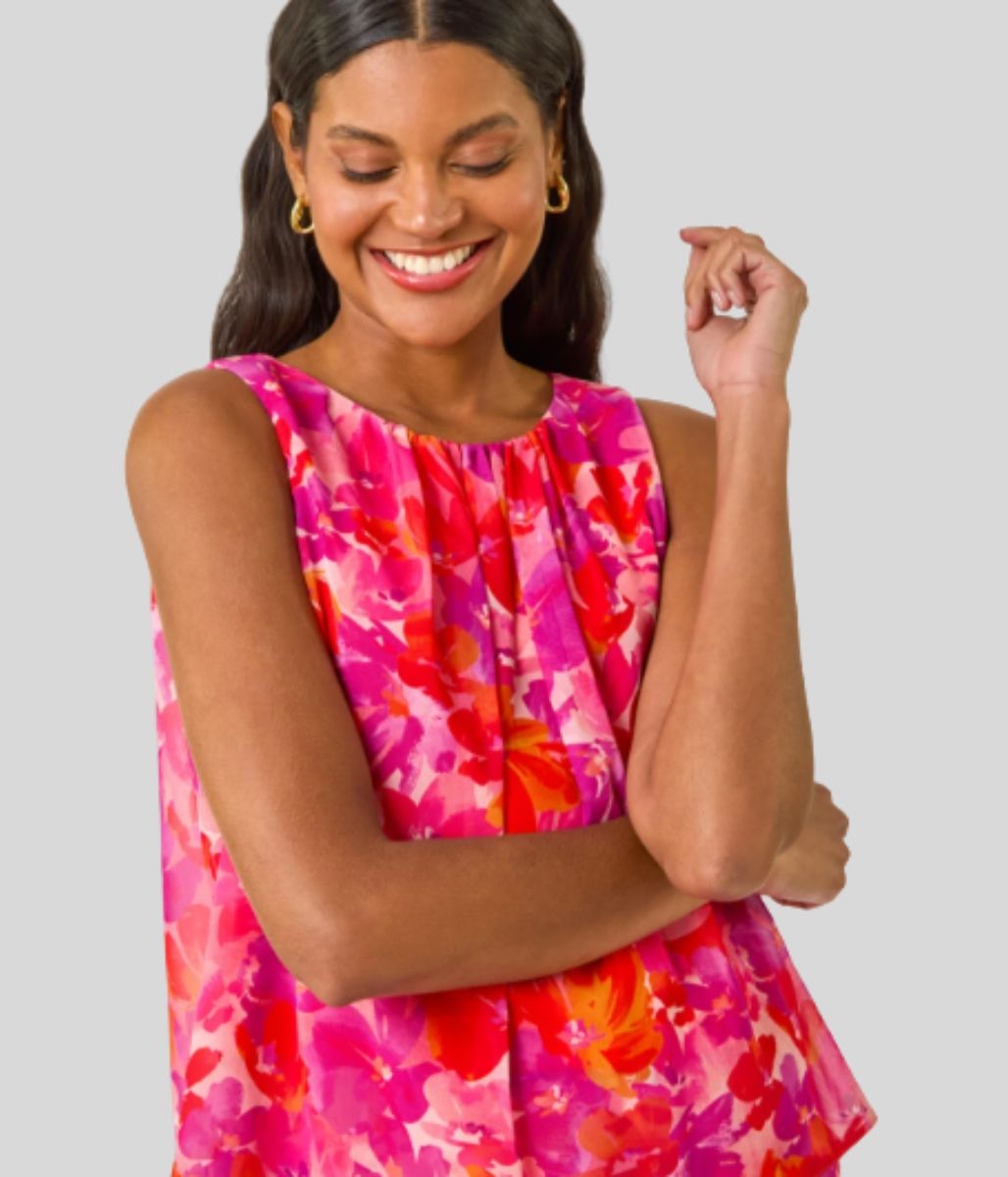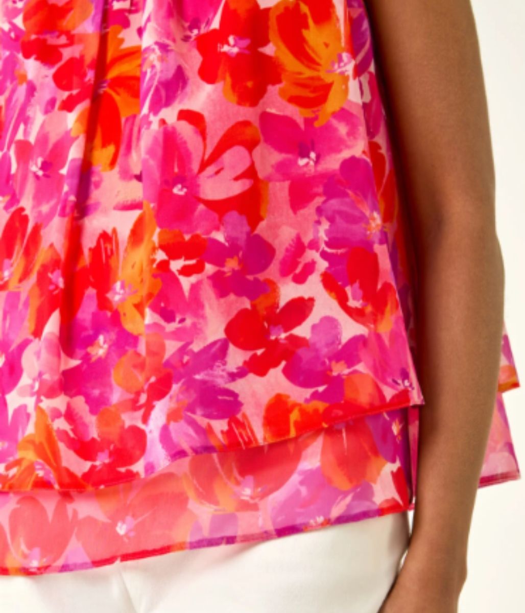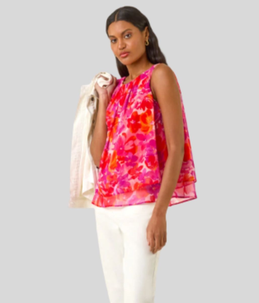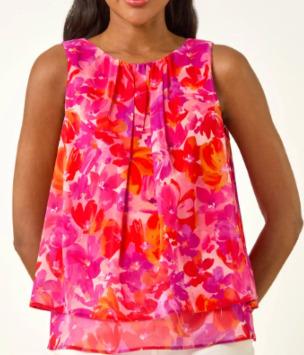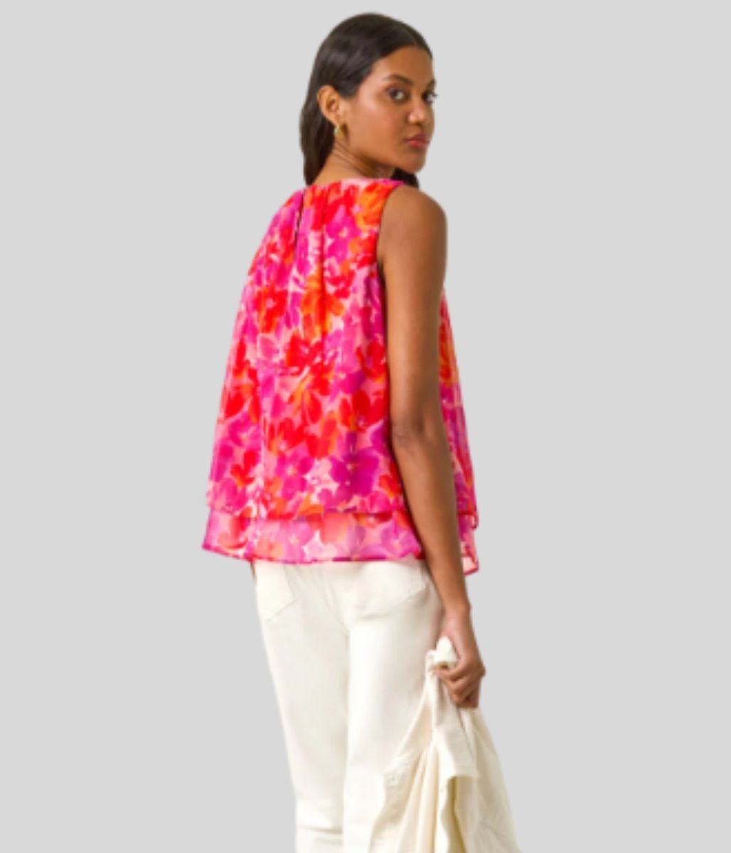 Floral lovers, rejoice with this lovely double-layered pleated top. Covered in a charming floral print, this sleeveless piece features elegant pleating at the neckline and a flattering double-layer hem. Designed with a classic round neck, this top is perfect for adding a touch of femininity to your outfit. Pair it with jeans and sandals for an effortlessly chic and casual look that's perfect for sunny days out!
