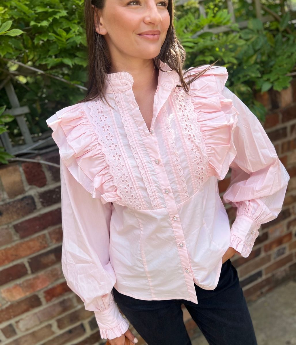 This pretty blouse features elegant puff sleeves that gather into delicate frilled cuffs for a feminine touch. The ruffle shoulder detail adds drama, while the Broderie Anglais lace trim enhances its timeless charm. Finished with micro pearl detail buttons, this blouse makes a graceful statement on any occasion.