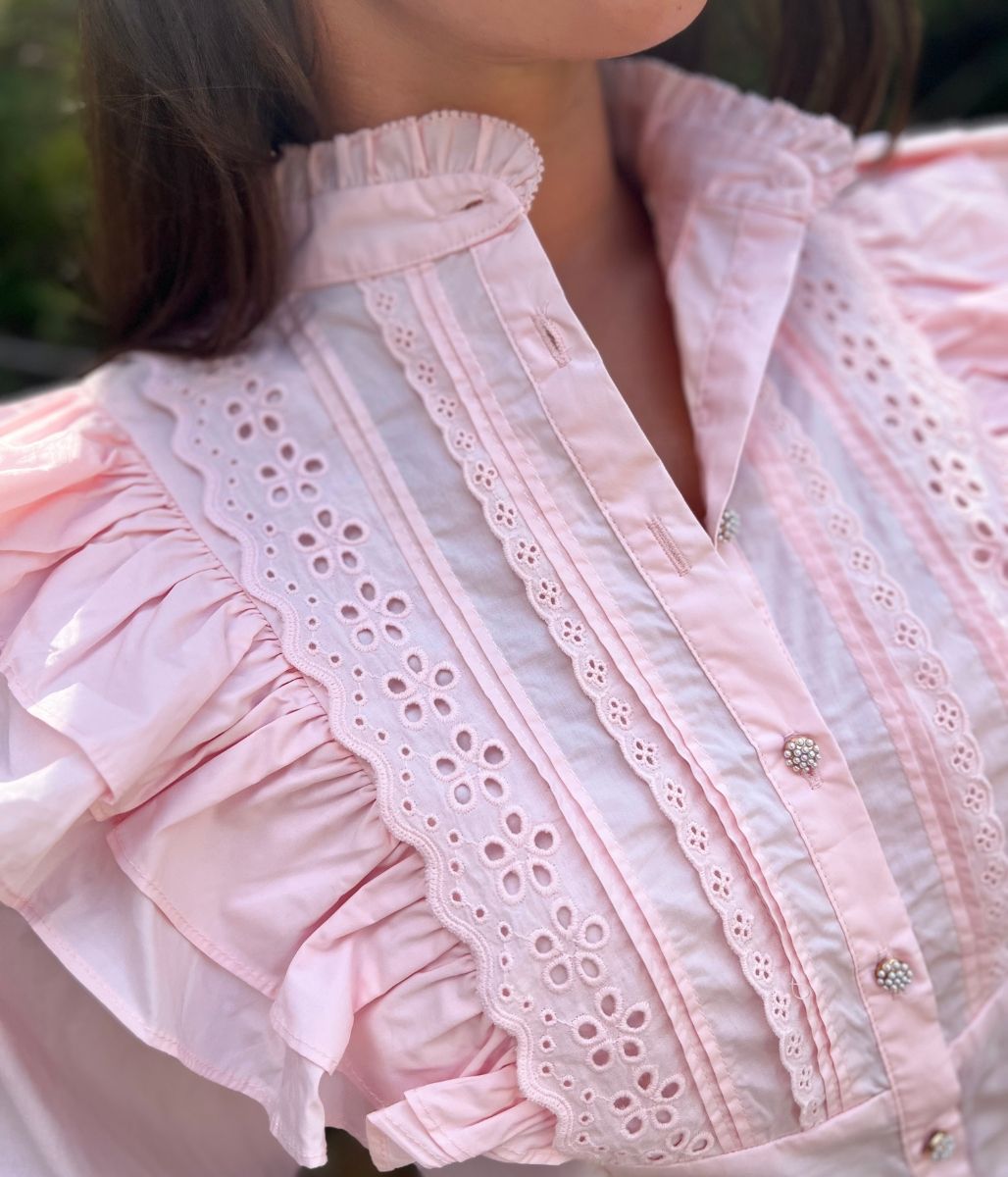 Pink Ruffle Broderie Puff Sleeve Blouse