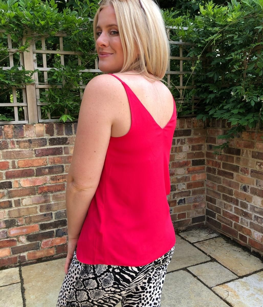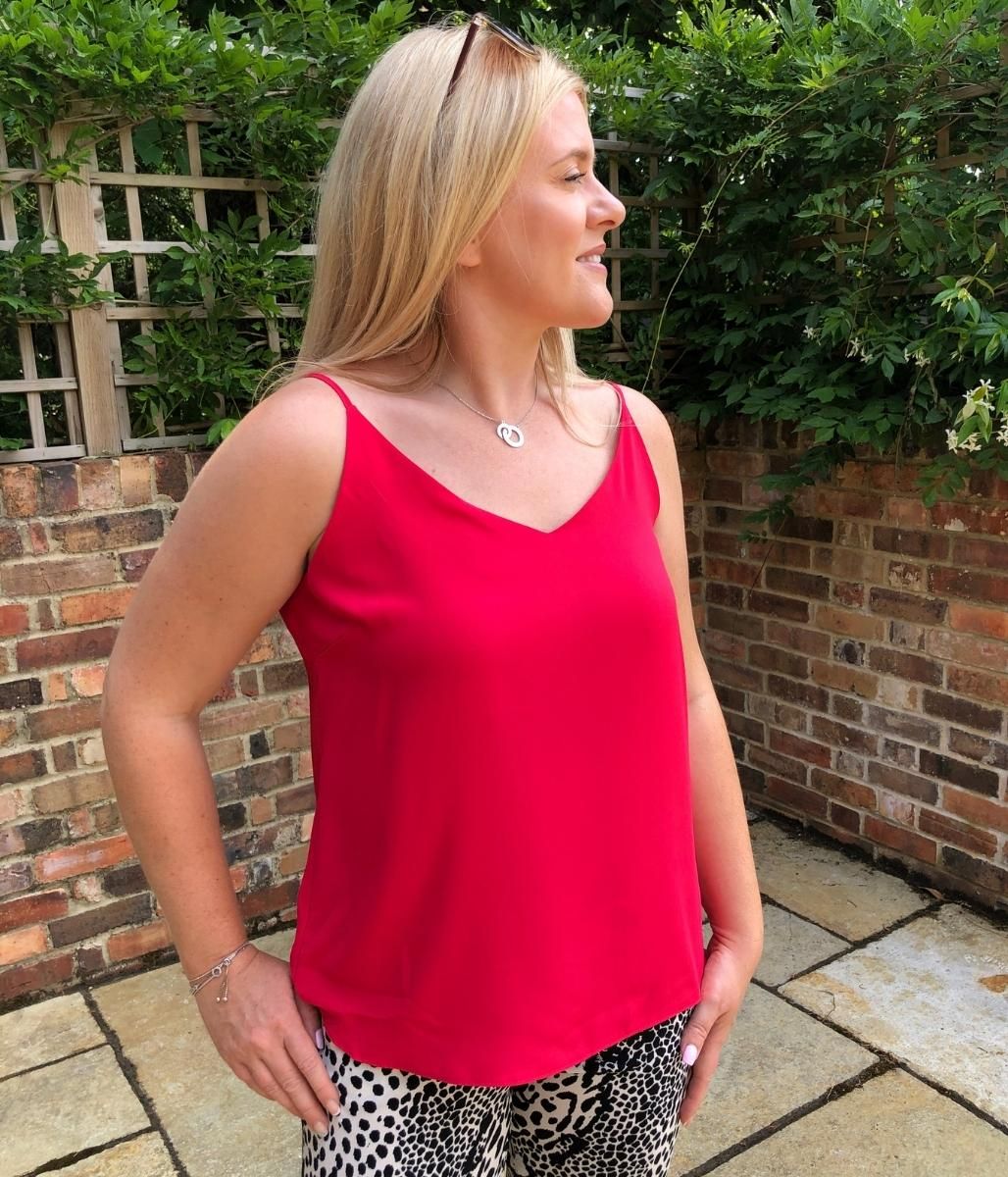 This must-have cami top is perfect for any day! With its v-neck and back cut and beautiful raspberry colour, you can dress up or keep casual to fit your mood. Best of all, this top is perfect for warm weather holidays or just a lovely day outside!