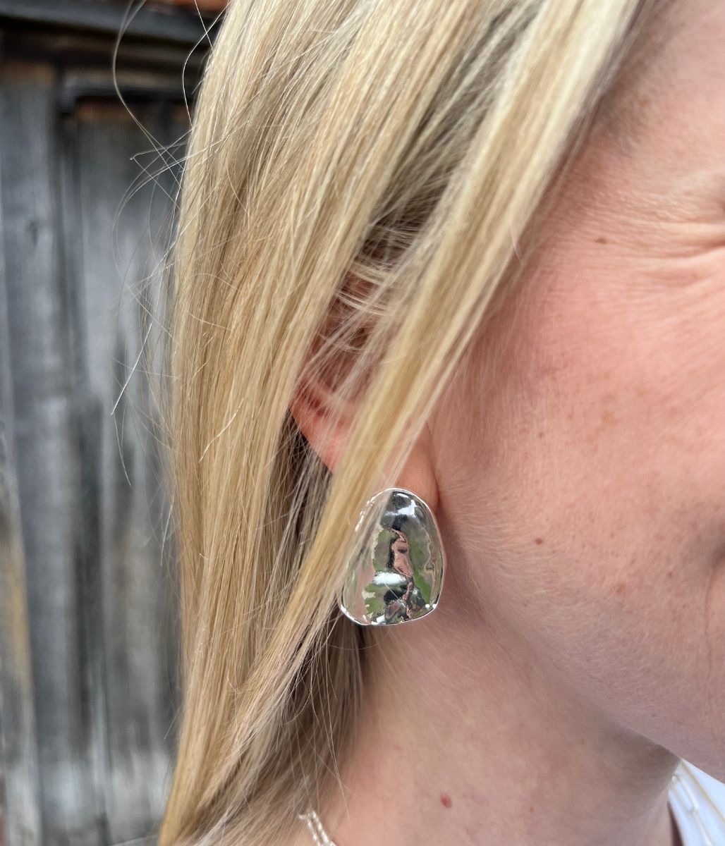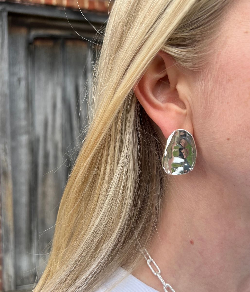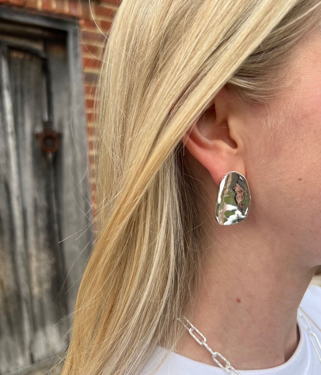 These statement earrings are a contemporary piece of jewellery that features a hammered dome surface.