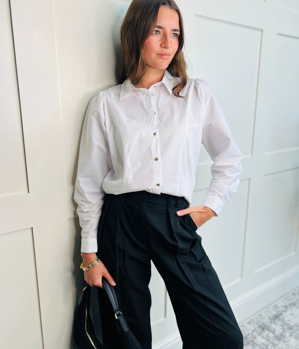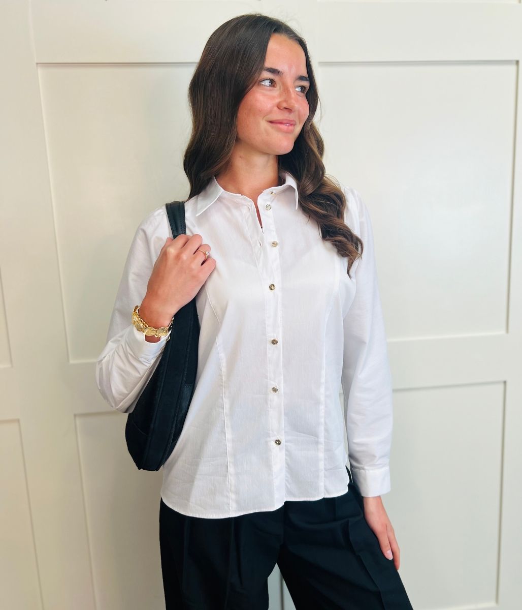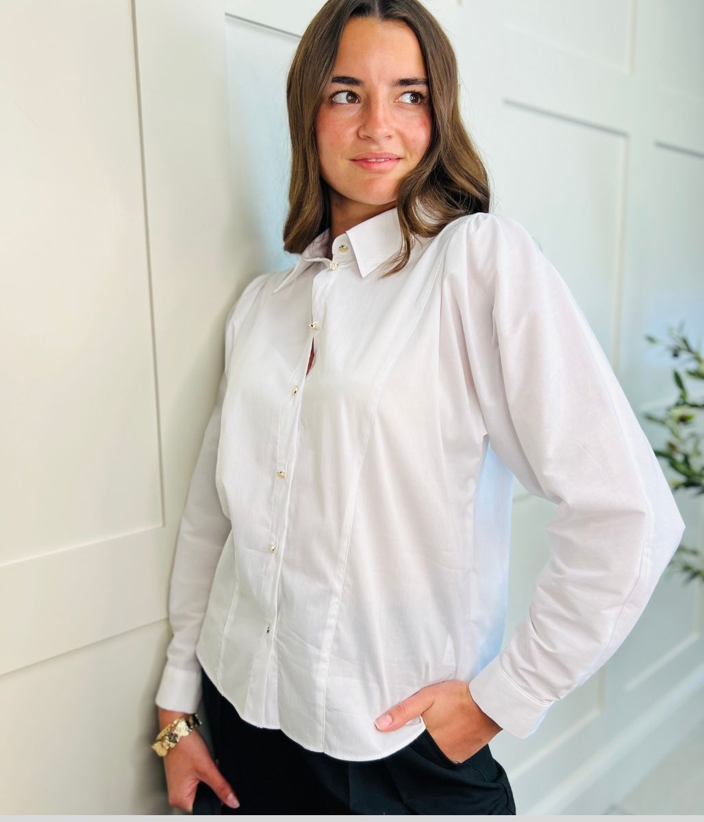 This is the shirt that every woman needs in her wardrobe, smart, comfortable, and goes with everything. Cut with a deep point collar, crisp stretch cotton with puffed batwing sleeve cut into seamed front, finished with gold buttons. Cut in an oversized fit to give a full look when tucked in.
