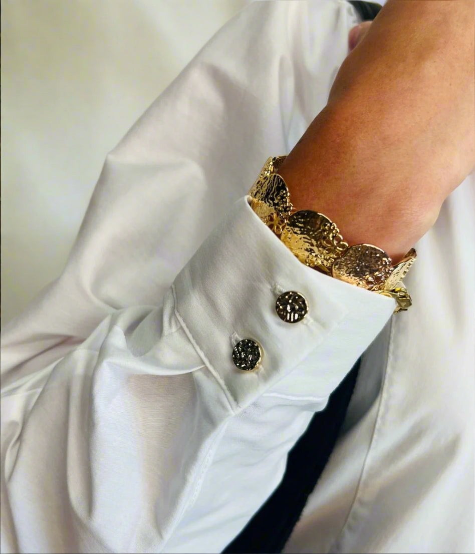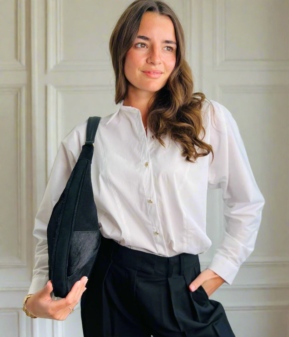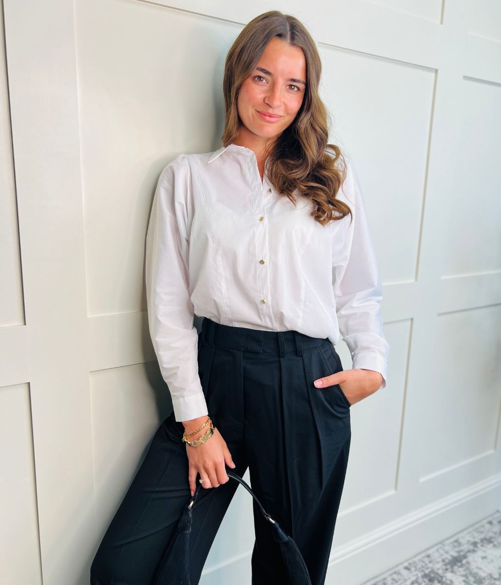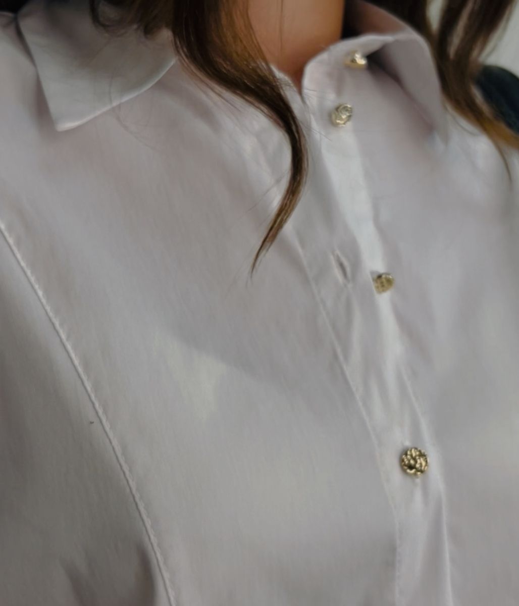 This is the shirt that every woman needs in her wardrobe, smart, comfortable, and goes with everything. Cut with a deep point collar, crisp stretch cotton with puffed batwing sleeve cut into seamed front, finished with gold buttons. Cut in an oversized fit to give a full look when tucked in.
