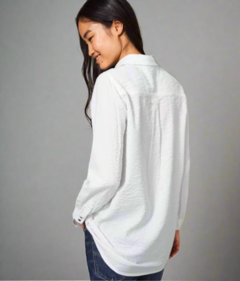 We go to long lengths to keep you feeling comfy and stylish. Literally. A longline tunic with shirt detailing, this popover style top is crafted from a soft seersucker material with a button placket and long sleeves.